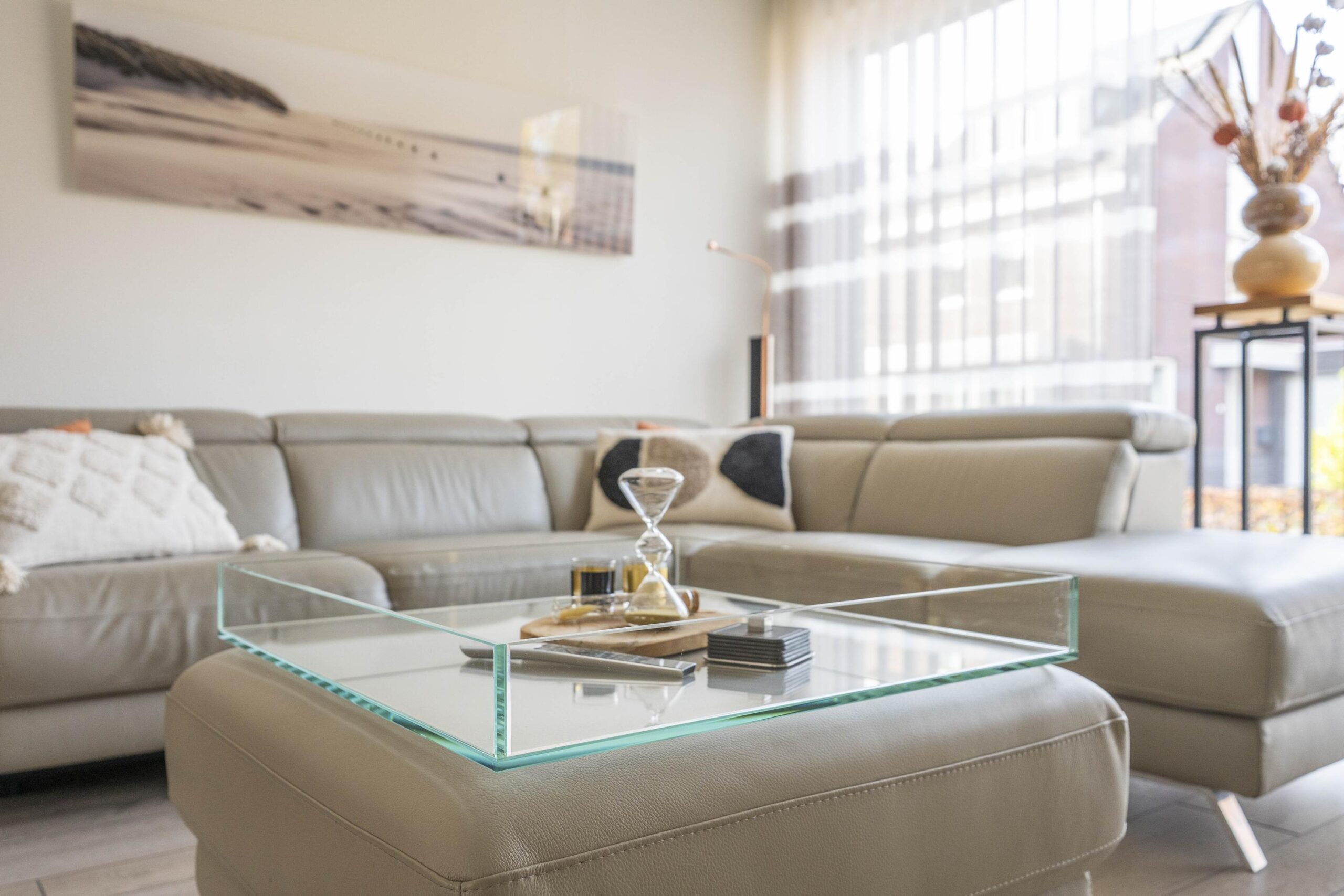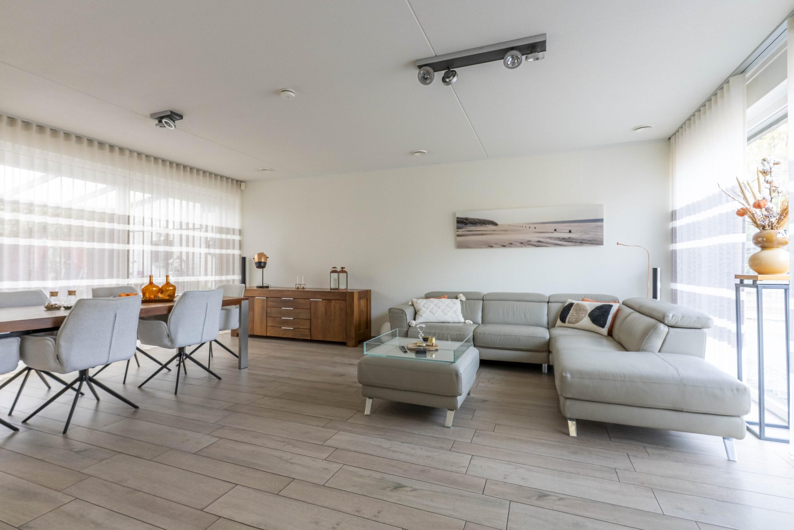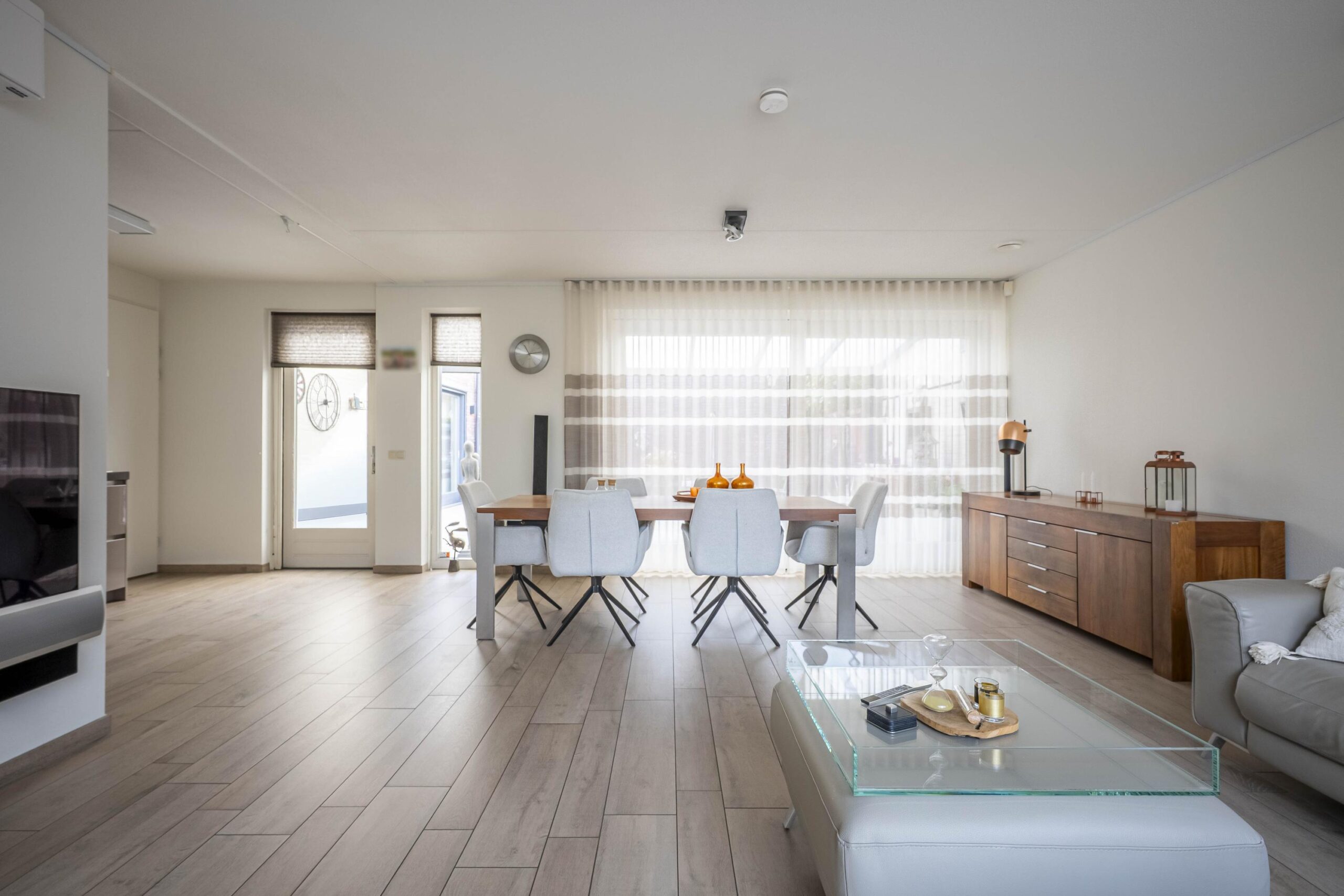 De sfeervolle woonkamer valt op door de grote raampartijen en royale schuifpui, waardoor binnen en buiten moeiteloos in elkaar overlopen. De open hoogglans keuken in hoekopstelling is afgewerkt met een composiet werkblad en glazen achterwand, en uitgerust met inbouwapparatuur zoals een koelkast, inductiekookplaat, rvs-afzuigkap, combimagnetron en vaatwasser. De living is voorzien van een airconditioning.