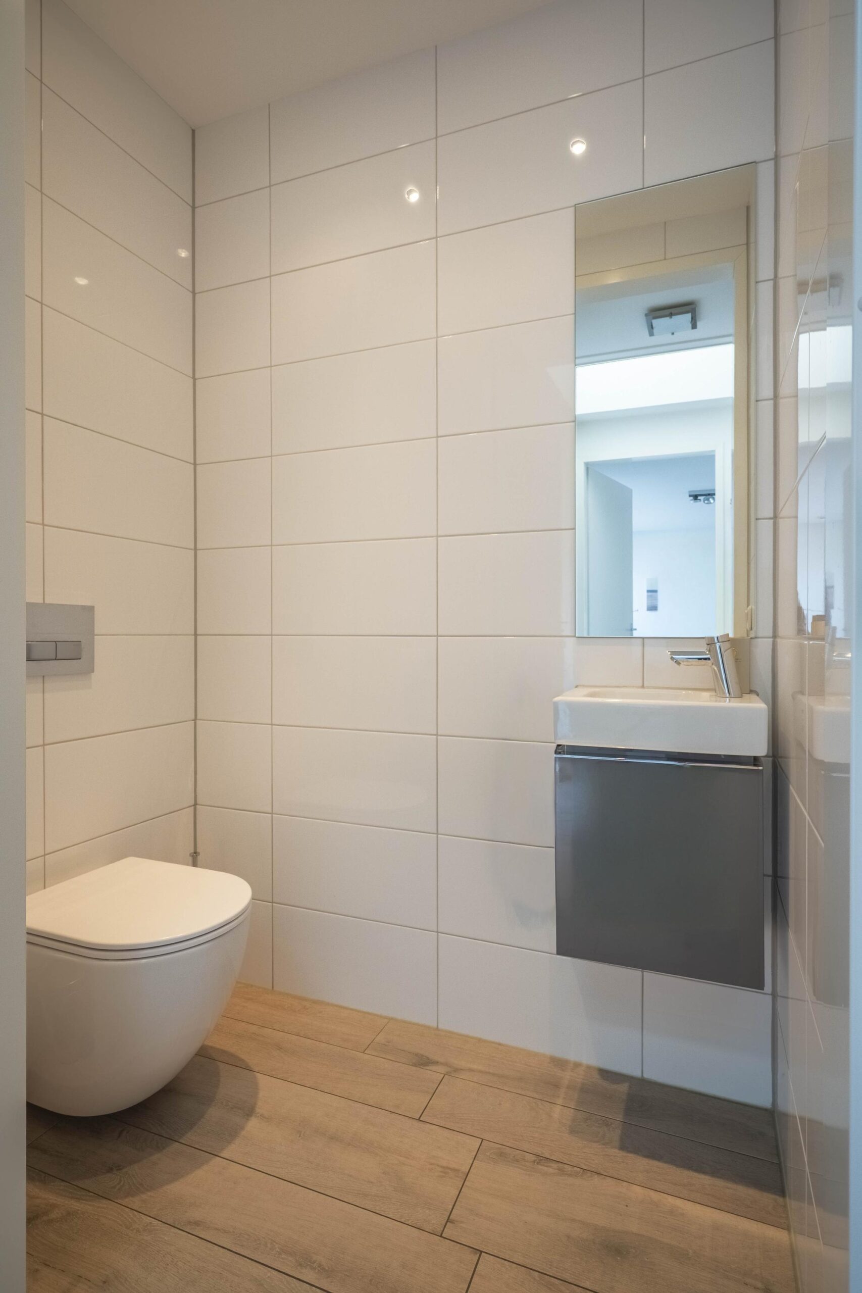 Via de overdekte entree met ingebouwde ledverlichting betreed je de hal met vide en een fraaie garderobekast. Het geheel betegelde, luxe toilet is voorzien van een vrijhangend closet en fontein.