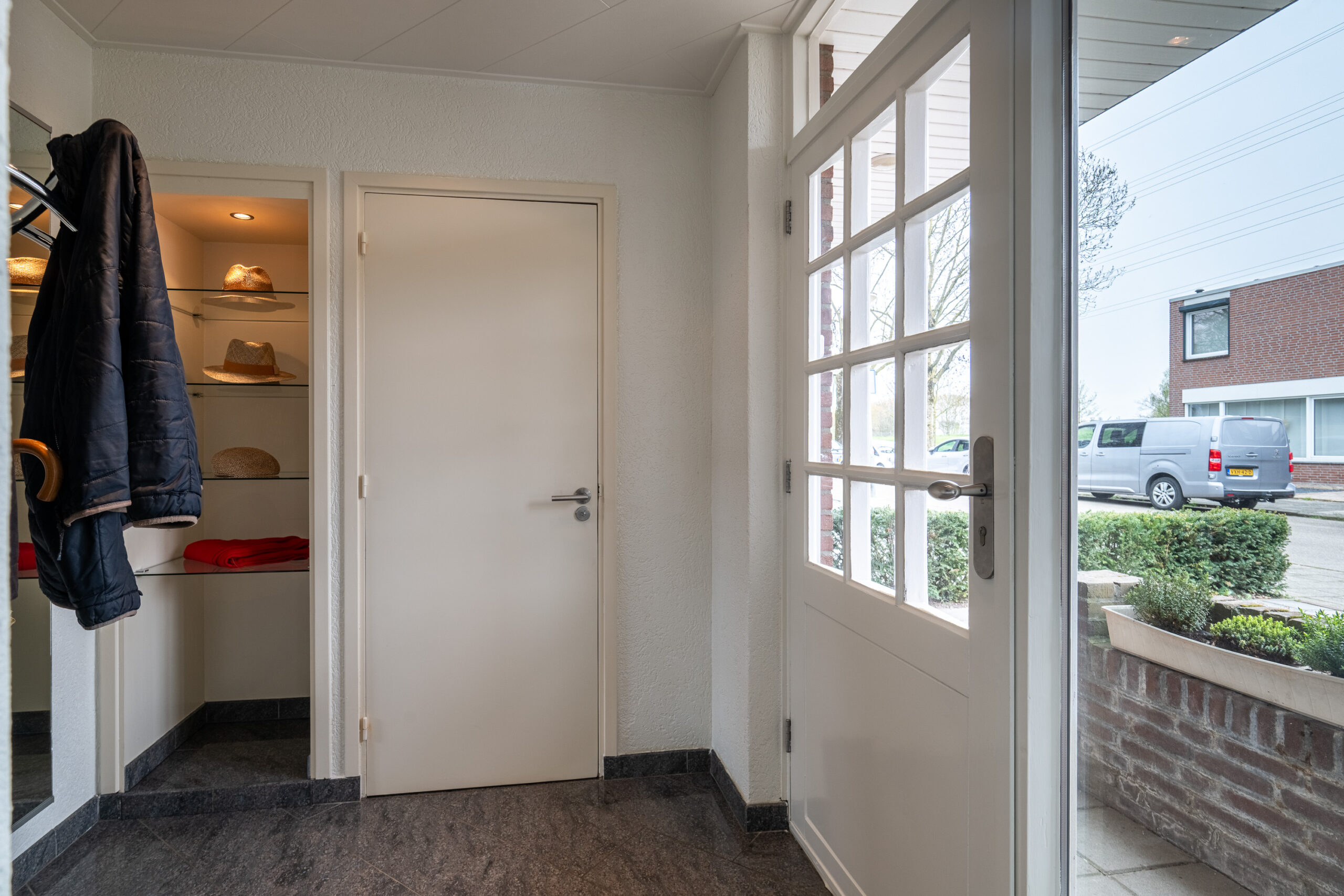 Via de verzorgde voortuin bereikt u de overdekte entree. In de ontvangsthal treft u een nette plavuizen vloer, een praktische inbouwkast en een modern, volledig betegeld toilet met fonteintje.