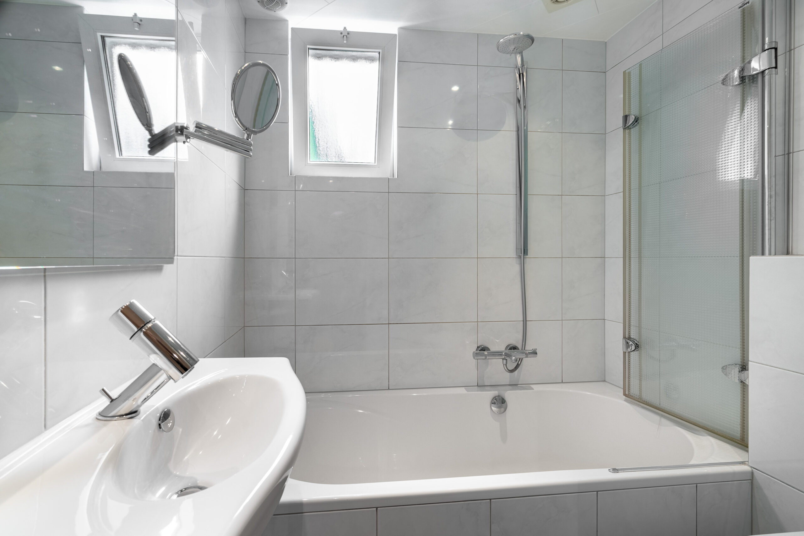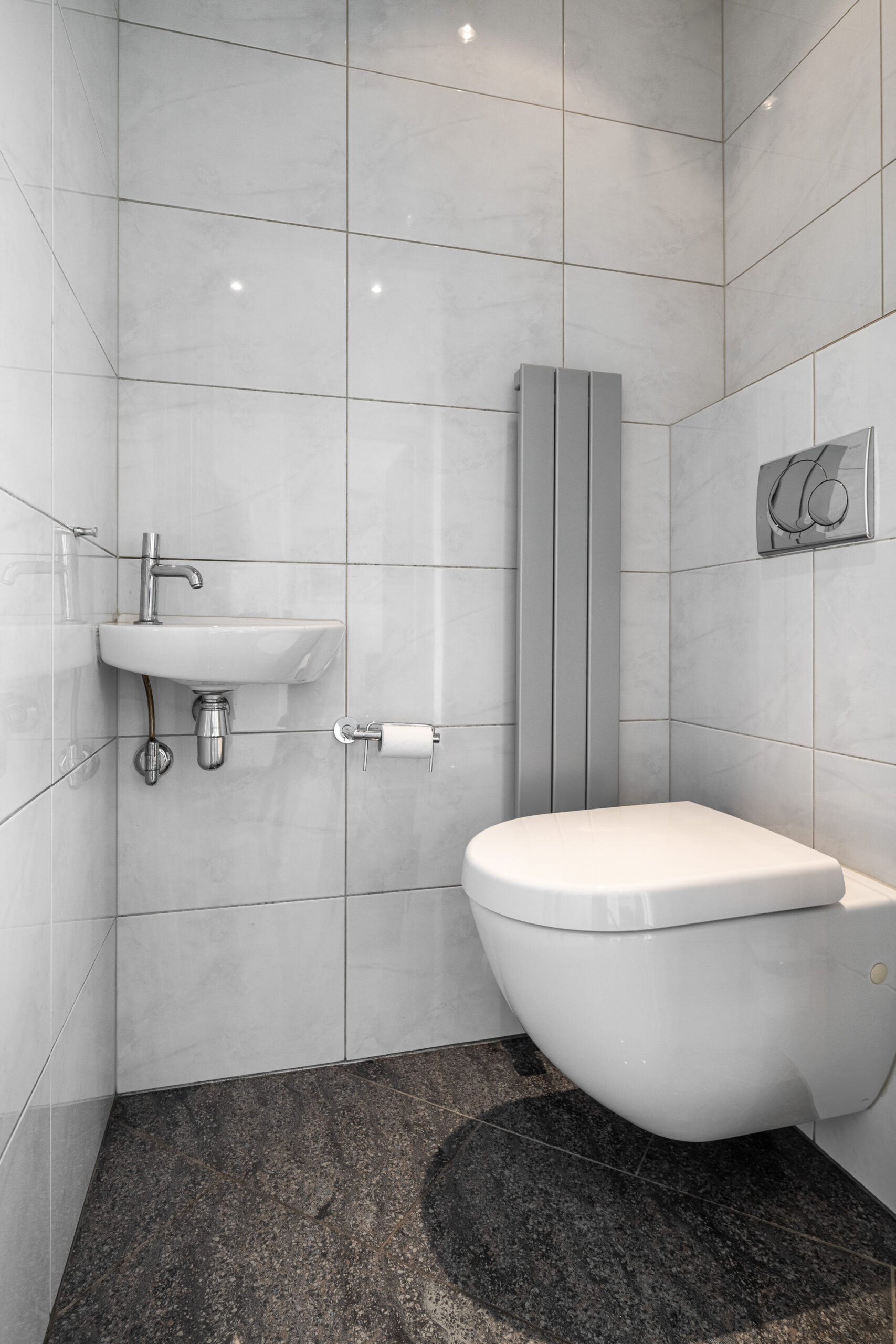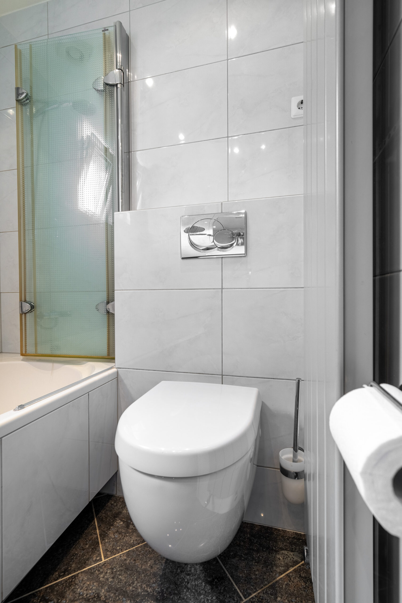 De verzorgde badkamer is volledig betegeld en uitgerust met een ligbad met douche, tweede vrijhangend toilet en wastafel. Het verlaagde plafond met inbouwspots, mechanische ventilatie en elektrische vloerverwarming maken de badkamer compleet.