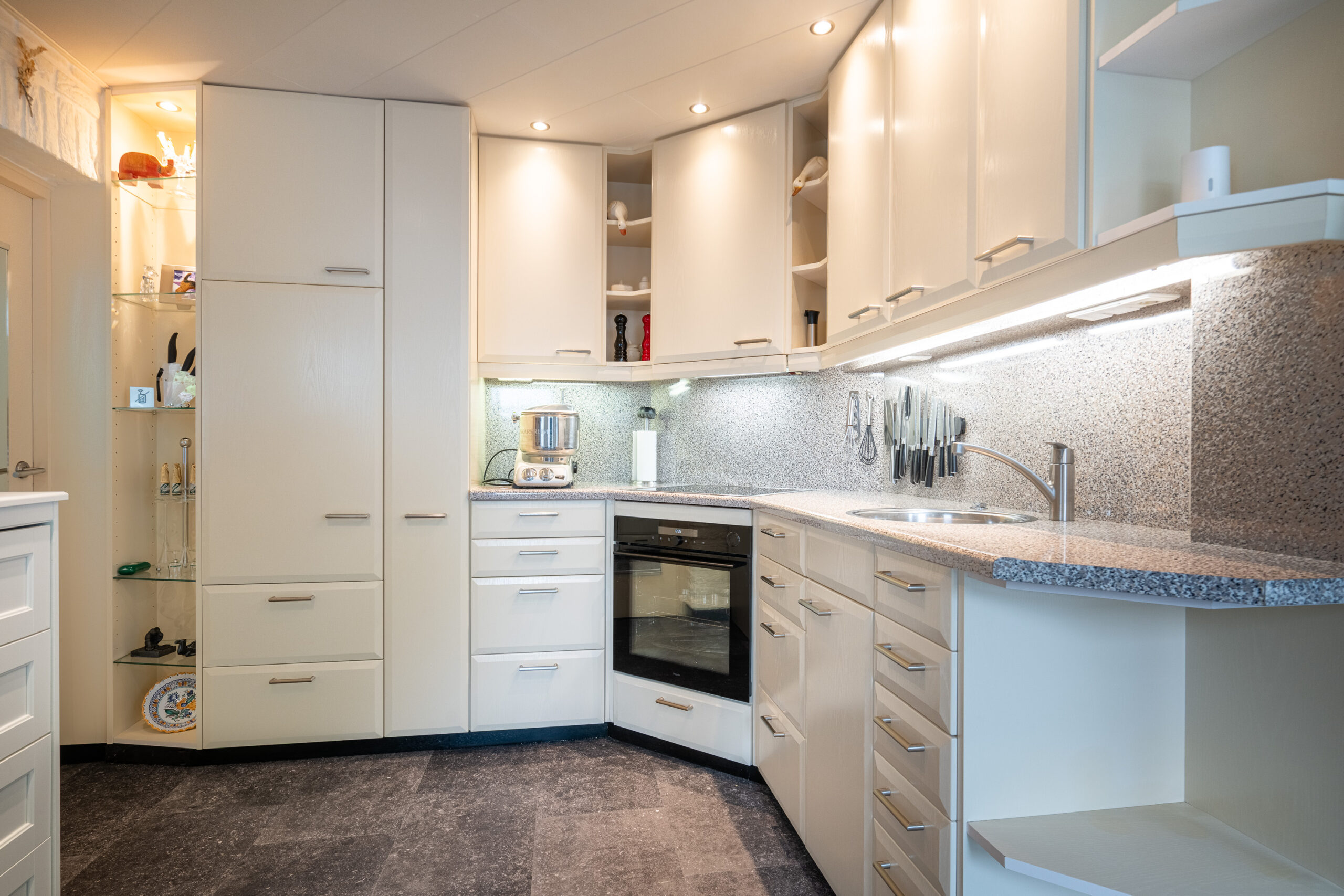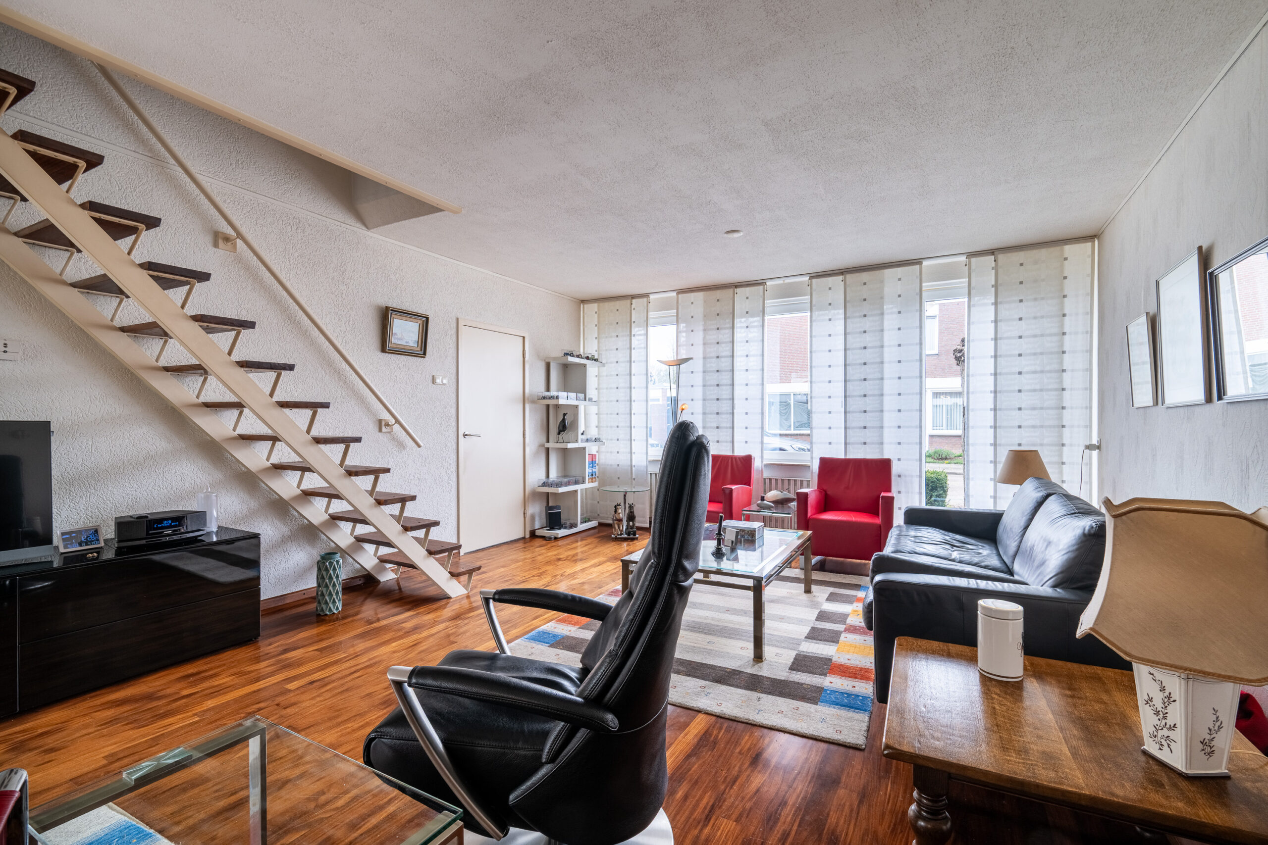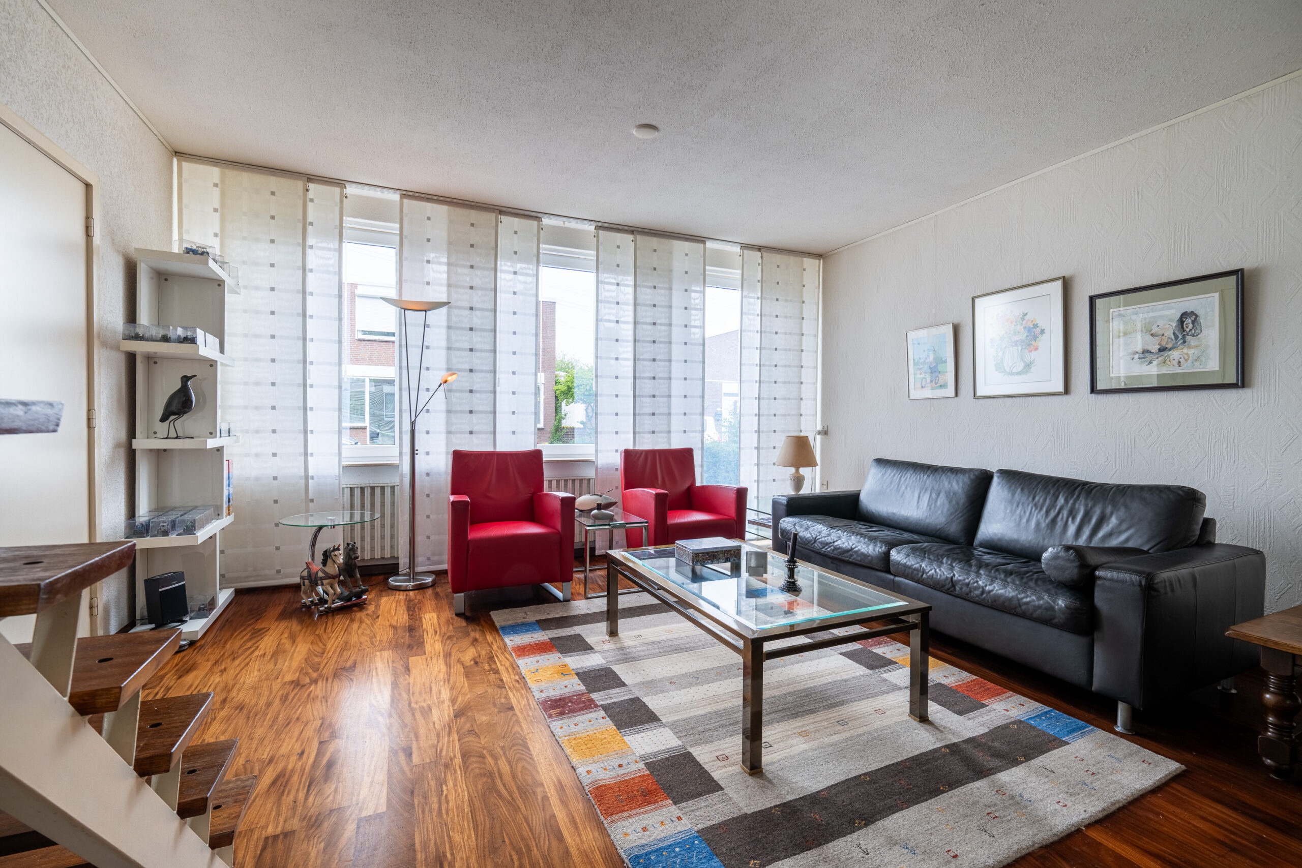 De ruime en lichte woonkamer valt direct op door de prettige lichtinval en warme uitstraling dankzij de houten vloer. De open leefkeuken in hoekopstelling vormt het hart van de woning en is voorzien van een granieten werkblad en diverse inbouwapparatuur, waaronder een recent vernieuwde oven (2025), keramische kookplaat, afzuigkap, koelkast en een praktische apothekerskast.