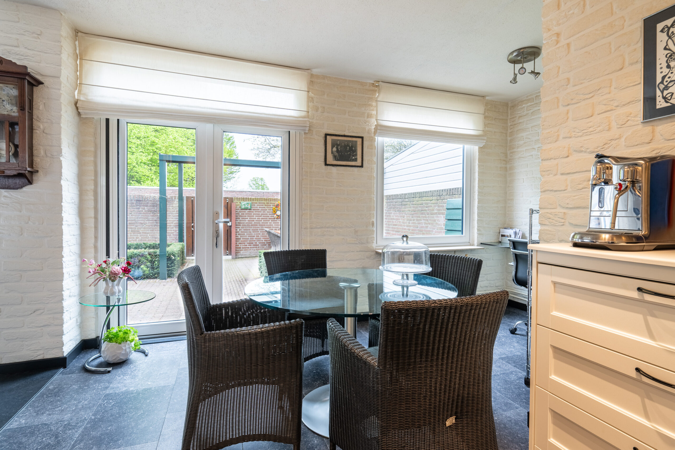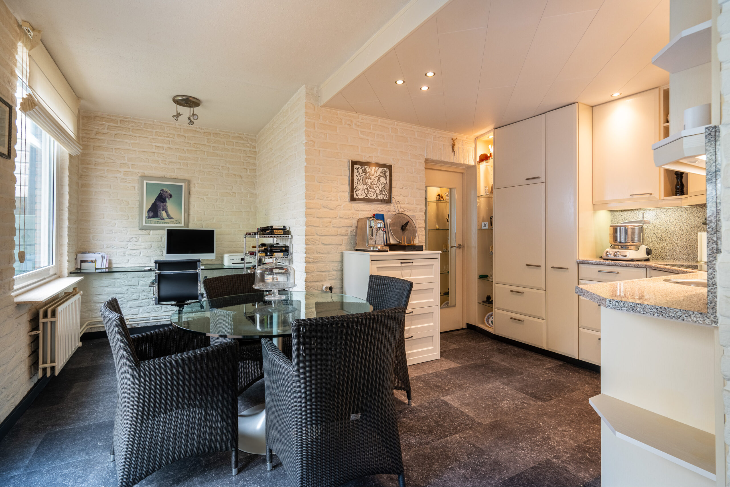Aangrenzend bevindt zich een handige study/werkplek. Via de dubbele openslaande deuren (met horren) bereikt u de tuin. Tevens bereikt u vanuit de keuken en hal de berging met wasmachineaansluiting, moderne Hager meterkast, omvormer voor de 12 zonnepanelen en de Nefit HR-combiketel (Volta, huur, bwj. 2020)
