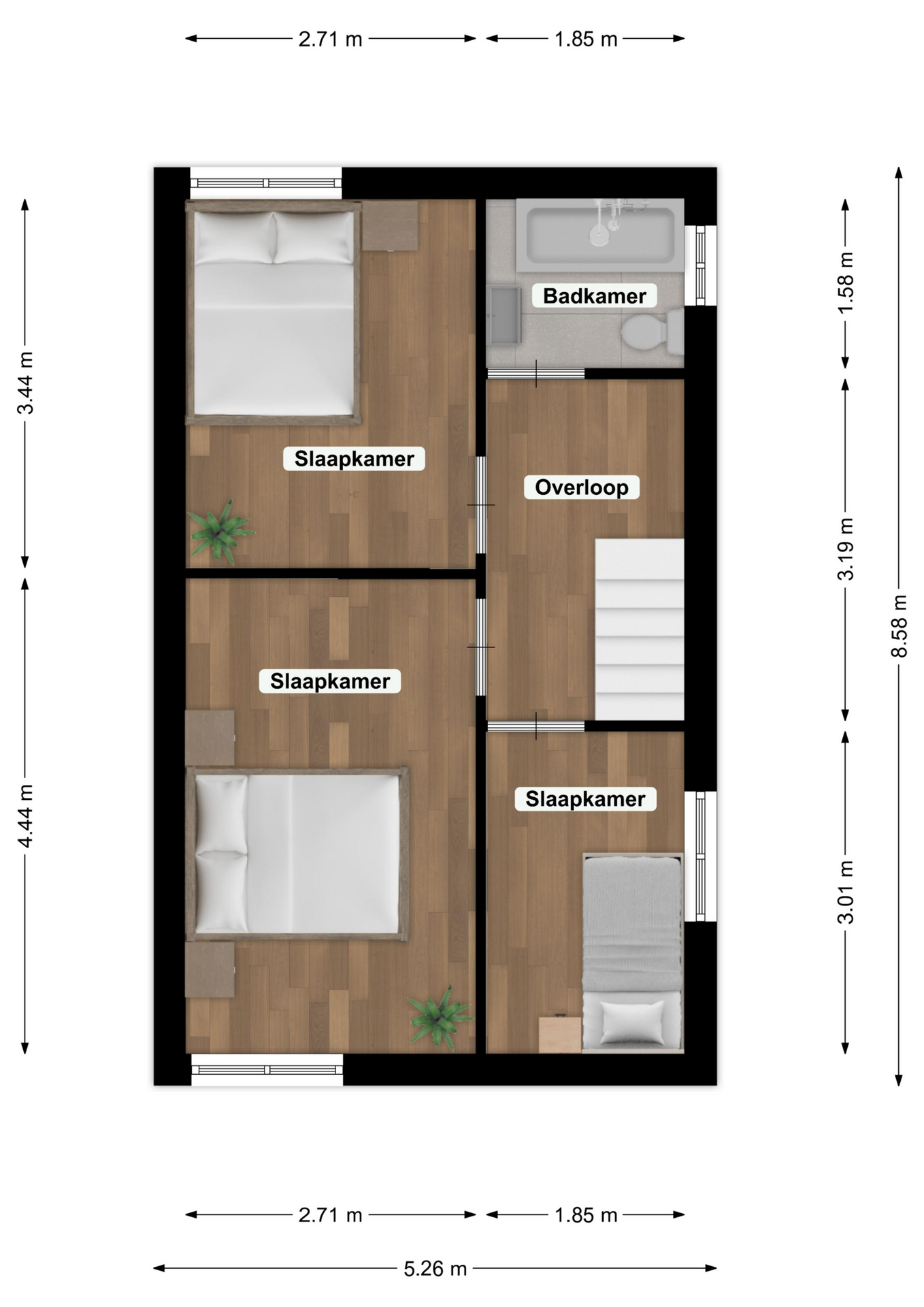 Op de eerste verdieping bevinden zich drie slaapkamers van goed formaat, respectievelijk groot: