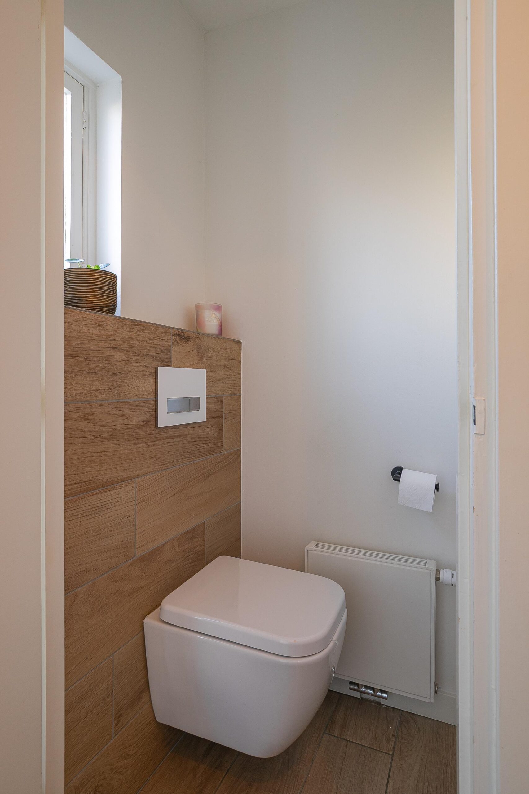 Aan de achterzijde van de woning is er toegang tot de inpandige garage en de eerste badkamer (ca. 4 m²), welke is uitgerust met een ligbad en een wastafelmeubel.