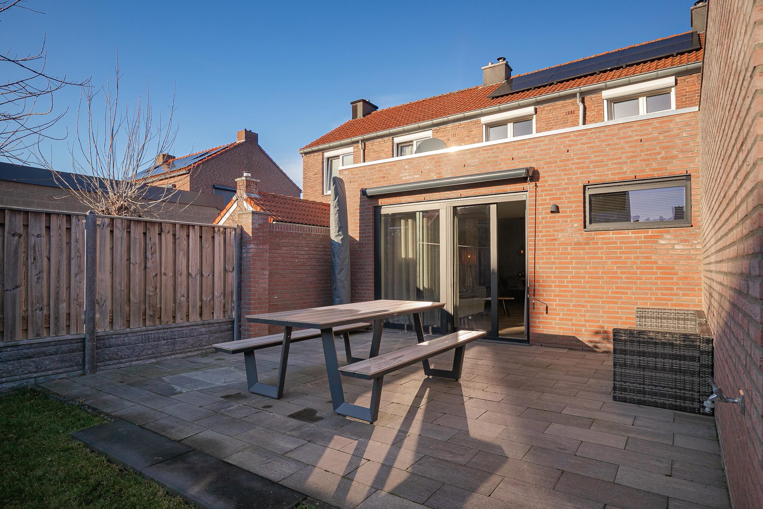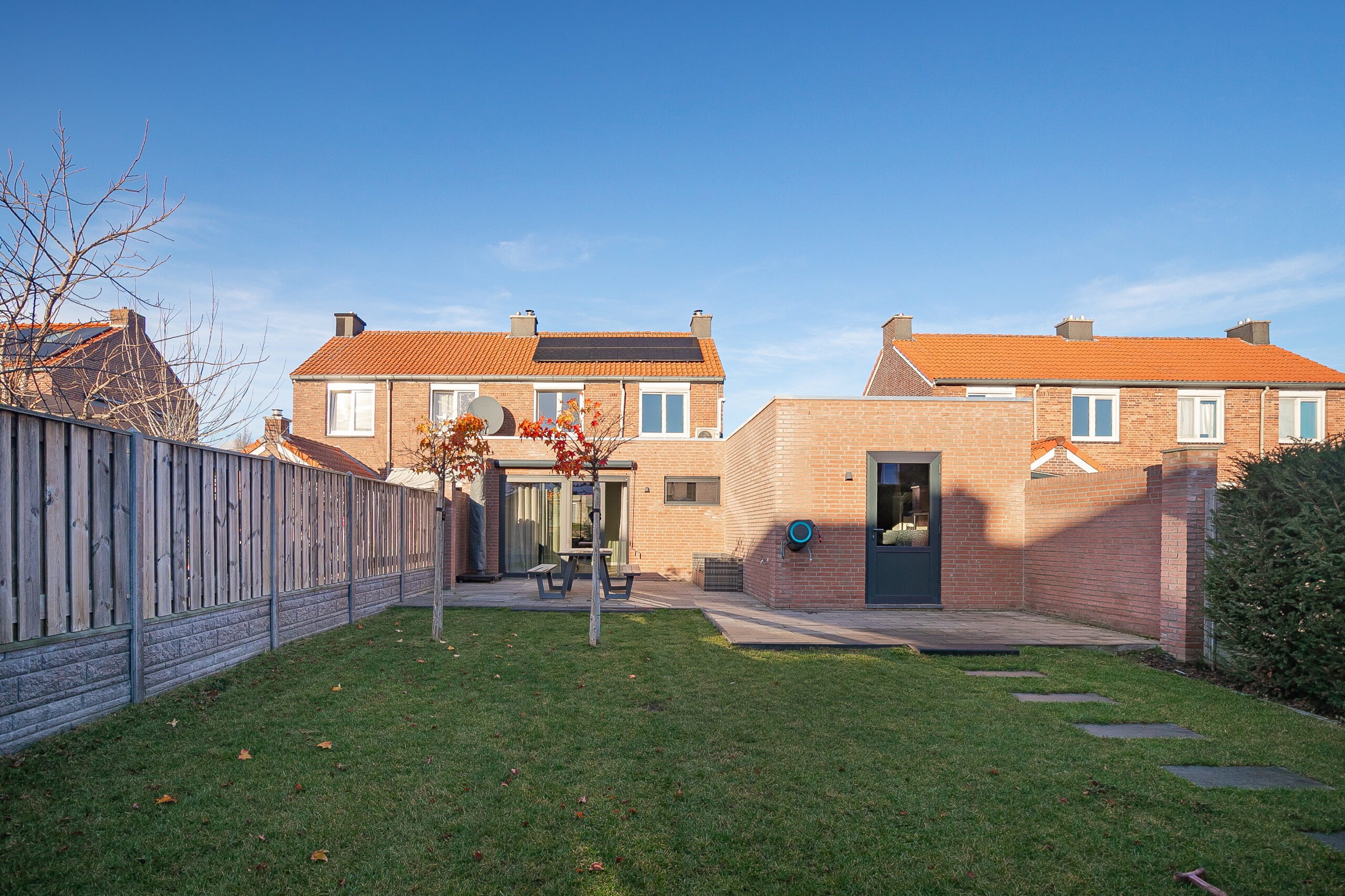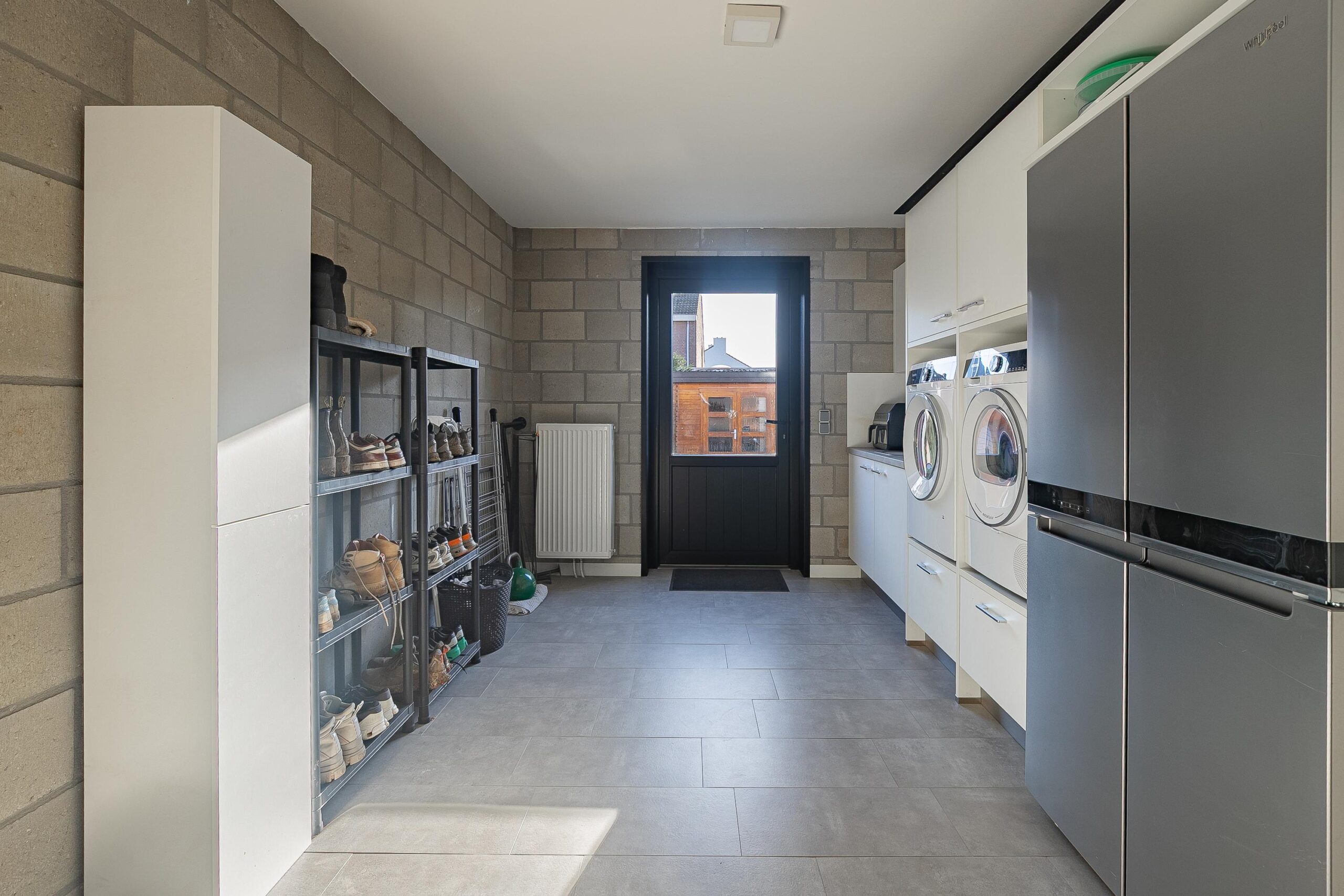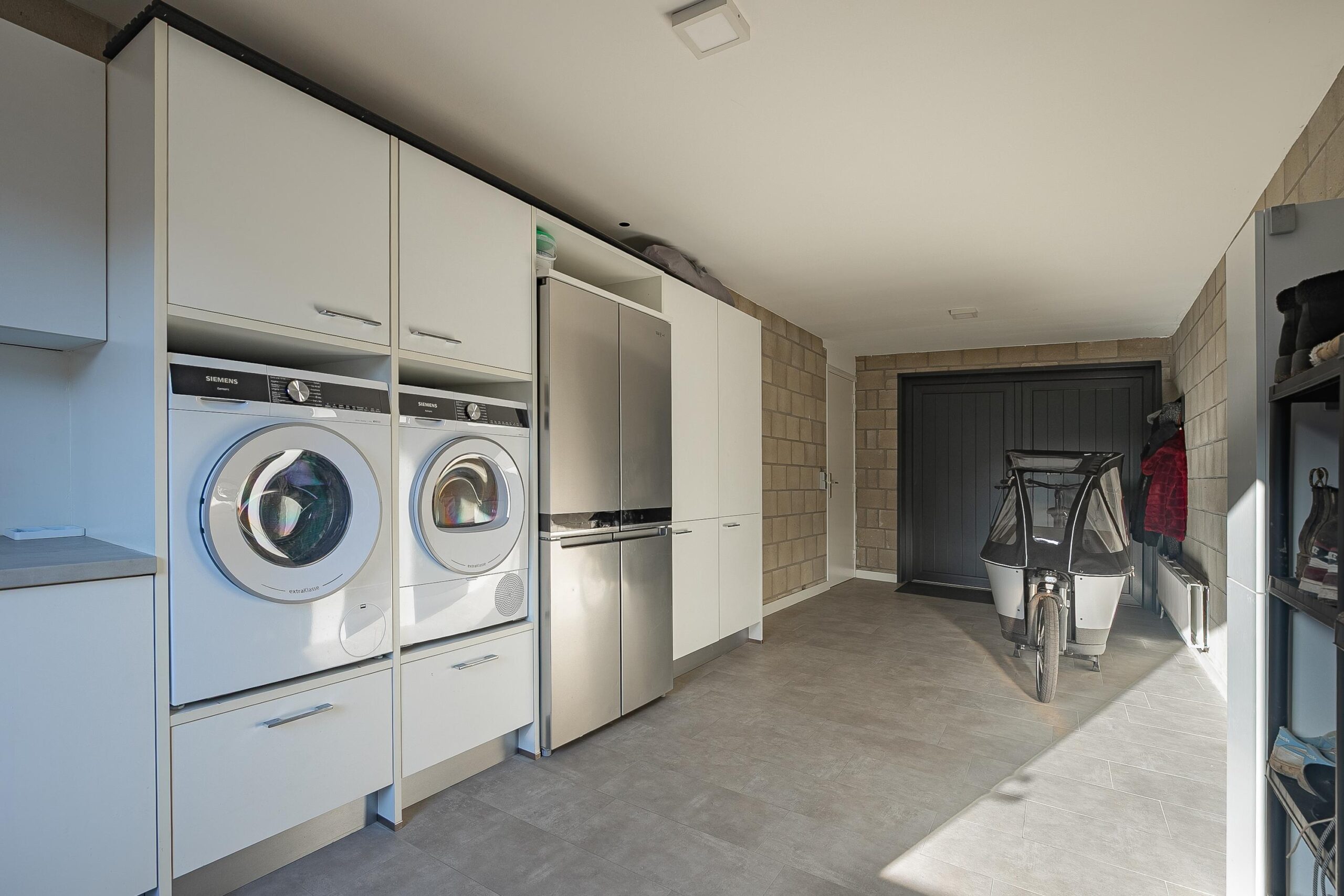 De inpandige garage (ca. 22 m²) is voorzien van elektra, water en verwarming en beschikt over aansluitingen voor witgoed. Aan de voorzijde is de garage uitgerust met openslaande deuren.