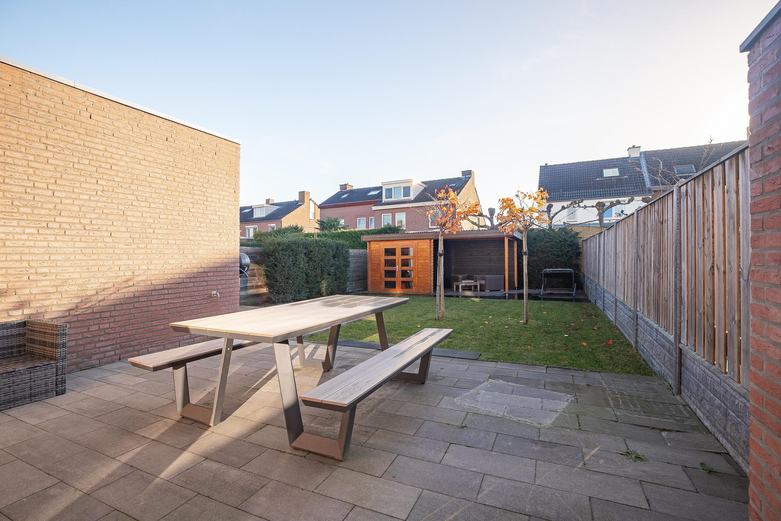 De ruime tuin is bereikbaar via de schuifpui vanuit de woonkamer en via de inpandige garage. Achter in de tuin bevindt zich een berging van ca. 7 m² met een aangrenzende houten overkapping, ideaal voor extra opslag en een beschutte zitplek.