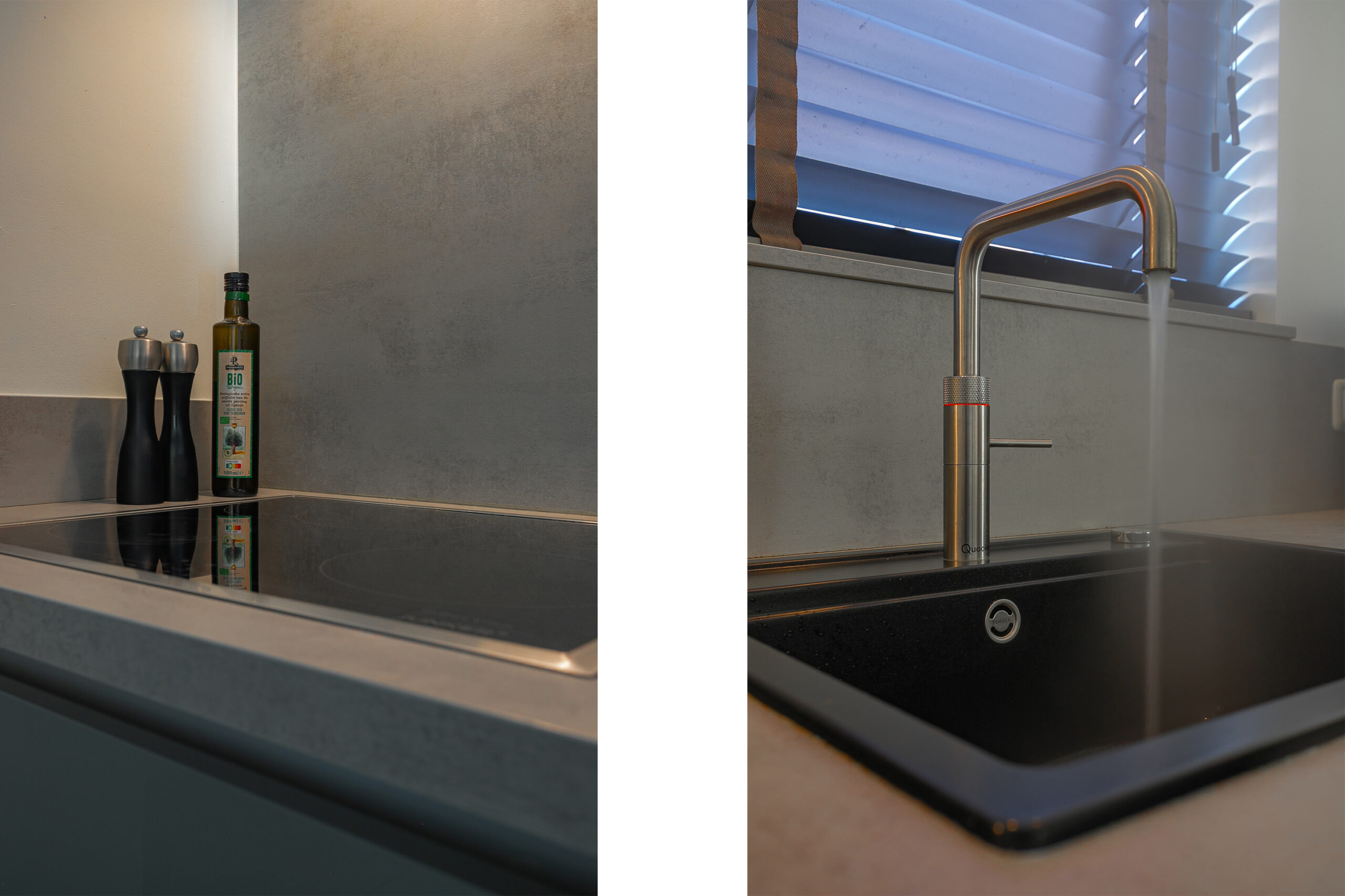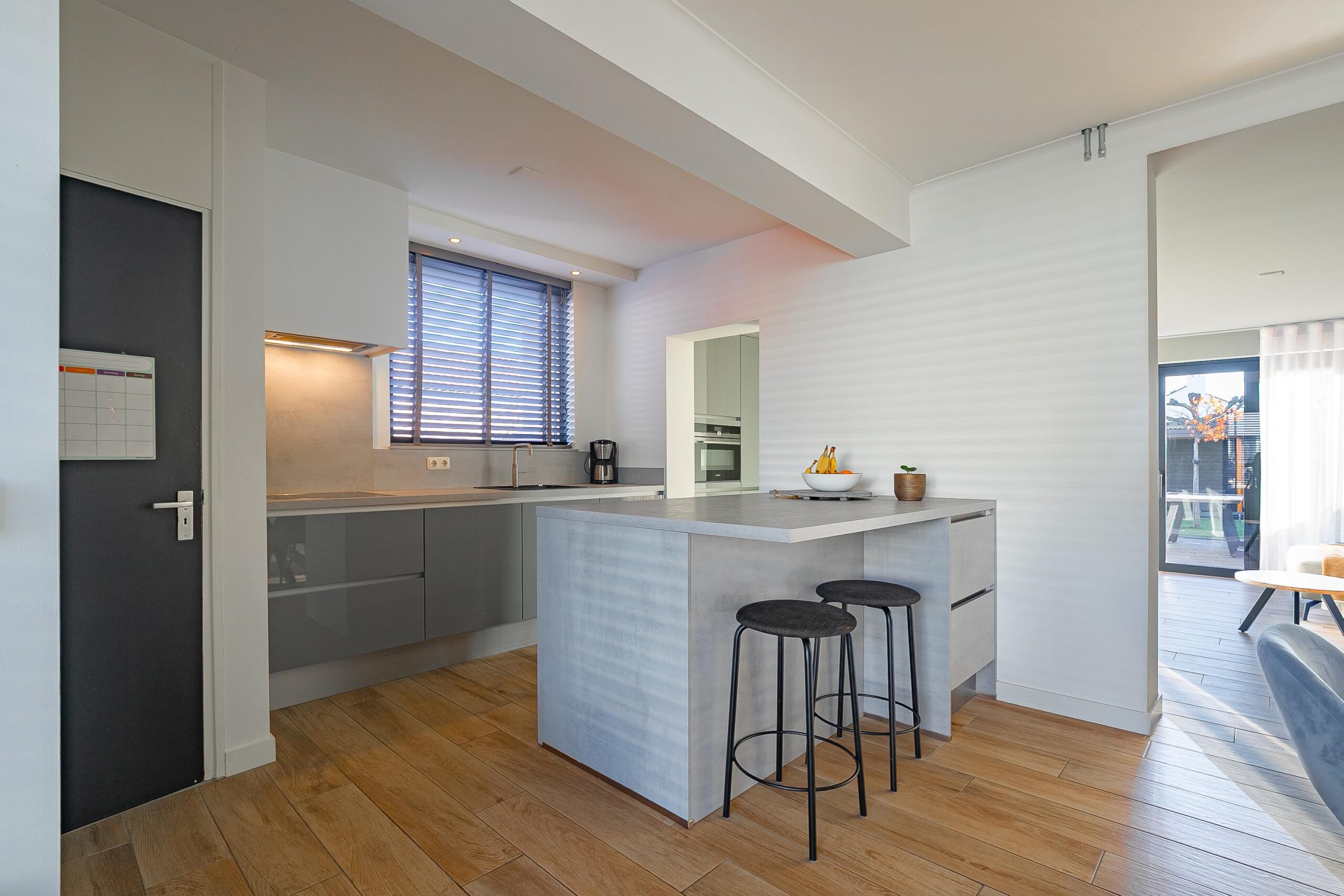 De open keuken is modern uitgevoerd en voorzien van een werkeiland en diverse inbouwapparatuur, waaronder een inductiekookplaat, spoelbak, vaatwasser, afzuigkap en een Inventum oven. Vanuit de keuken is tevens de kelder bereikbaar.