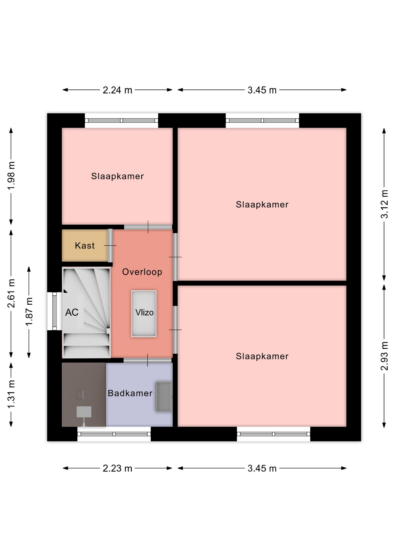 Via de overloop zijn drie slaapkamers bereikbaar van ca. 11 m², 10 m² en 5 m². De badkamer (ca. 3 m²) is voorzien van een inloopdouche en een wastafelmeubel. Op de overloop bevinden zich tevens de airconditioning en een praktische kastruimte. Daarnaast is vanaf hier de zolder bereikbaar middels een vlizotrap.