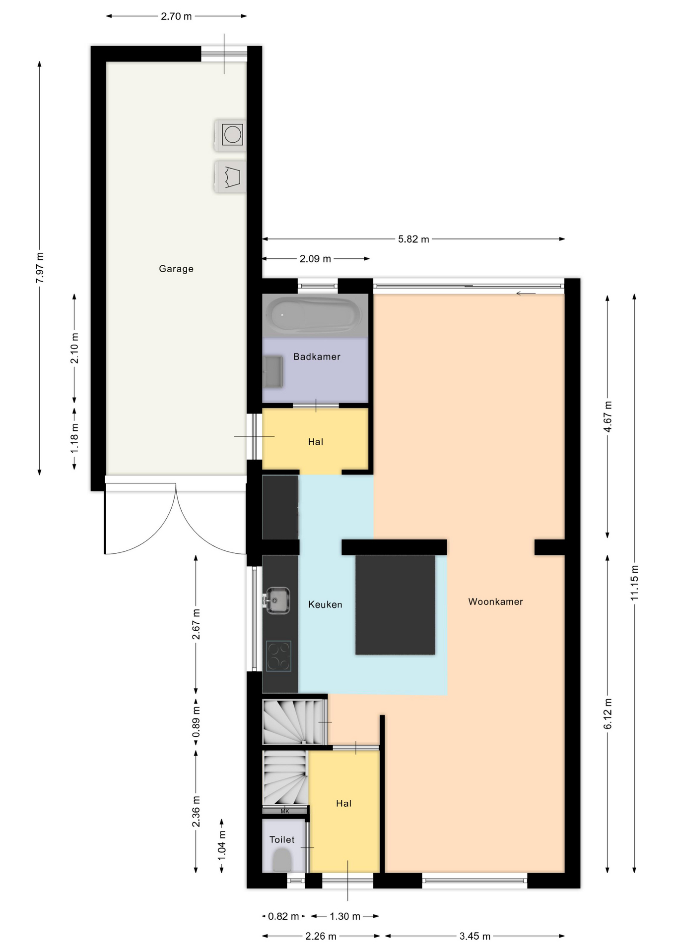 Entree met toegang tot de hal, waar zich het toilet met hangcloset en de trap naar de eerste verdieping bevinden. De woonkamer is ruim en licht dankzij de grote raampartijen en de grote schuifpui naar de achtertuin. De aanbouw biedt een fijne, extra leefruimte. De aanbouw is in 2021 gerealiseerd. Bij het ontwerp en de constructie is rekening gehouden met de mogelijkheid om in een later stadium een extra verdieping te realiseren. Hierdoor biedt de woning niet alleen direct extra leefruimte maar ook uitstekende uitbreidingsmogelijkheden voor de toekomst.