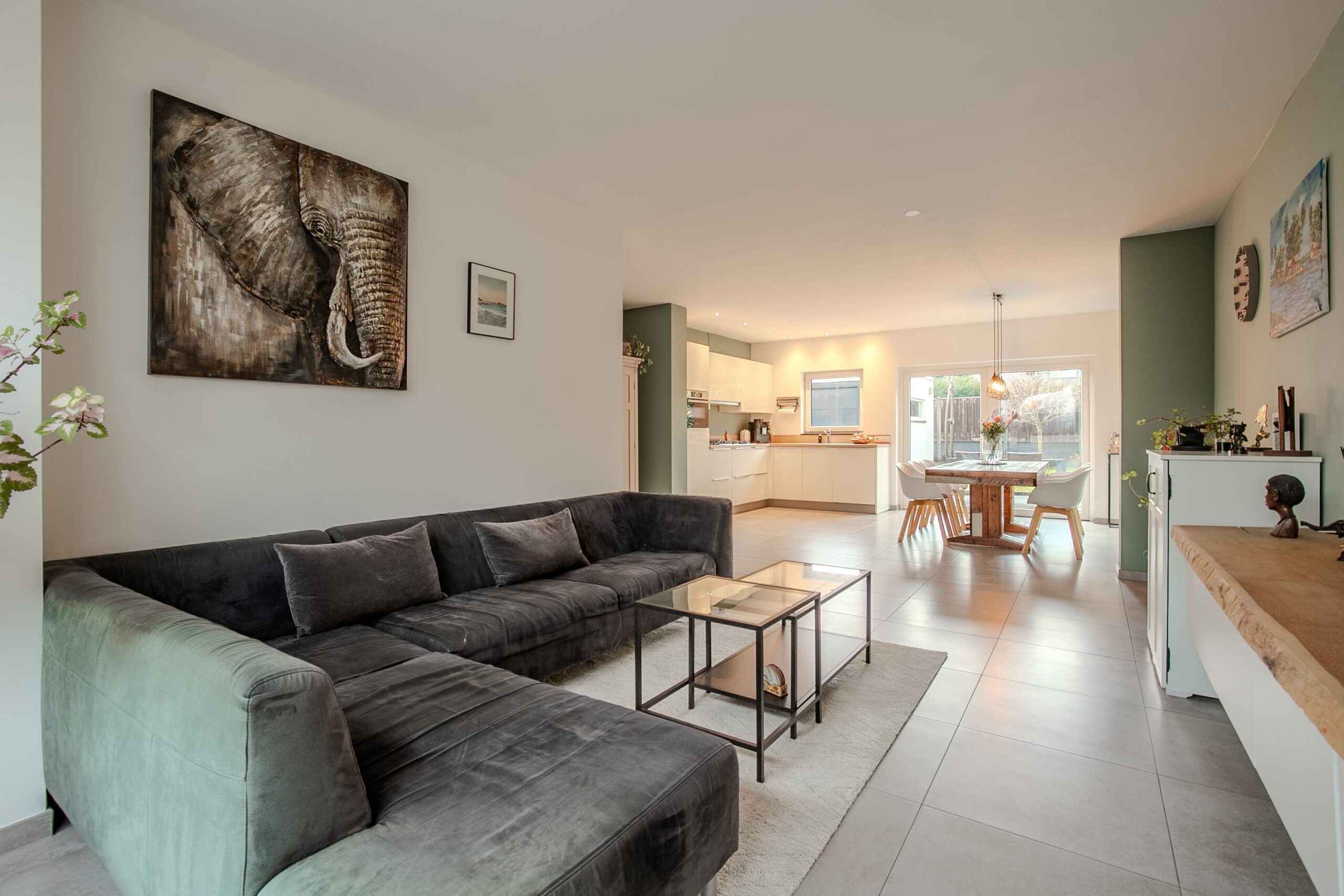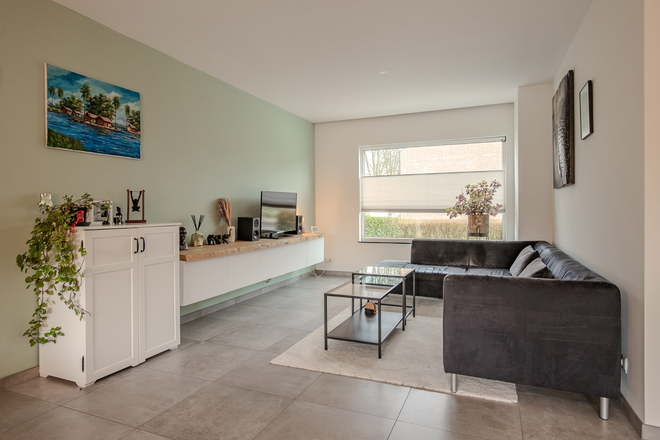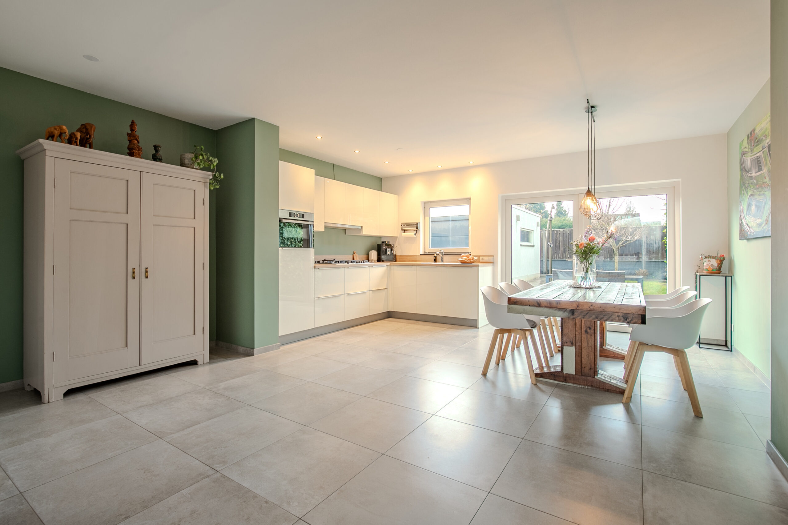 De ruime woonkamer is stijlvol afgewerkt met een moderne antraciet betonlook tegelvloer (60×60 cm) voorzien van vloerverwarming. Zowel wanden als plafond zijn strak gestukt, wat zorgt voor een moderne en eigentijdse uitstraling.