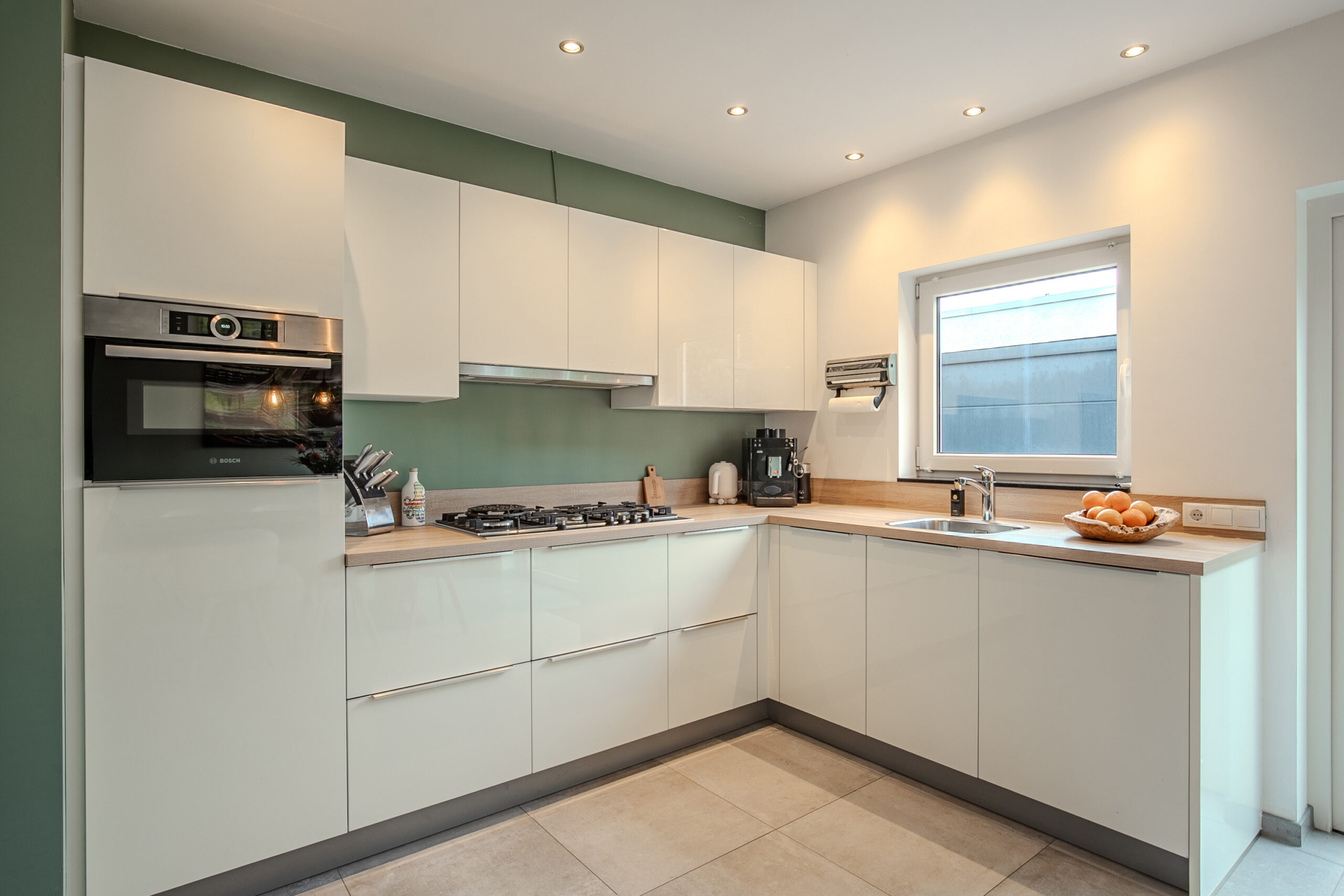 De open keuken in hoekopstelling is uitgevoerd in hoogglans wit en beschikt over complete Bosch-inbouwapparatuur: een koelkast met vriesvak, combimagnetron, vaatwasser, 5-pits gaskookplaat met wokbrander en een afzuigkap.