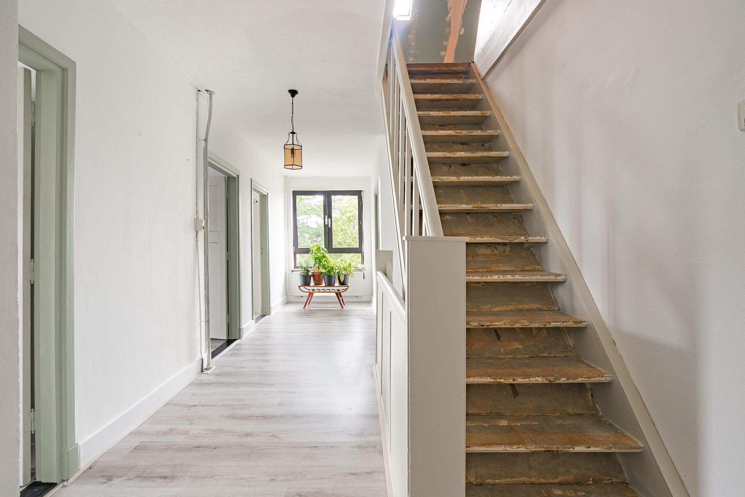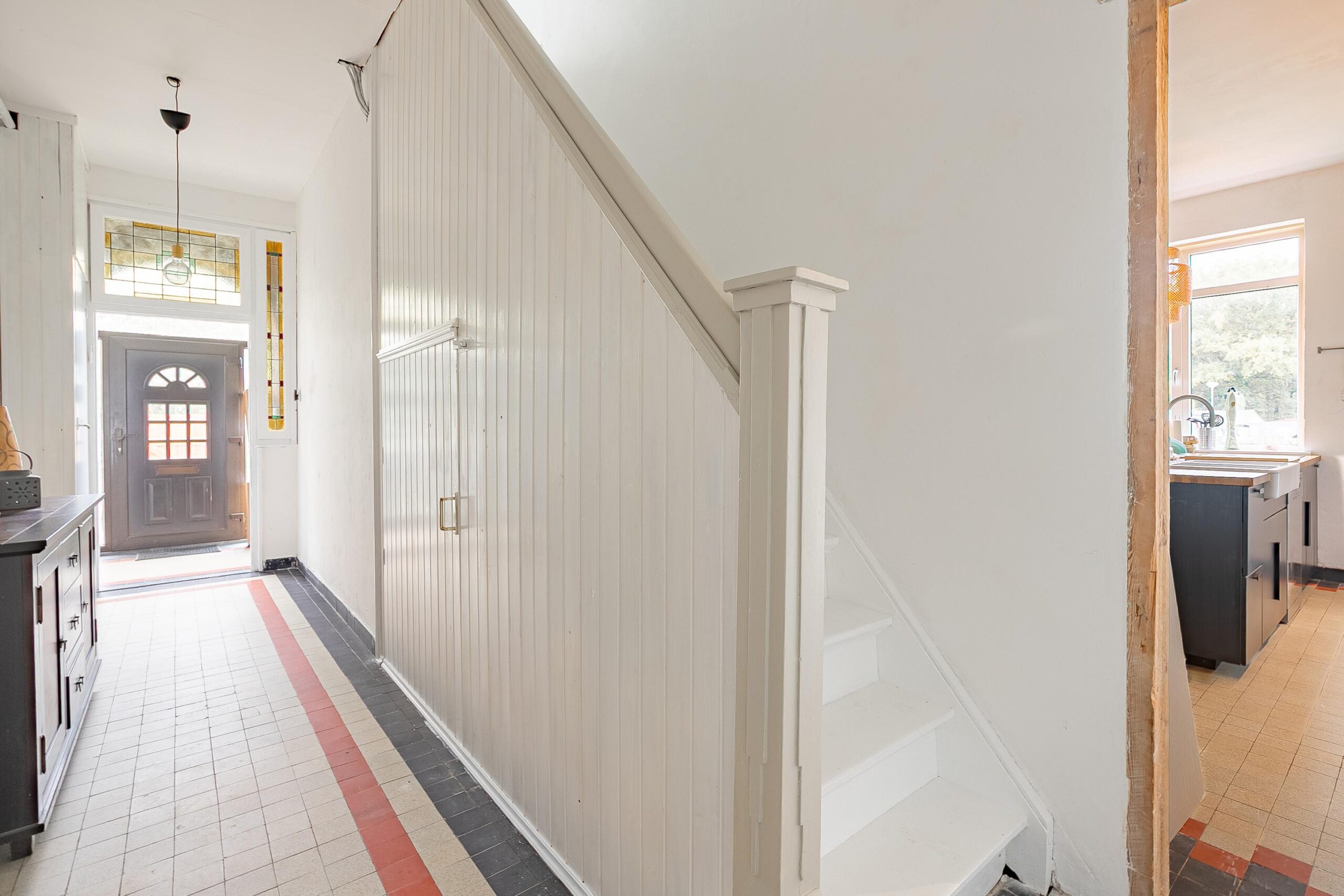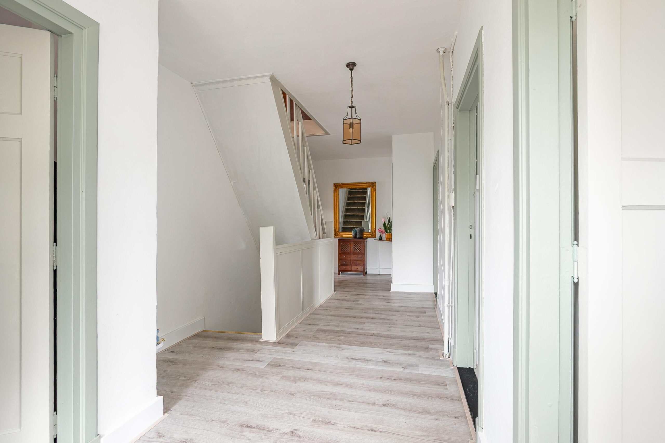 Bij binnenkomst via de authentieke voordeur stap je de ruime hal binnen, waar de originele plavuizen vloer direct in het oog springt. Het prachtige glas-in-loodraam zorgt voor een warm, kleurrijk lichtspel en benadrukt het karakter van dit bijzondere pand. De hal vormt het kloppend hart van de woning en biedt toegang tot de verschillende woonruimtes.