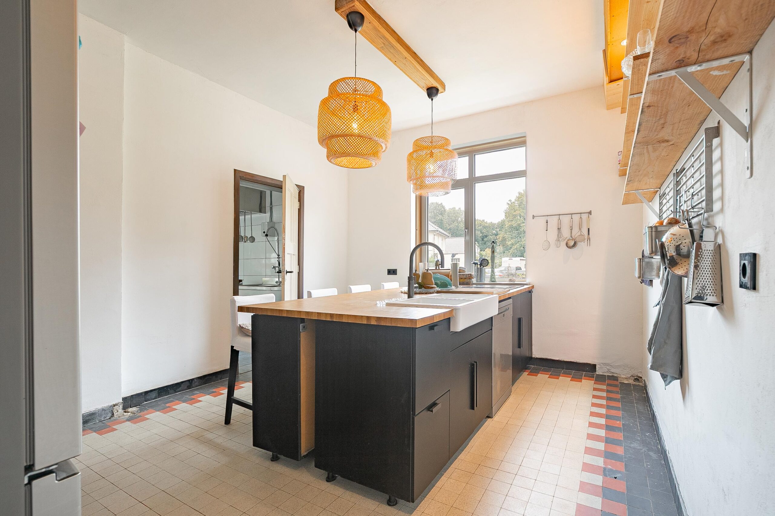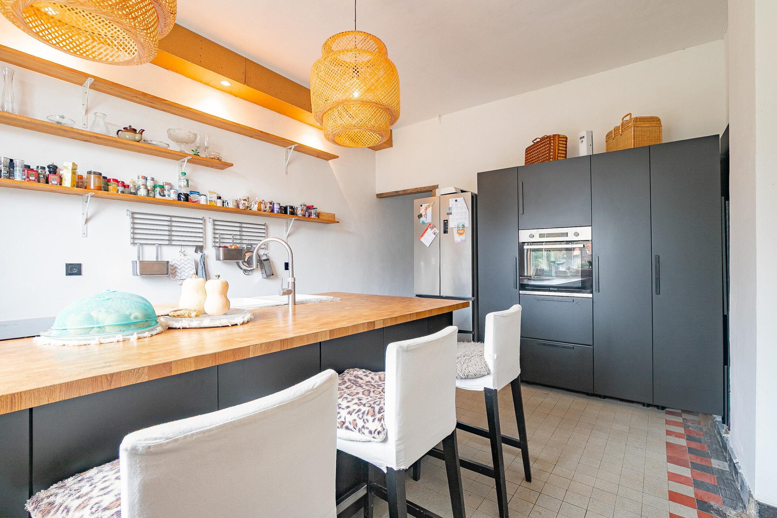 Achter deze ruimte ligt de moderne privékeuken: uitgevoerd in stijlvol zwart met een groot kookeiland als centraal middelpunt. De keuken is uitgerust met een koelkast, vriezer, oven, grote spoelbak en een kookplaat met geïntegreerde afzuiging. Hier komen design en functionaliteit op harmonieuze wijze samen. De vloer is hier, net als in de hal, voorzien van de originele plavuizen, wat het geheel een authentieke uitstraling geeft.