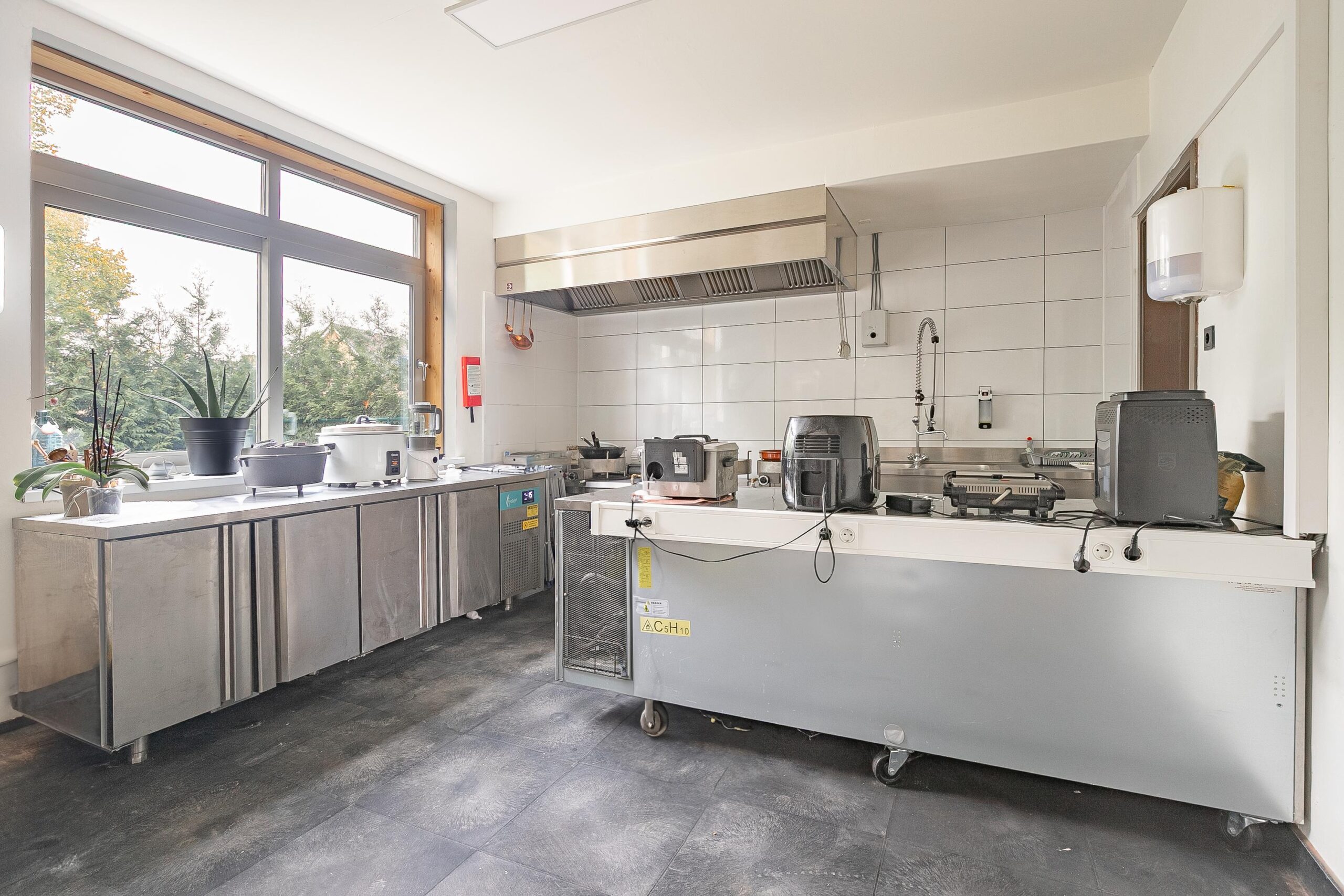 Aan de linkerkant van de hal bevindt zich de grote bedrijfskeuken, nog volledig functioneel en in goede staat. Deze ruimte leent zich uitstekend voor culinaire liefhebbers, een kleinschalige horecazaak of andere bedrijfsactiviteiten.