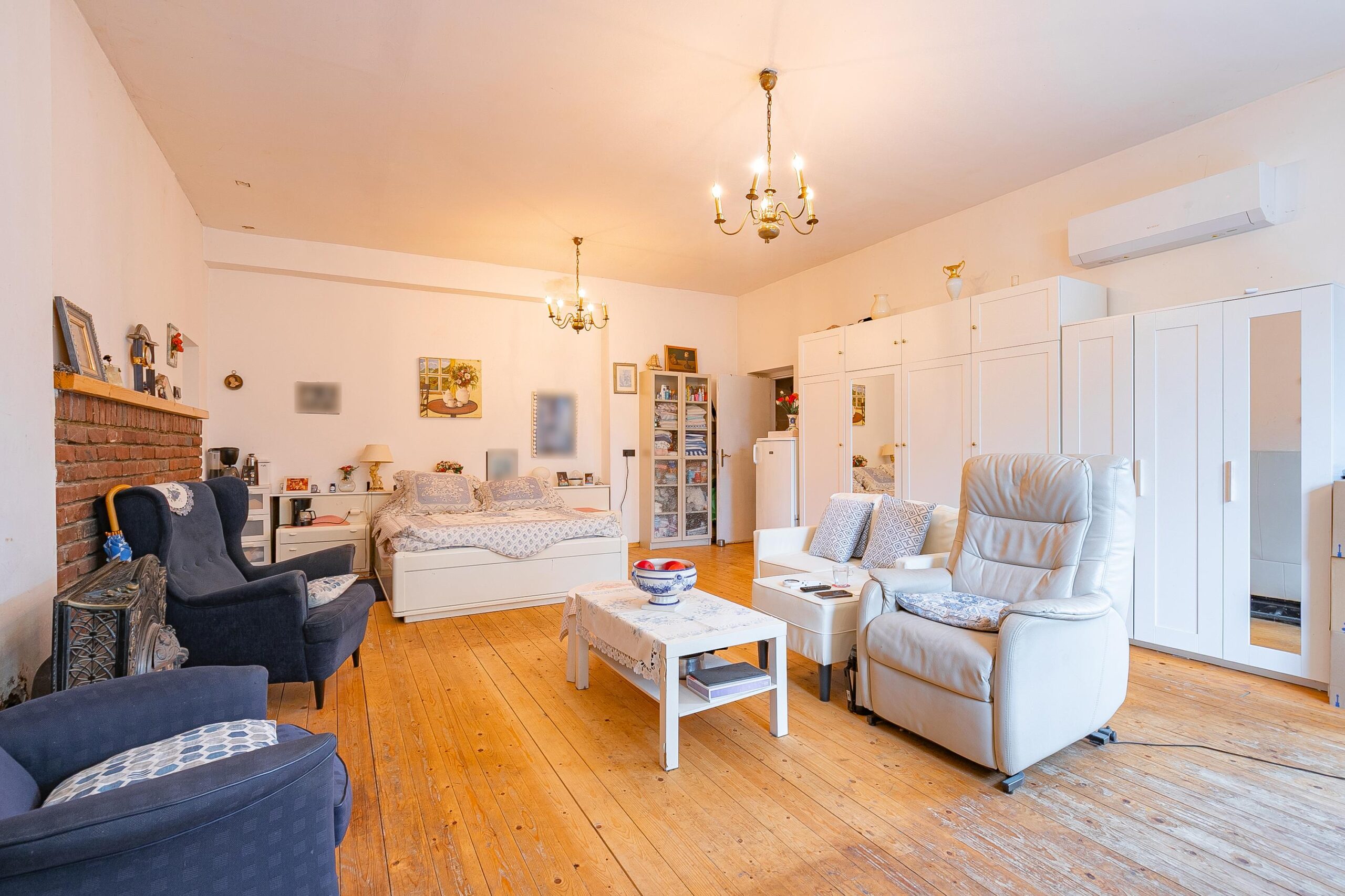 Aan de rechterzijde van de hal ligt een ruime studio, voorzien van een sfeervolle houten vloer en subtiele herinneringen aan het verleden — dit deel van de woning was ooit het dorpscafé. Enkele originele details uit die tijd zijn nog aanwezig, wat zorgt voor een unieke en charmante sfeer.