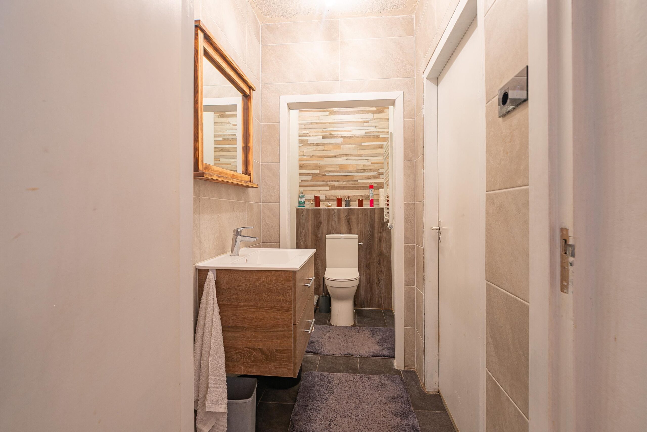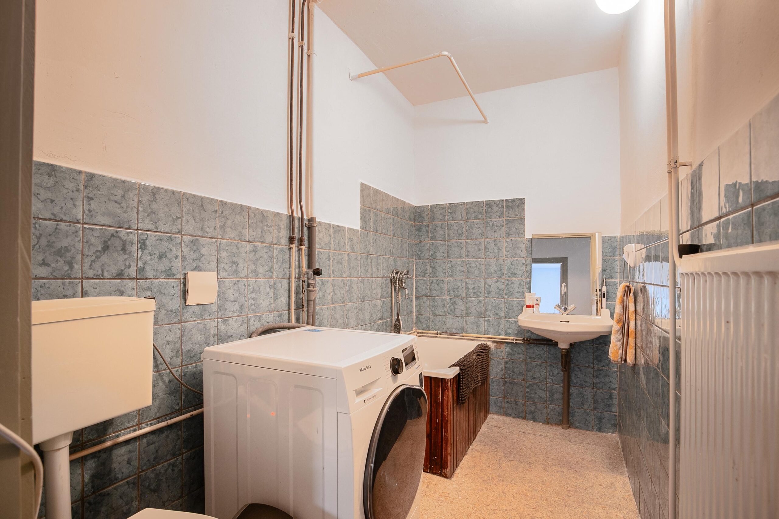 De badkamer op deze verdieping is praktisch ingericht met een ligbad, wastafel, toilet en wasmachineaansluiting. Hoewel deze ruimte functioneel is, verdient ze een moderne update – een perfecte kans om er helemaal jouw eigen wellnessruimte van te maken.