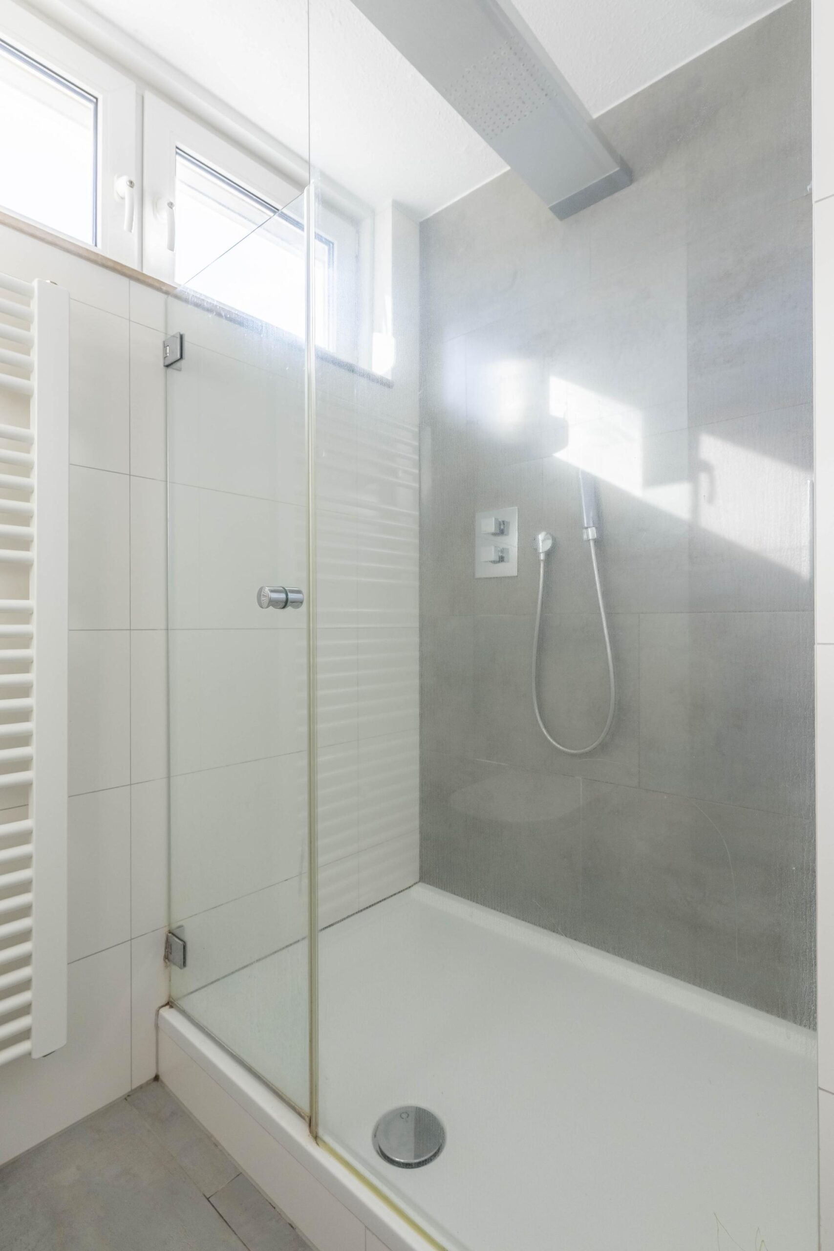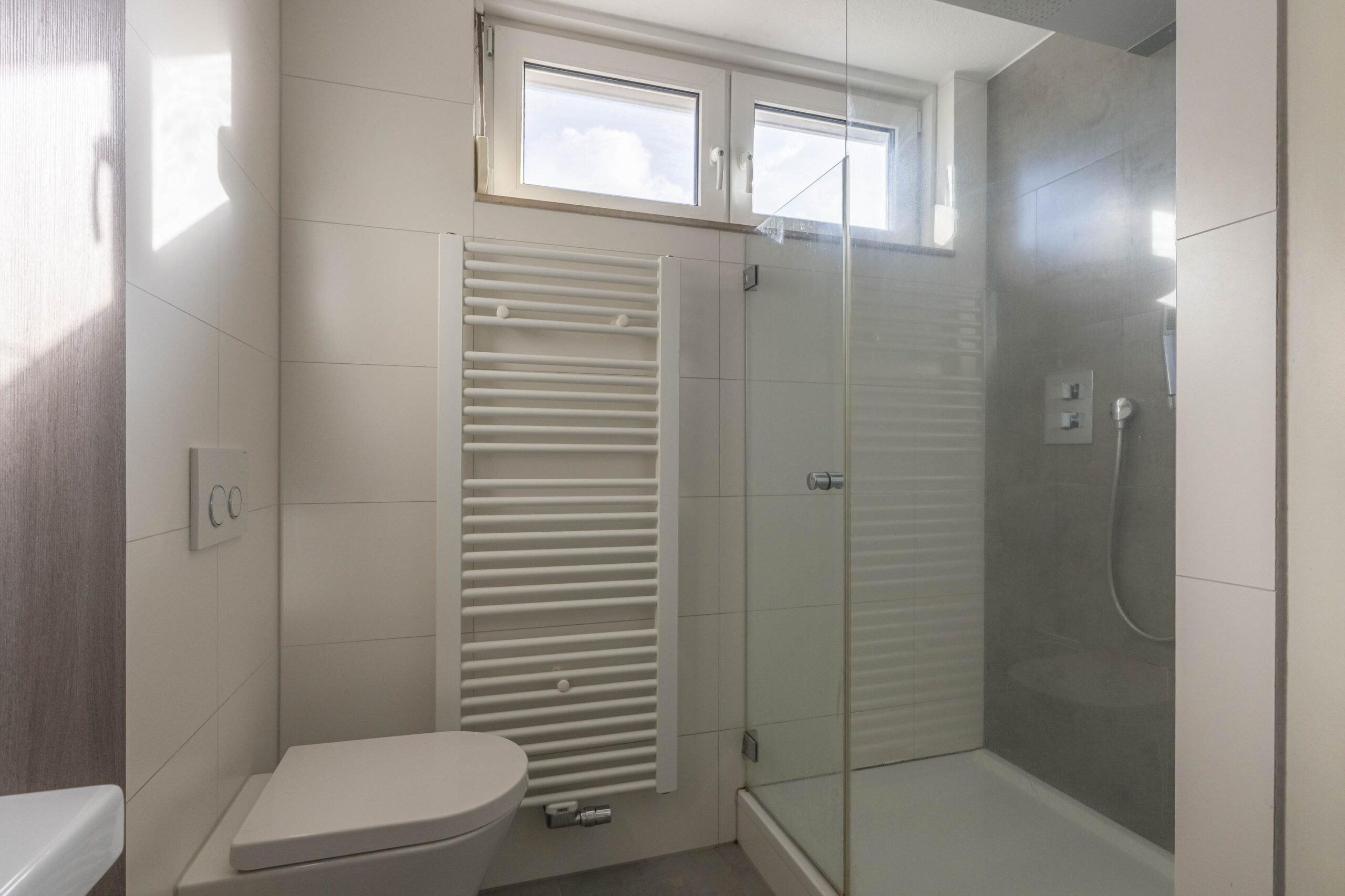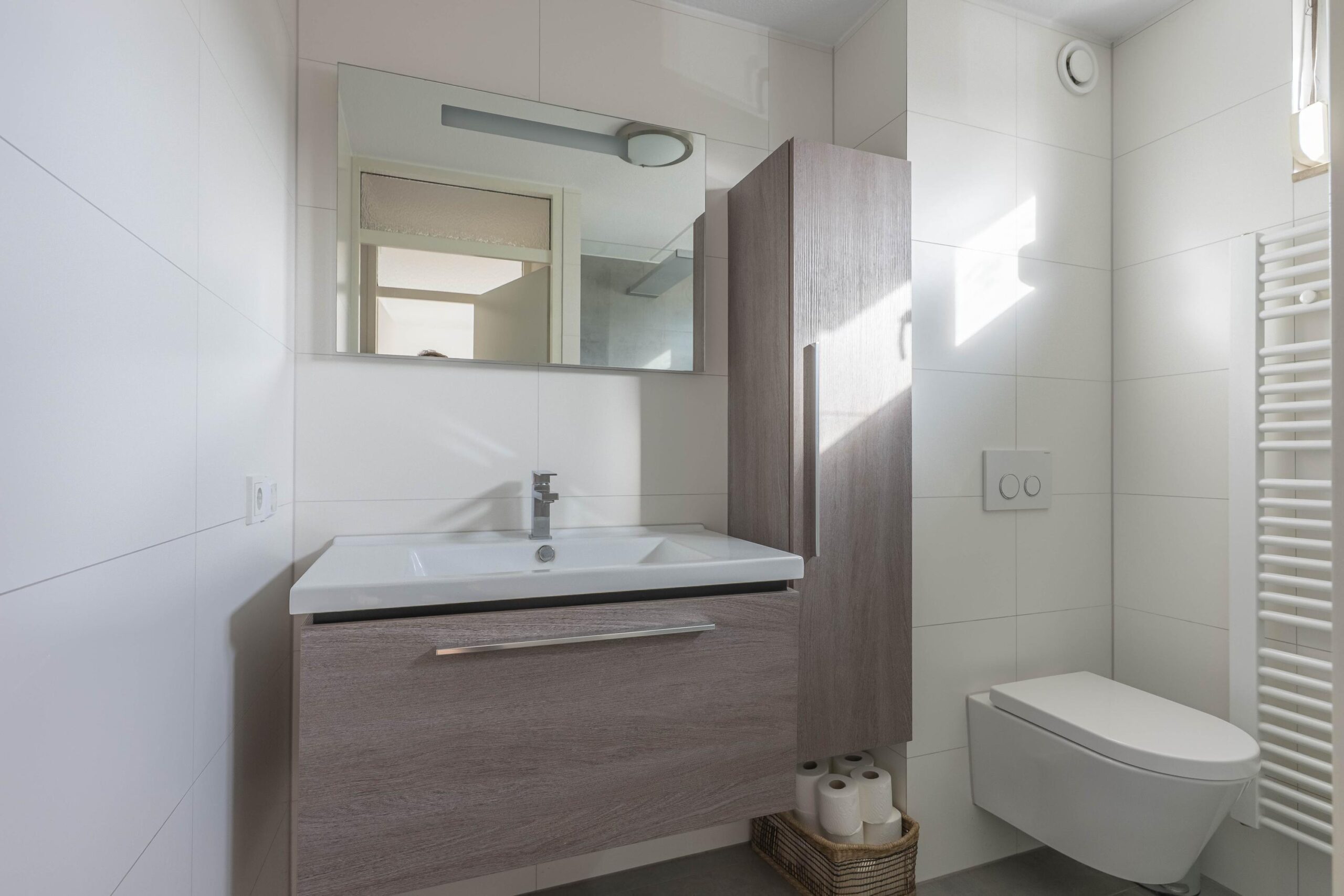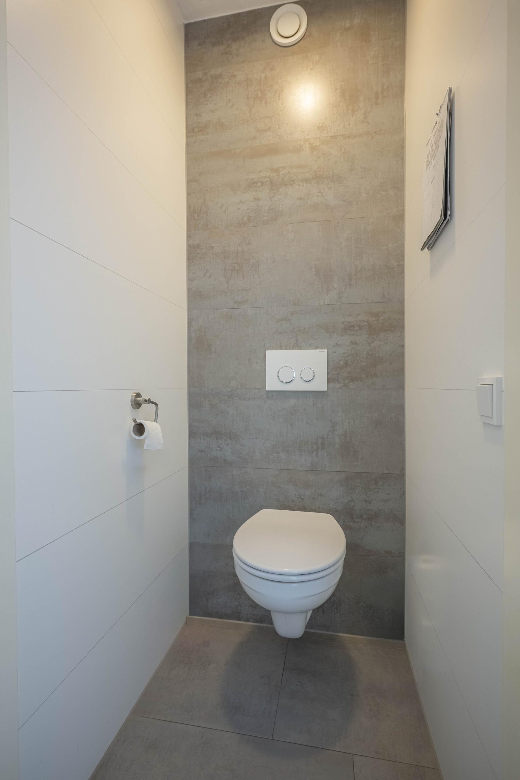 De moderne badkamer is geheel betegeld en uitgerust met een inloopdouche met regendouche en hardglazen wand, tweede zwevend toilet, wastafel met meubel, handdoekradiator, mechanische ventilatie en een raam met inzethor voor natuurlijke ventilatie en daglicht.