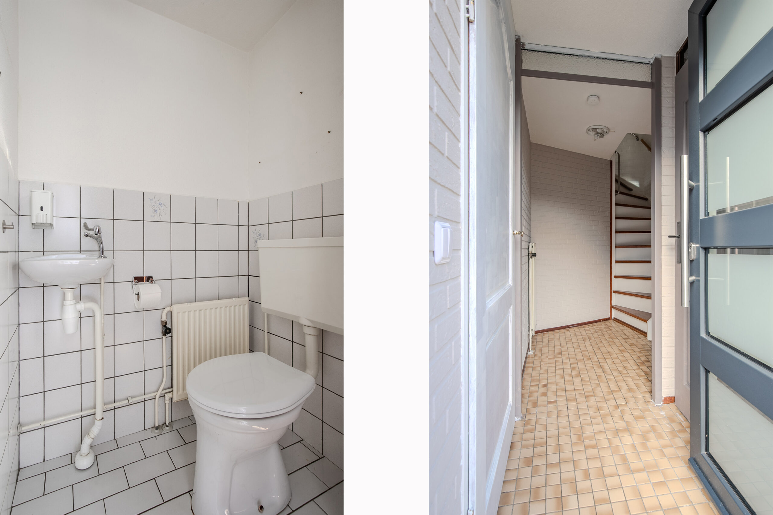 Middels de hal/entree met meterkast, trapopgang en een gedeeltelijk betegelde toiletruimte met een staand toilet en fonteintje komt u in de inpandig bereikbare garage alwaar eveneens de aansluiting voor de wasmachine aanwezig is. De garage is groot ca. 27 m² en is voorzien van een elektrisch bedienbare sectionaalpoort.