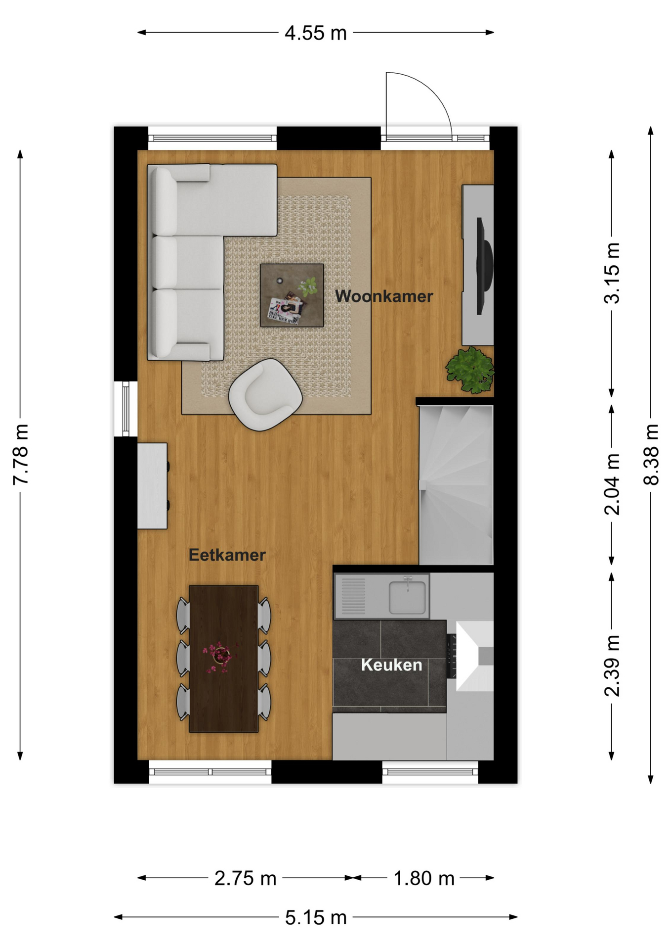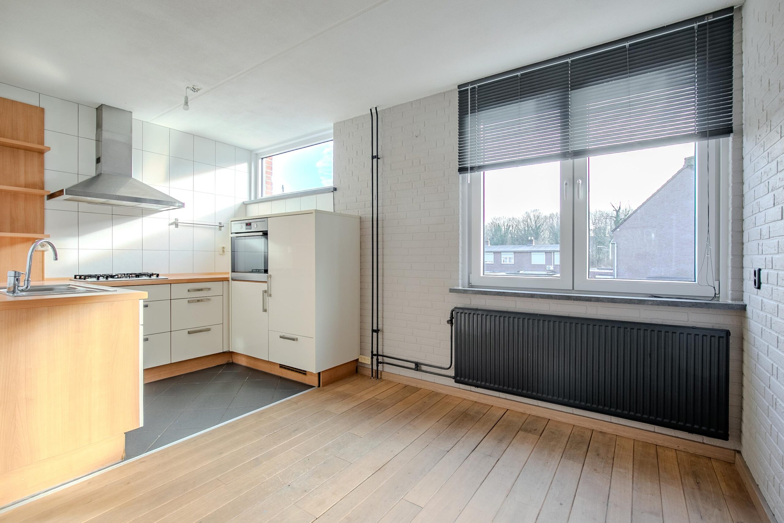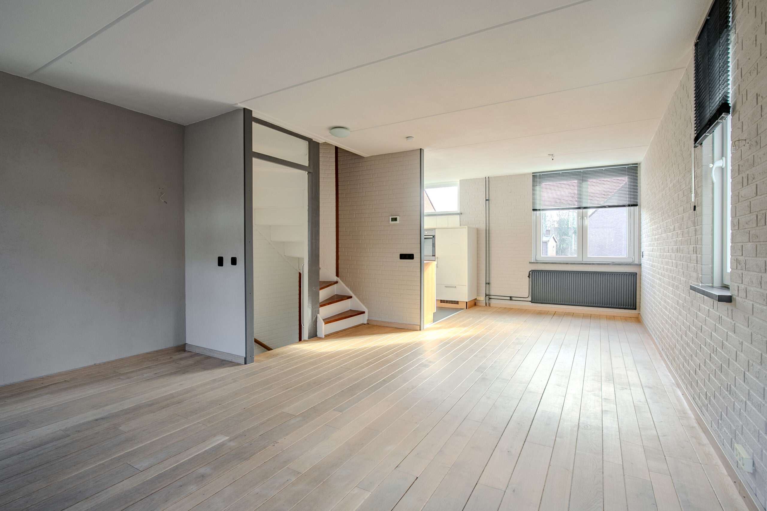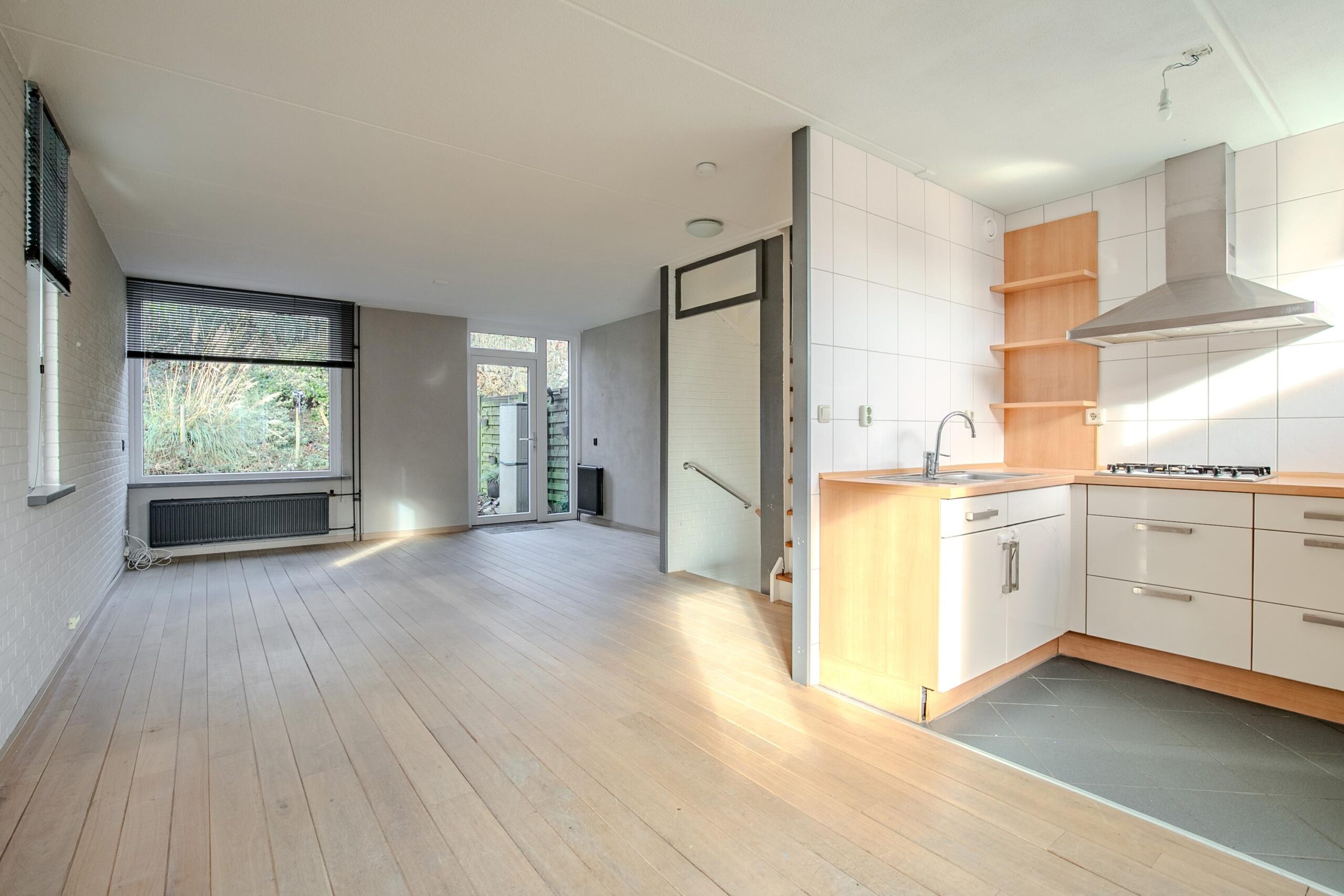 De woonkamer is voorzien van een planken houtenvloer en de keuken van een tegelvloer.