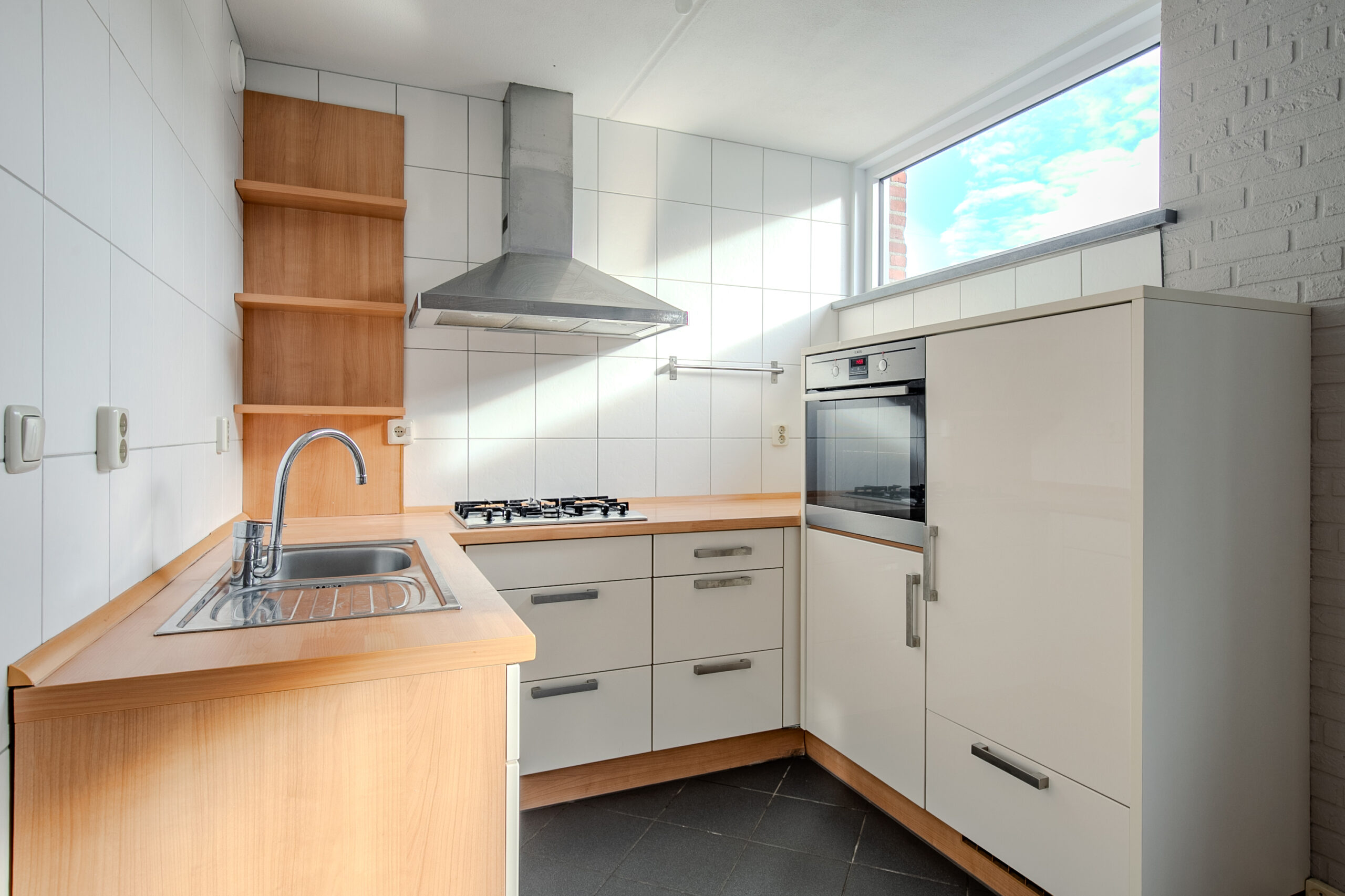 De keuken is voorzien van een hoekopgestelde keukeninrichting met de navolgende apparatuur: 4-pits gaskookplaat, afzuigkap, oven en koelkast.