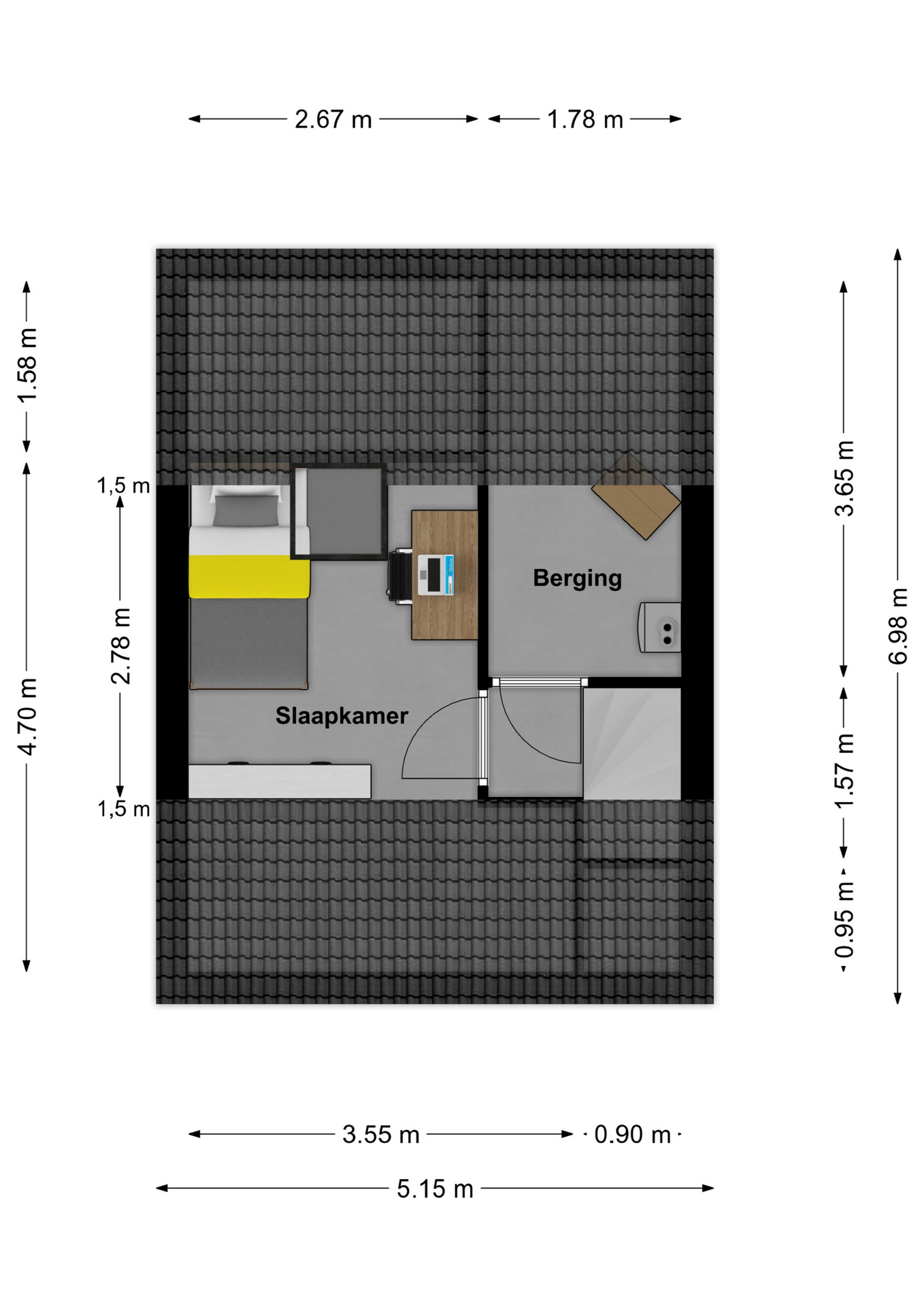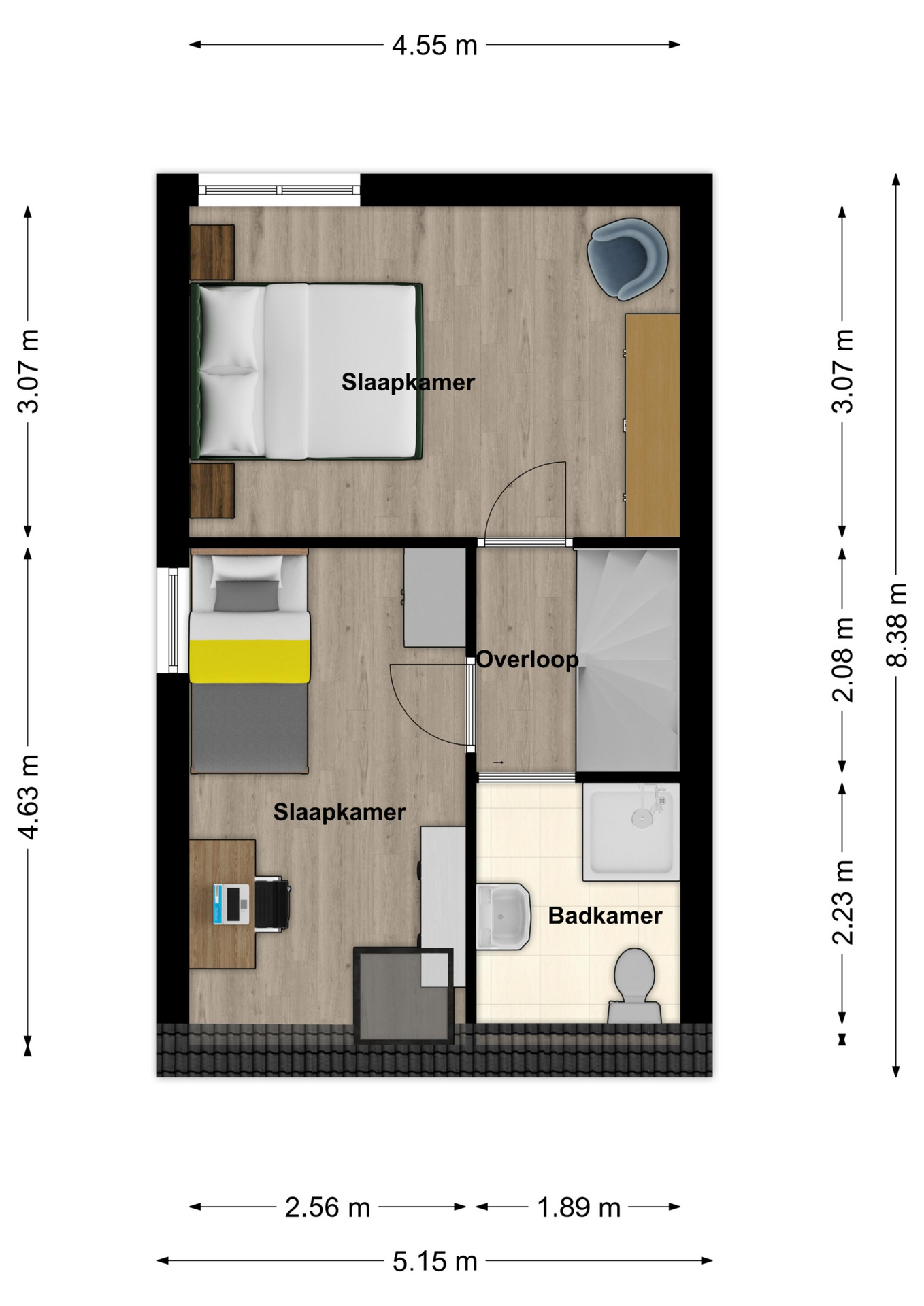 Middels een vaste trap is deze verdieping te bereiken alwaar de 3e slaapkamer zich bevindt.