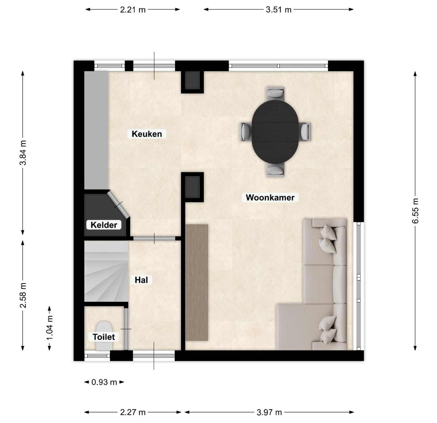 Hal met trapopgang vanuit waar de separate toiletruimte en de open keuken te bereiken zijn. De open keuken is voorzien van een keukenblok in wandopstelling met een inductie kookplaat, afzuigkap, combimagnetron en koelkast. De keuken biedt toegang tot de knusse woonkamer met airconditioning welke een goede mate van daglichttoetreding geniet door de raampartijen aan de zij- en achterzijde van de woning.