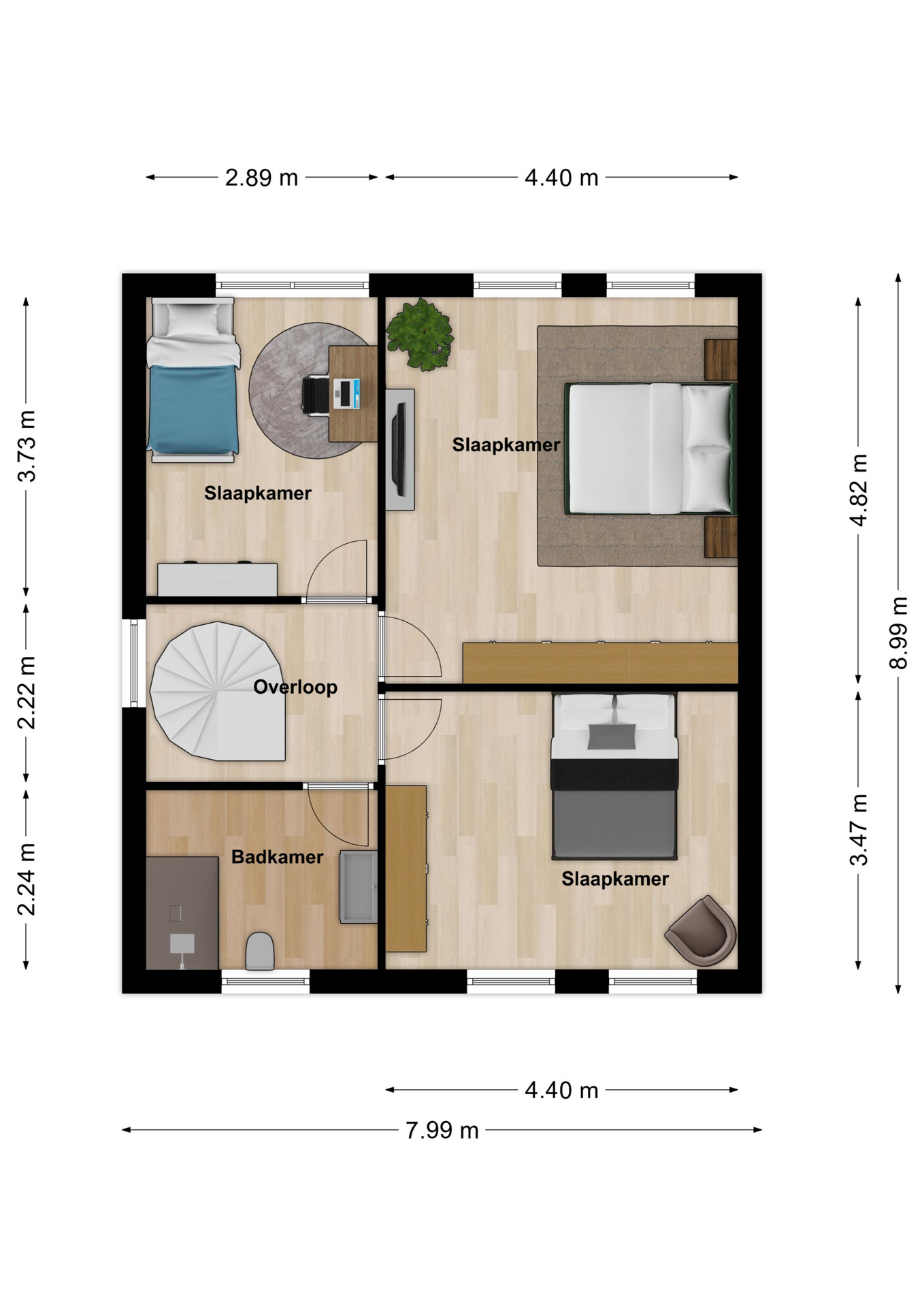 Alle slaapkamers zijn voorzien van laminaatvloer en rolluiken.