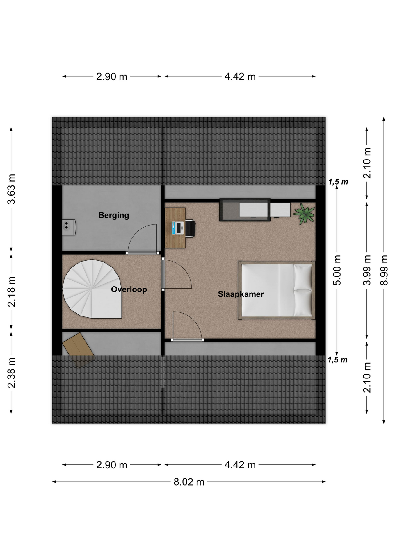 De 2e verdieping is bereikbaar via vaste trap. Overloop met bergruimte alwaar zich de cv-ketel bevindt (huurtoestel via Feenstra, bwj. 2014). Vierde slaapkamer met dakraam en extra bergruimte, alwaar de omvormer voor de 19 zonnepanelen.