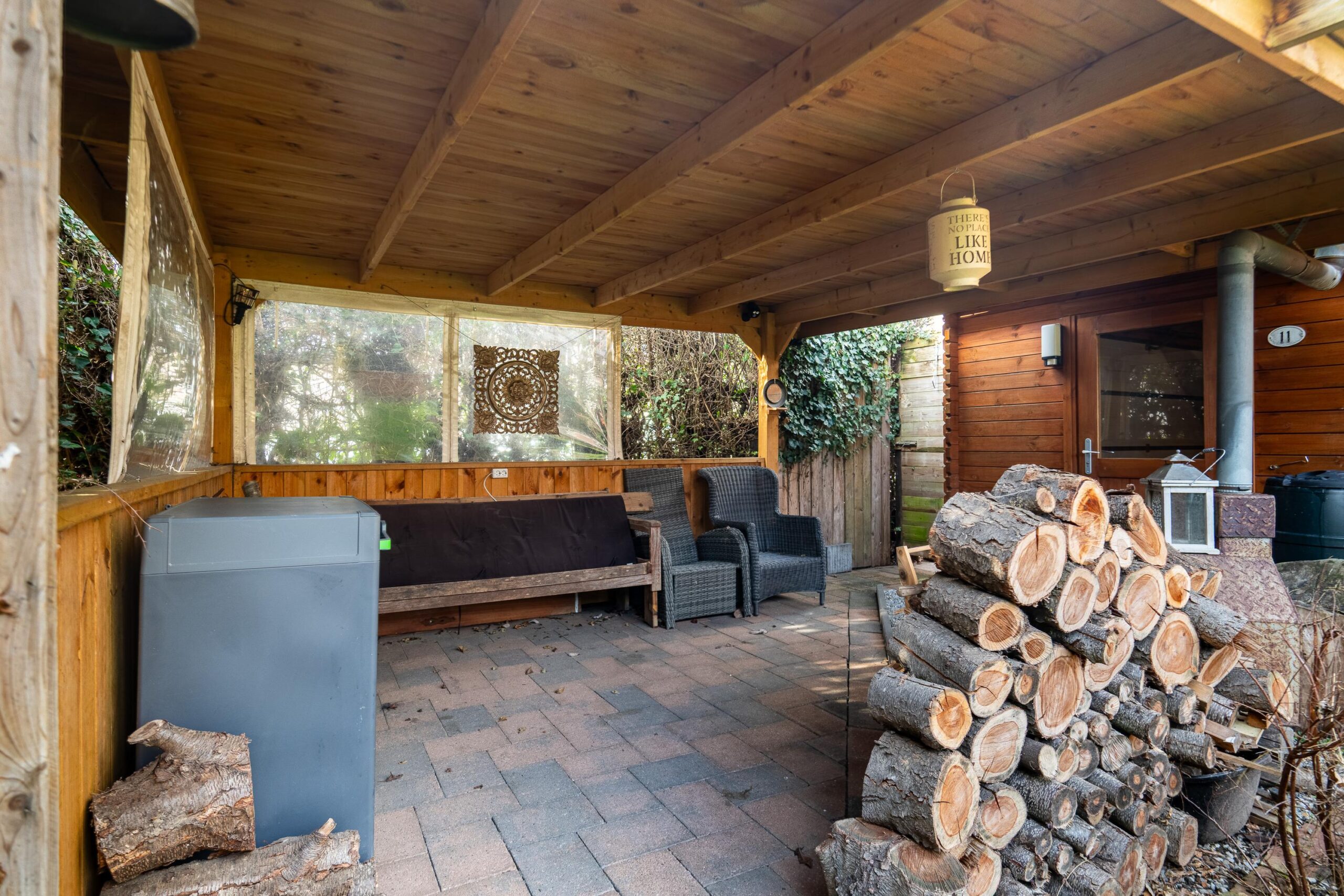 De zonnige tuin is fraai aangelegd, met riant beklinkerd en overdekt terras met gazon. Achter in de tuin bevindt zich een riante houten overkapping, een achteringang en de 2e garage welke ook is voorzien van een elektrisch bedienbare sectionaal poort en aansluiting voor het opladen van een elektrische auto.