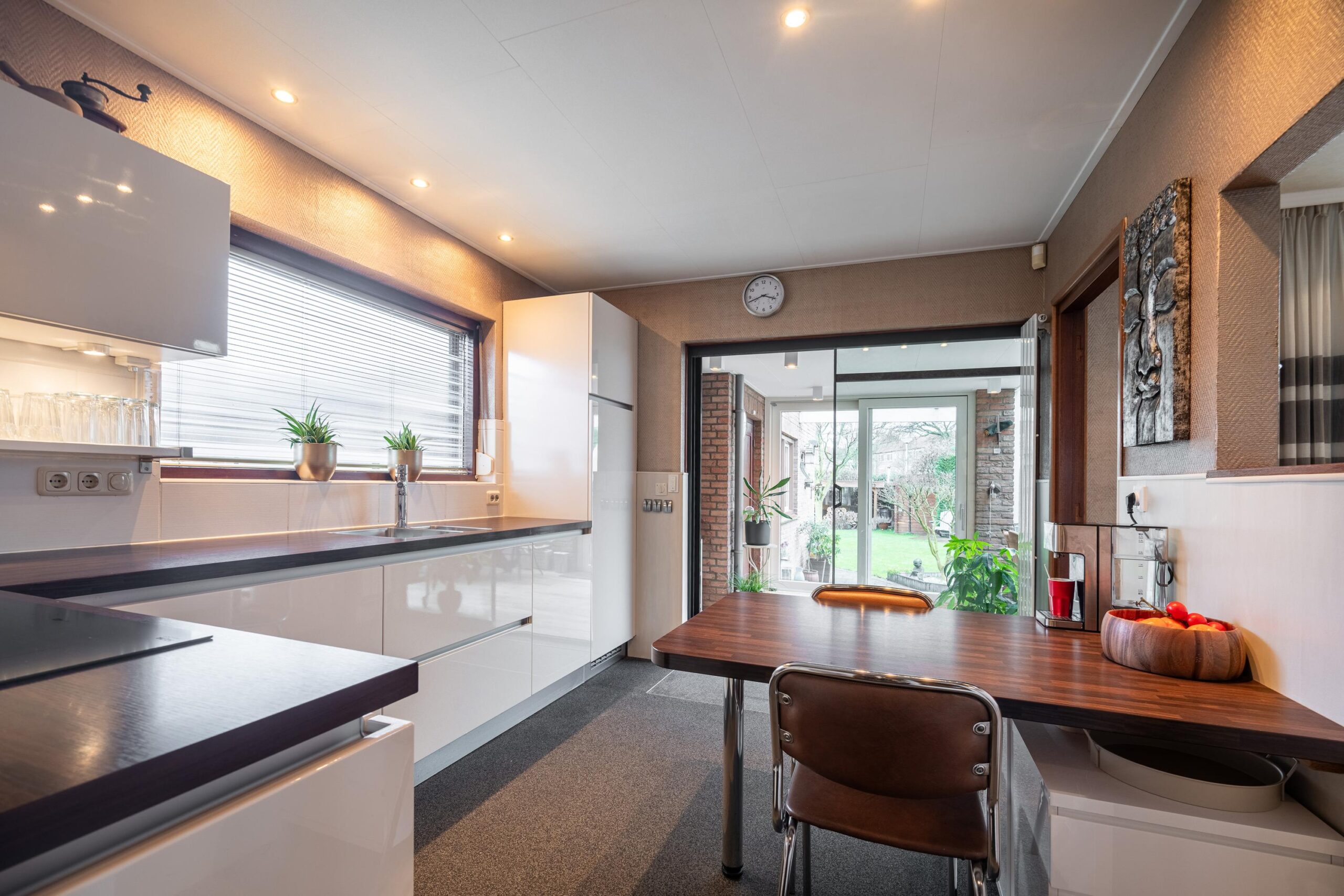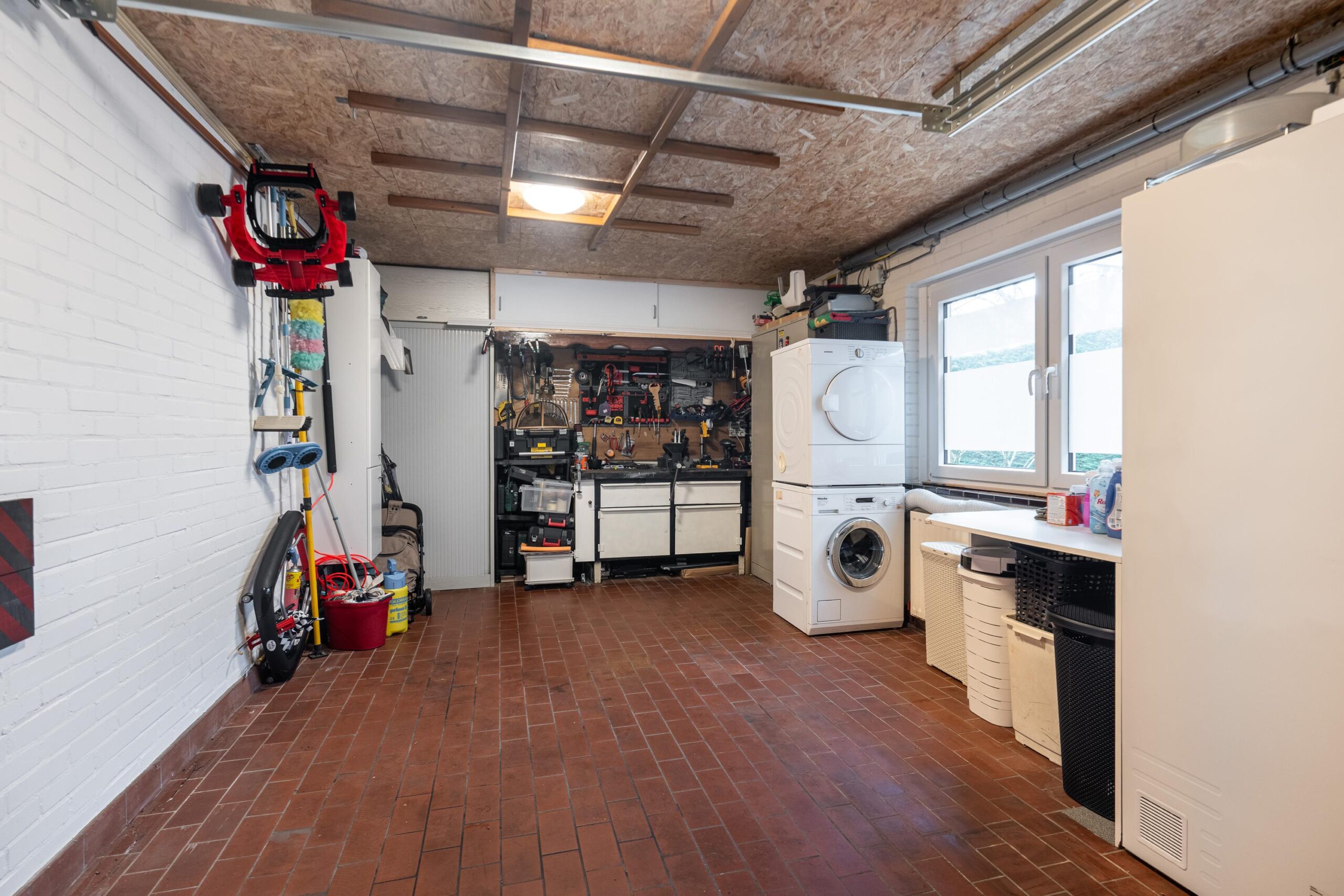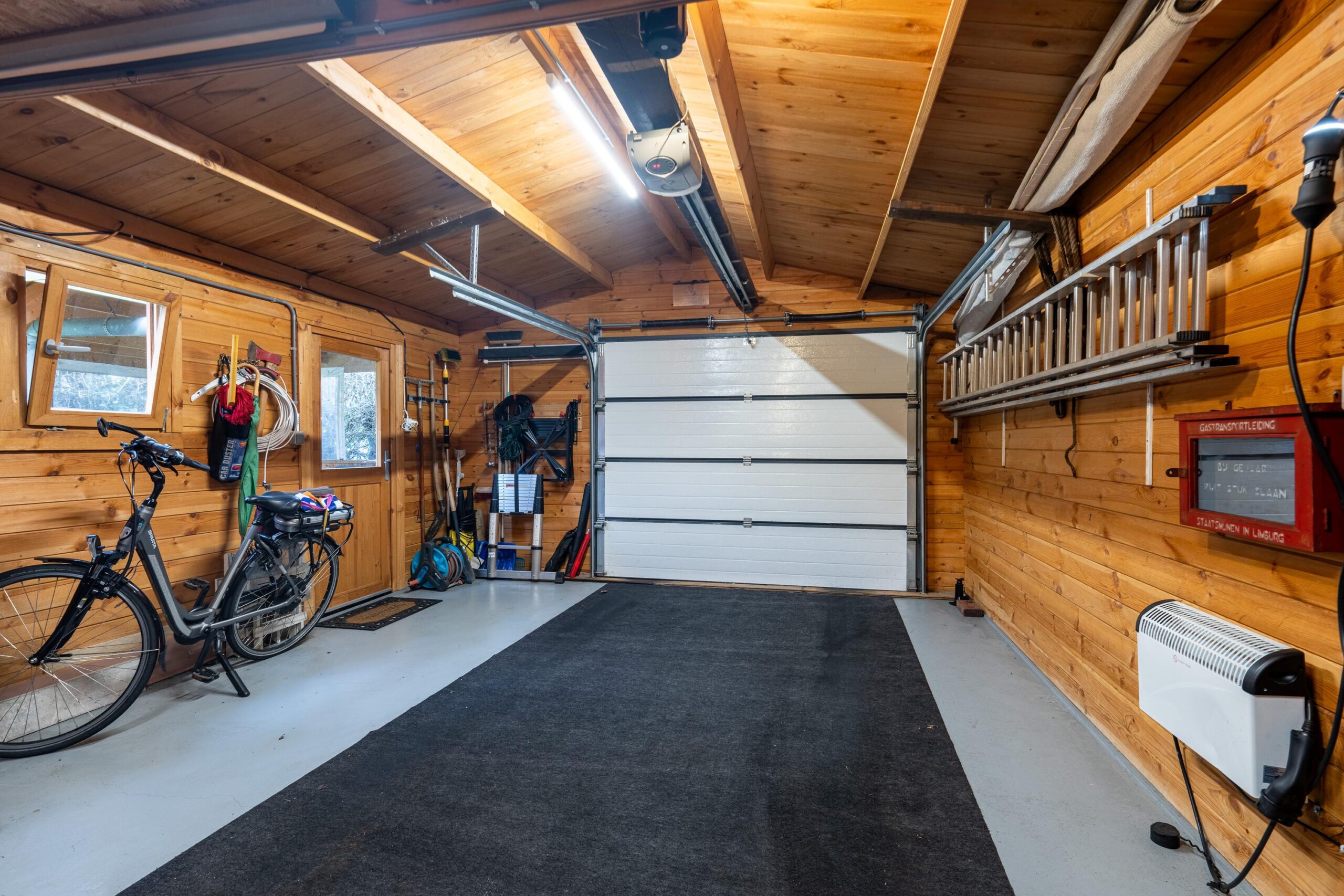 Vanuit de serre heeft men toegang tot de geïsoleerde garage. De garage is voorzien van een elektrisch bedienbare sectionaalpoort, verwarming en aansluitpunt voor witgoed.