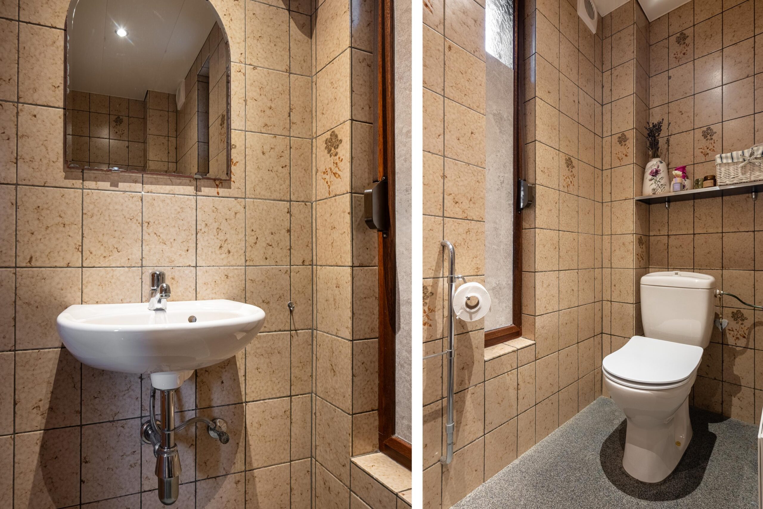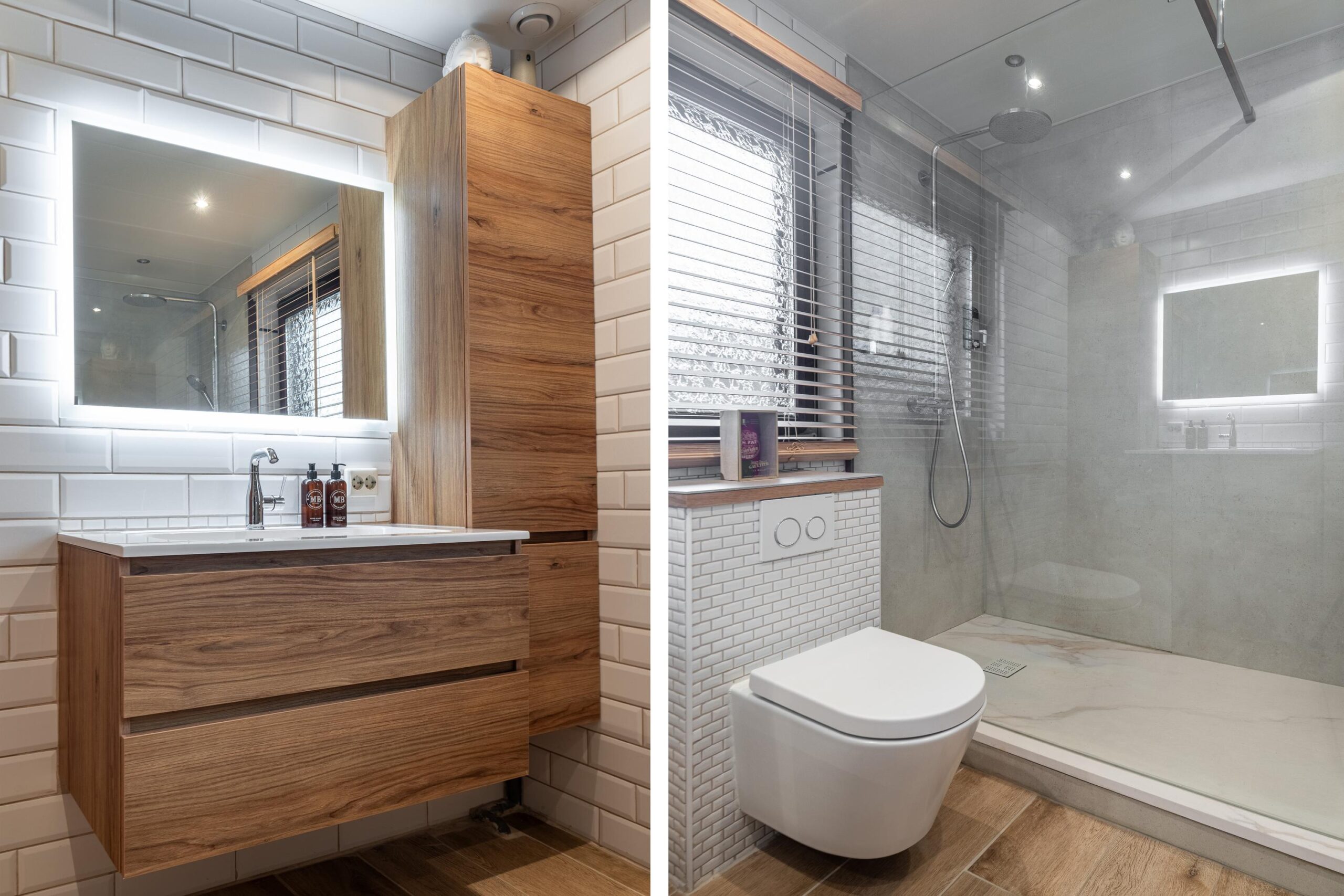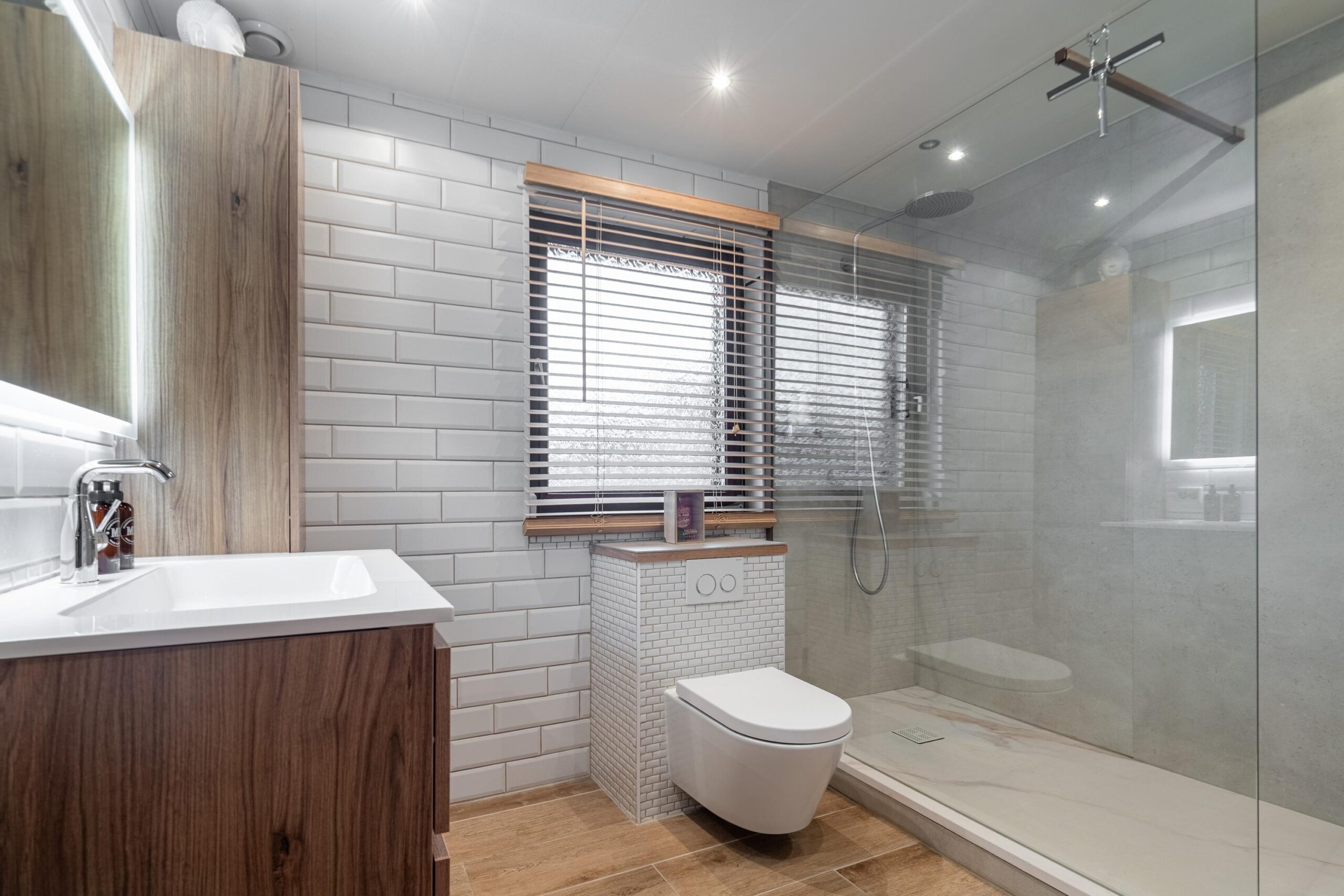 De in 2023 vernieuwde, betegelde badkamer is voorzien van elektrische vloerverwarming, inloopdouche, 2e toilet, badmeubel met wastafel en designradiator.