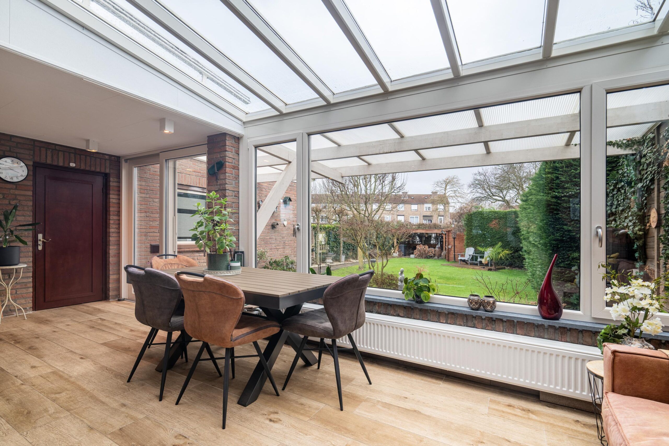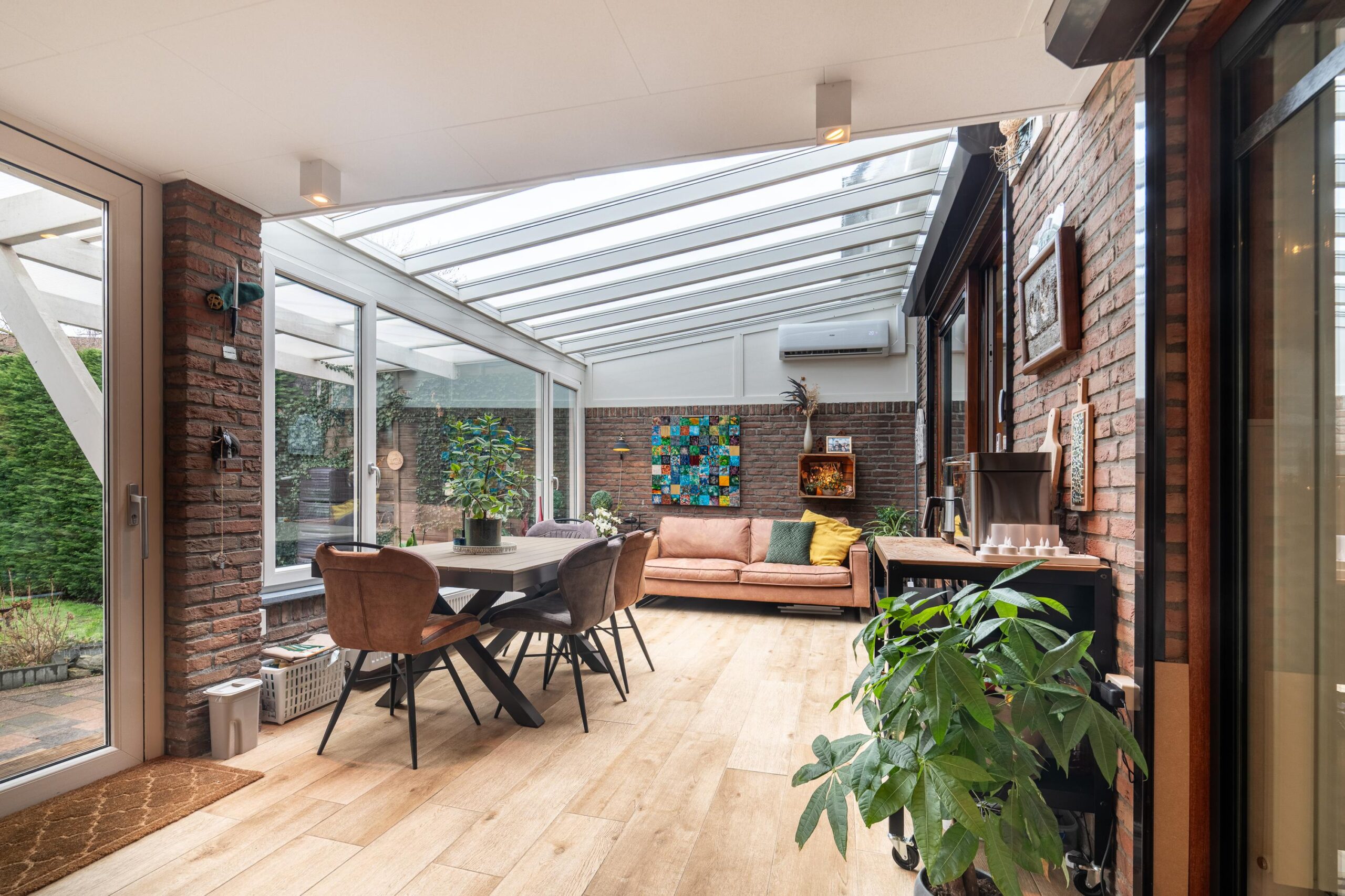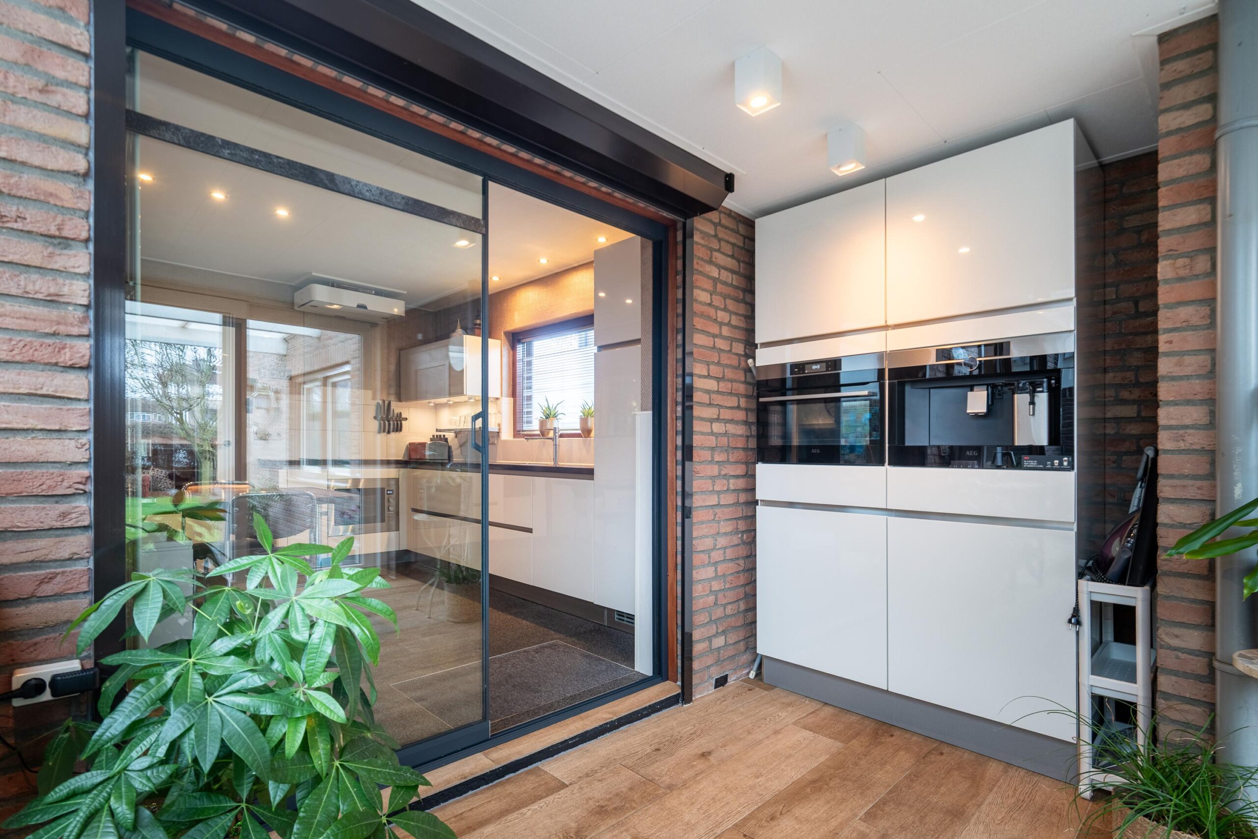 De fraaie serre is zowel vanuit de woonkamer als vanuit de keuken bereikbaar (beide middels schuifpui) en biedt extra wooncomfort door de vele lichtinval, een airco voor extra verkoeling in de zomer en een elektrisch bedienbaar zonnescreen. De serre is voorzien van een fraaie plavuizenvloer en tevens is hier een verlengstuk van de keuken geplaatst met hierin een extra oven en een inbouwkoffiemachine.