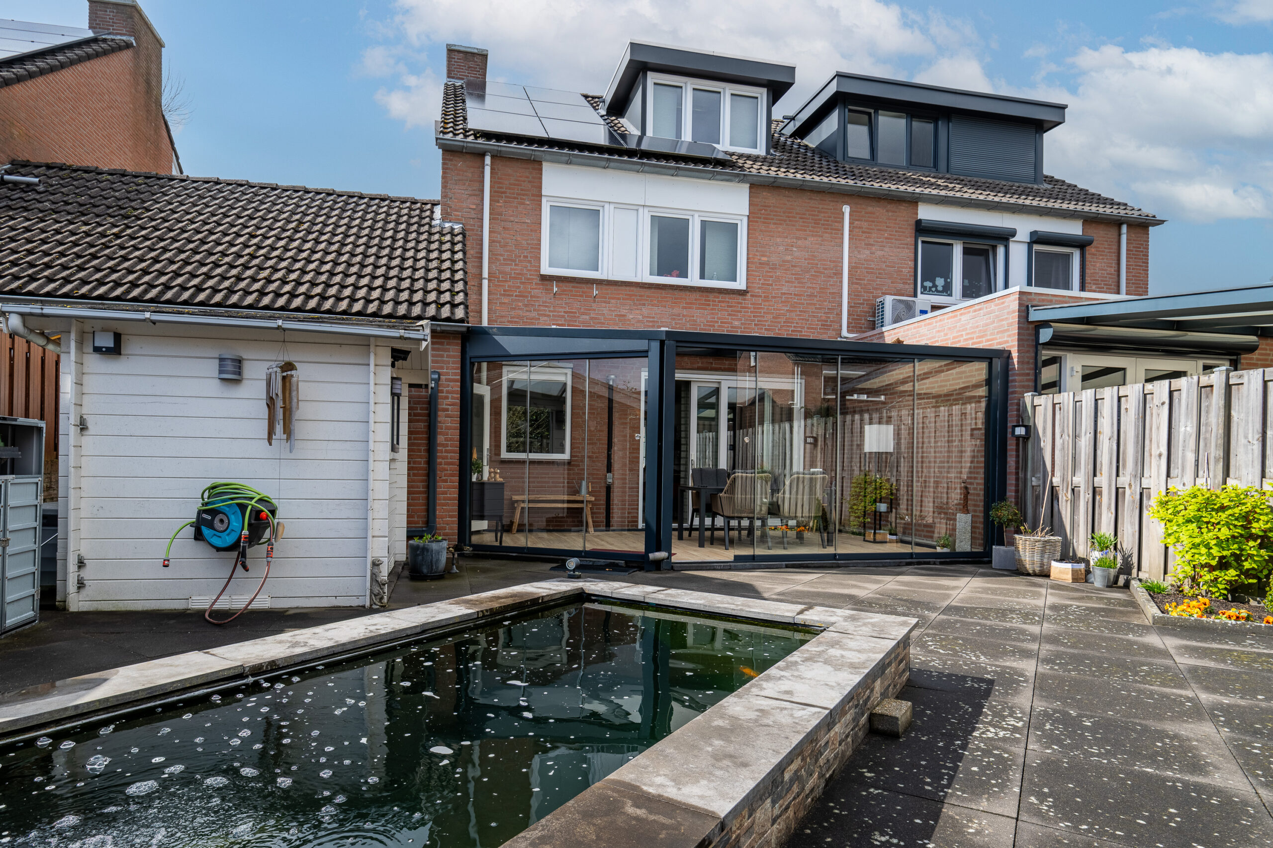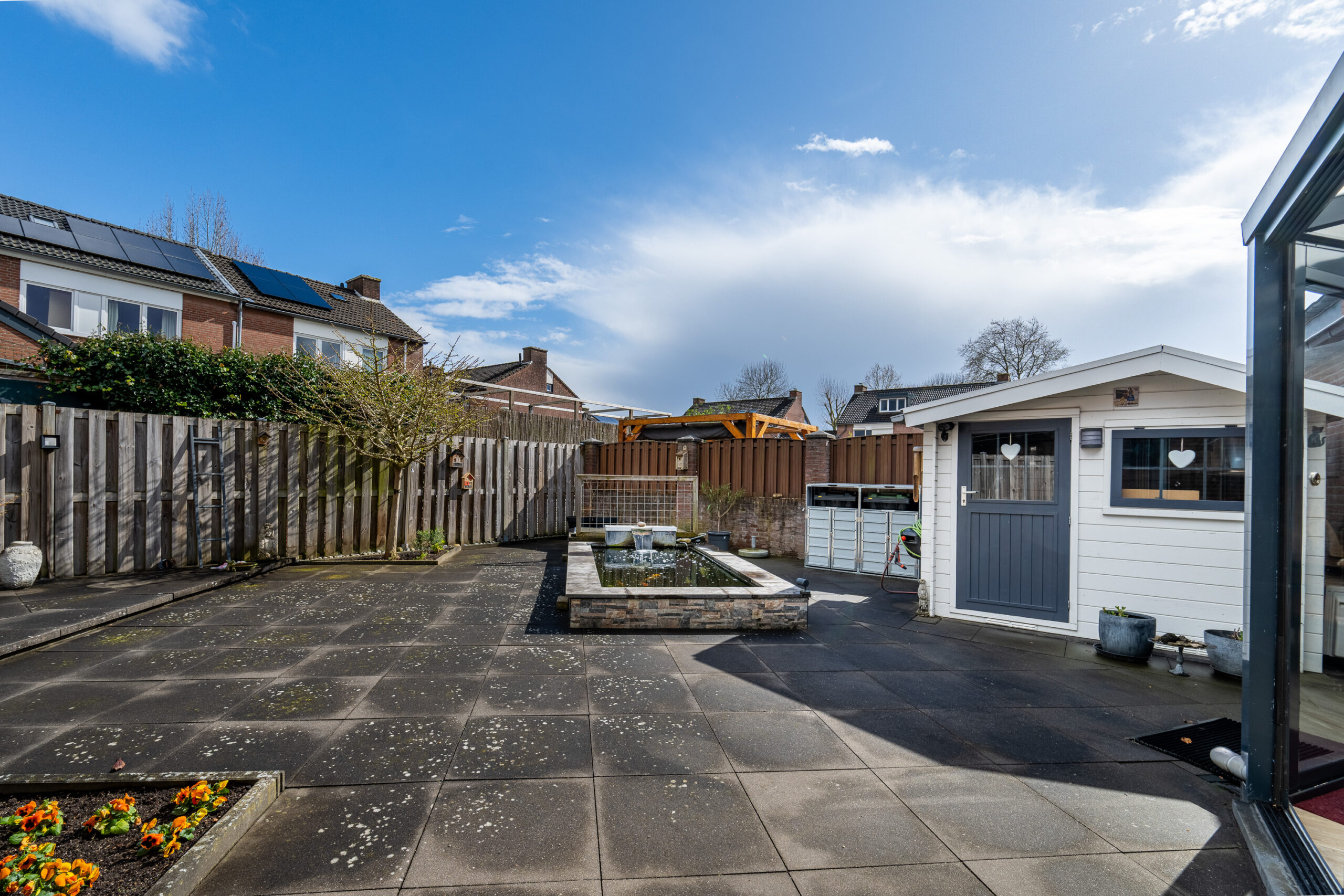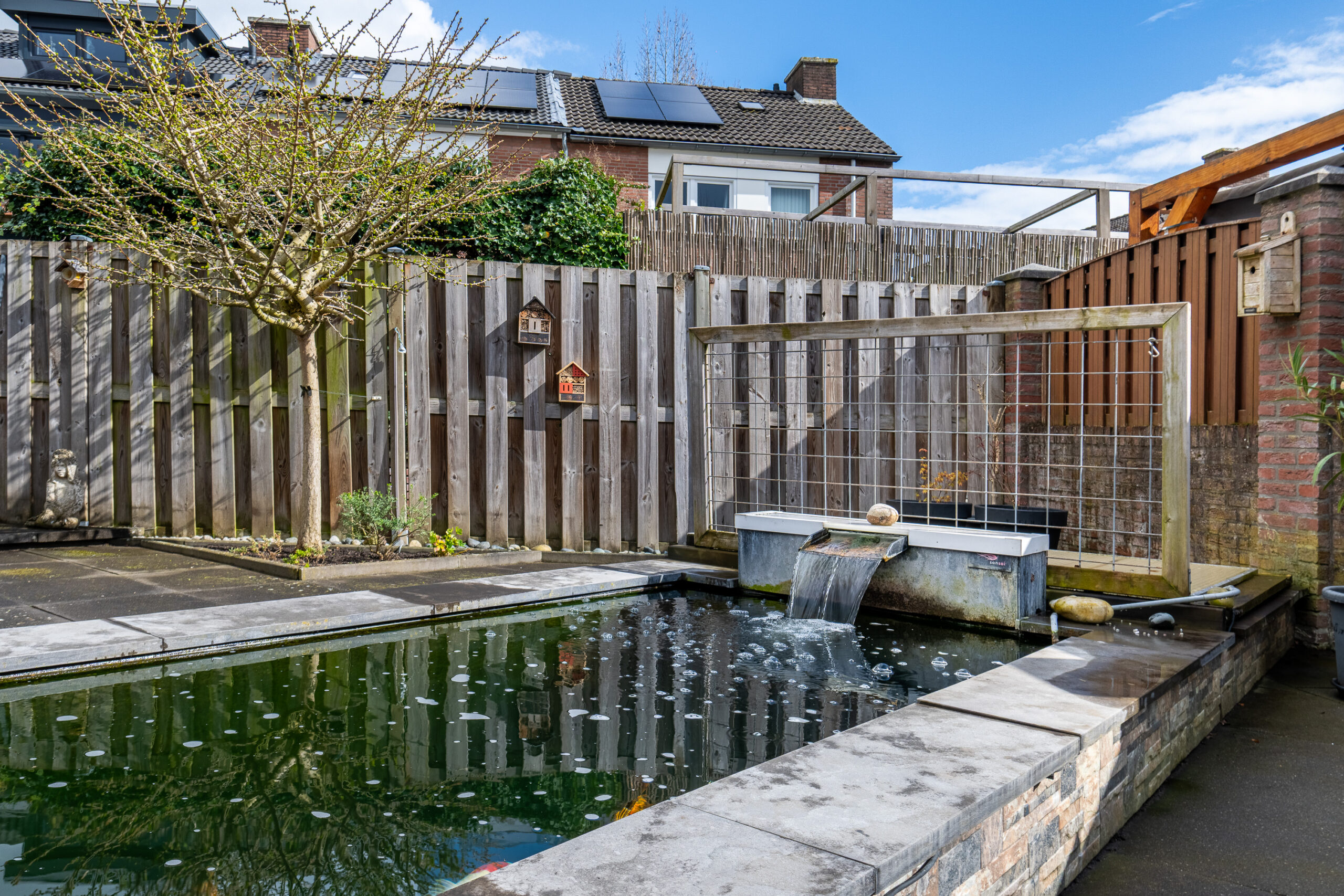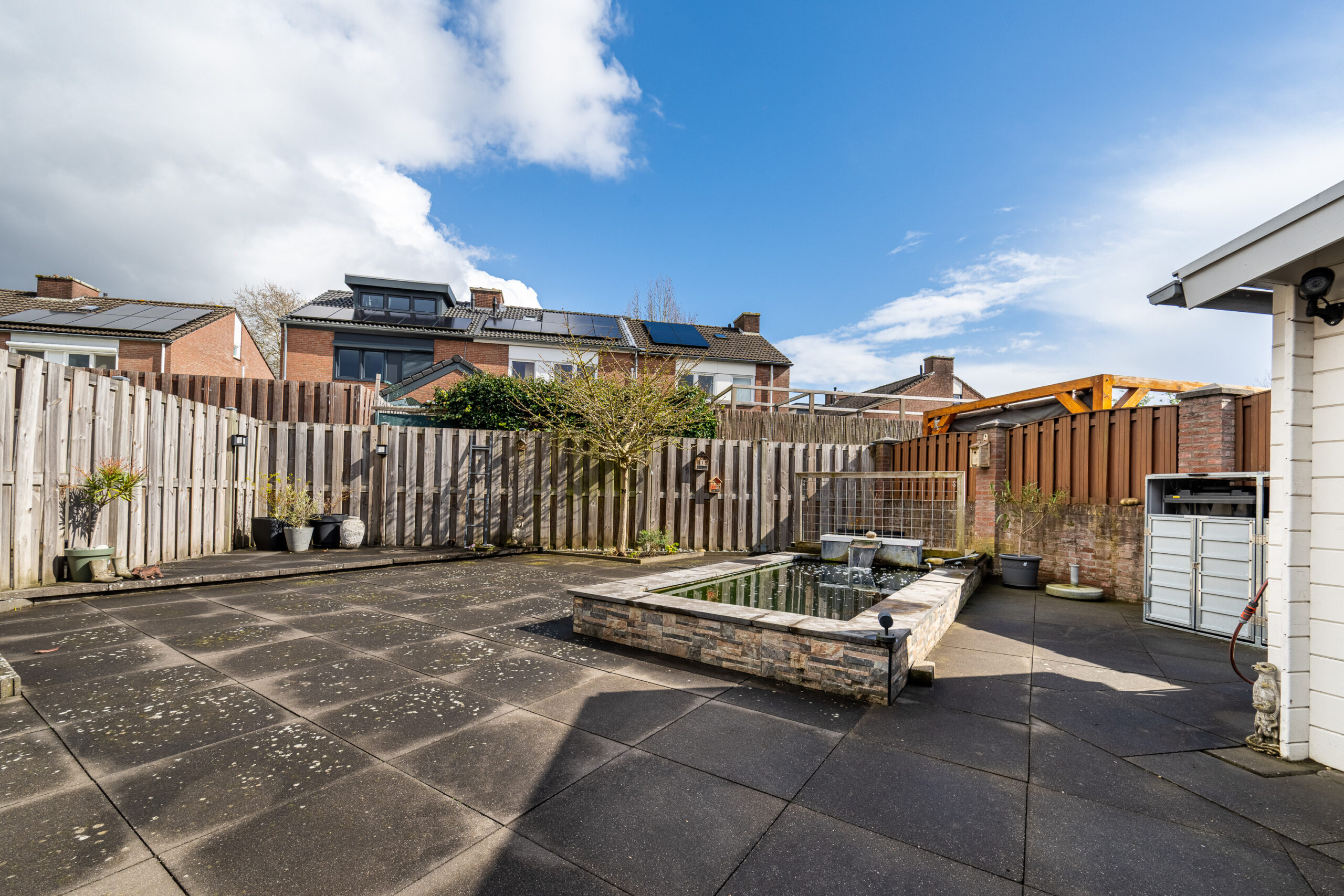 De tuin is geheel omsloten, voorzien van een fraaie vijverpartij en houten tuinhuis en biedt voldoende privacy. Achterom is er tevens een mogelijkheid om een uit/ingang te maken naar het achtergelegen (voet)pad (mandelig pad).