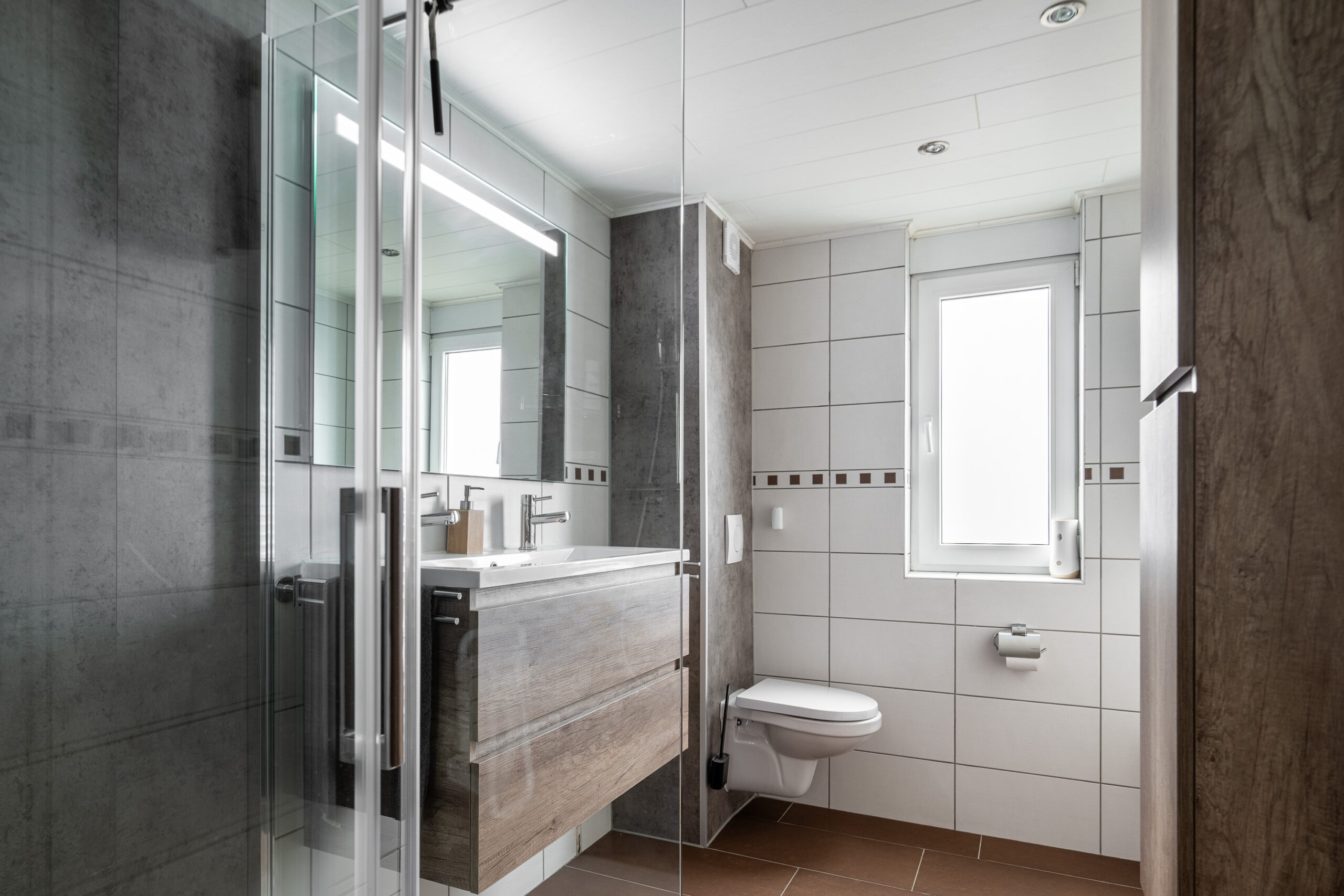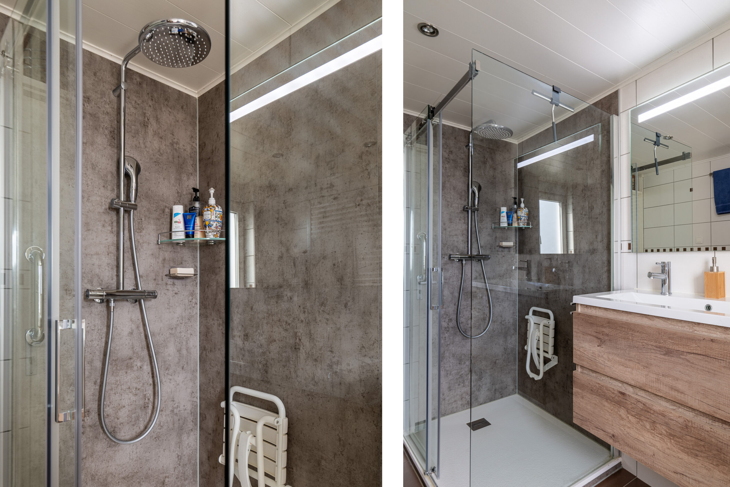Geheel betegelde badkamer (vernieuwd in 2022) voorzien van inloopdouche, 2e toilet, designradiator en badmeubel met wastafel.