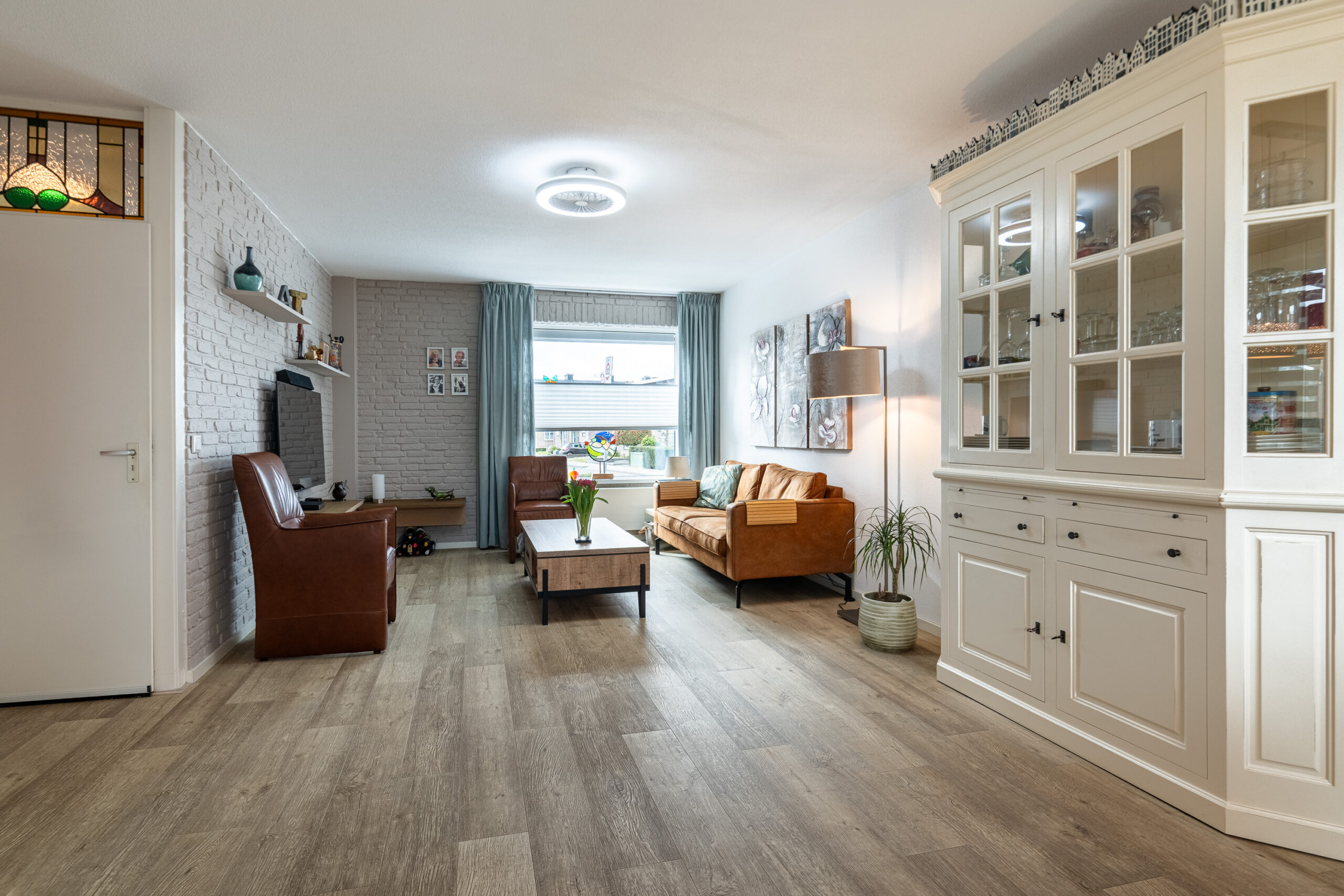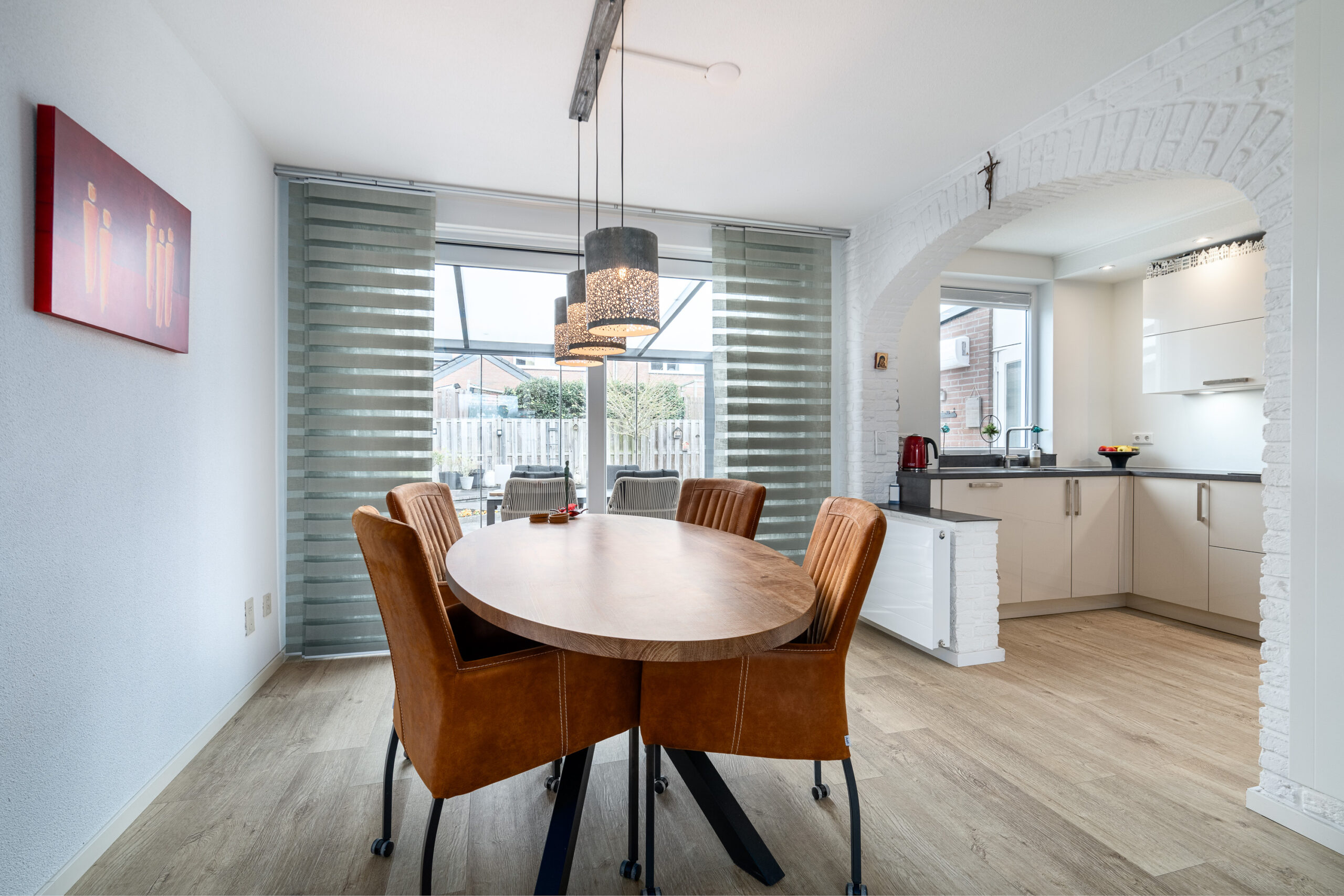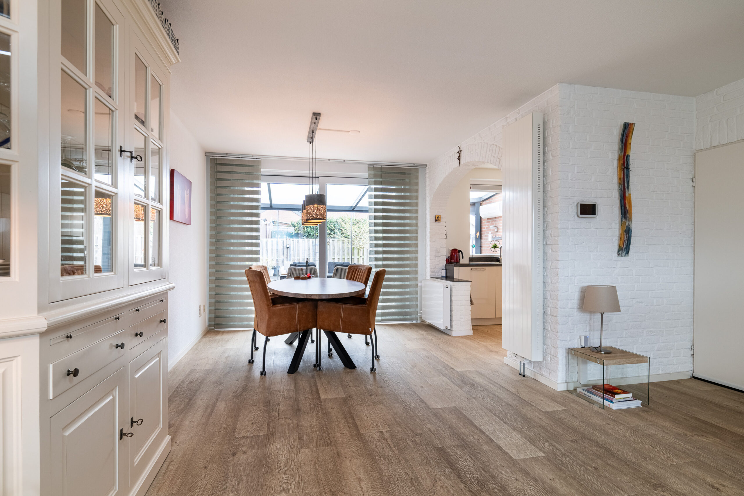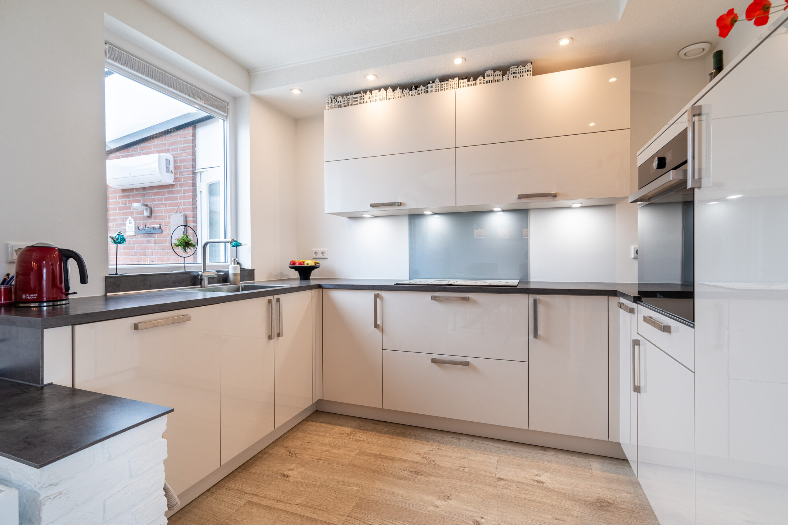 Hal/entree alwaar meterkast (vernieuwd). Betegeld toilet met vrijhangend toilet en fonteintje. Ruime woonkamer met veel lichtinval wat zorgt voor een prettige woonsfeer. bergkast onder de trap. Aansluitend de open keuken, welke in 2022 geheel is vernieuwd en voorzien van de navolgende apparatuur: inductiekookplaat Bora met geïntegreerde afzuiging, vaatwasser en koelkast. Vanuit de keuken is middels schuifpui de fraaie serre bereikbaar, welke is voorzien van tegelvloer en airconditioning voor zowel koelen als verwarmen.