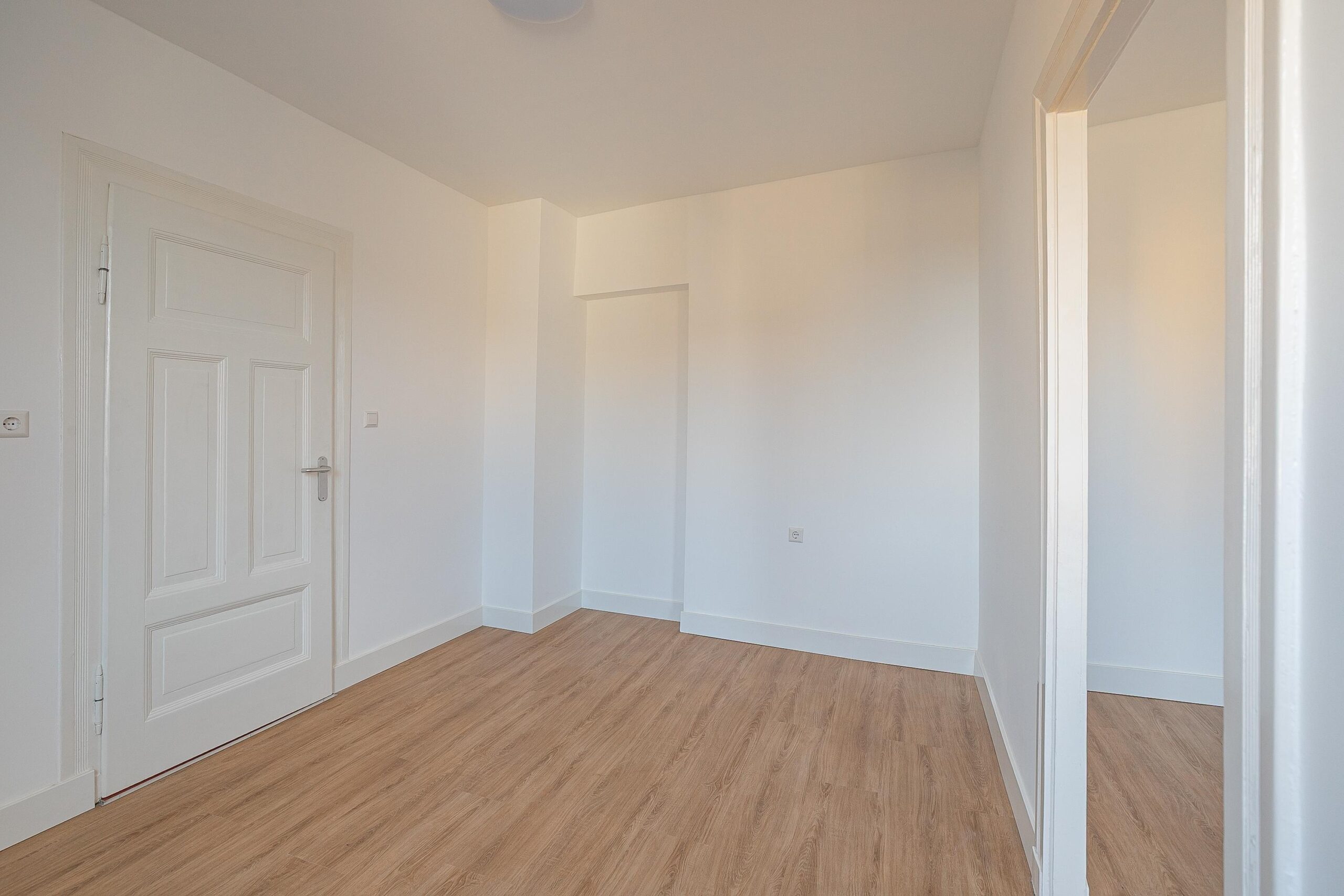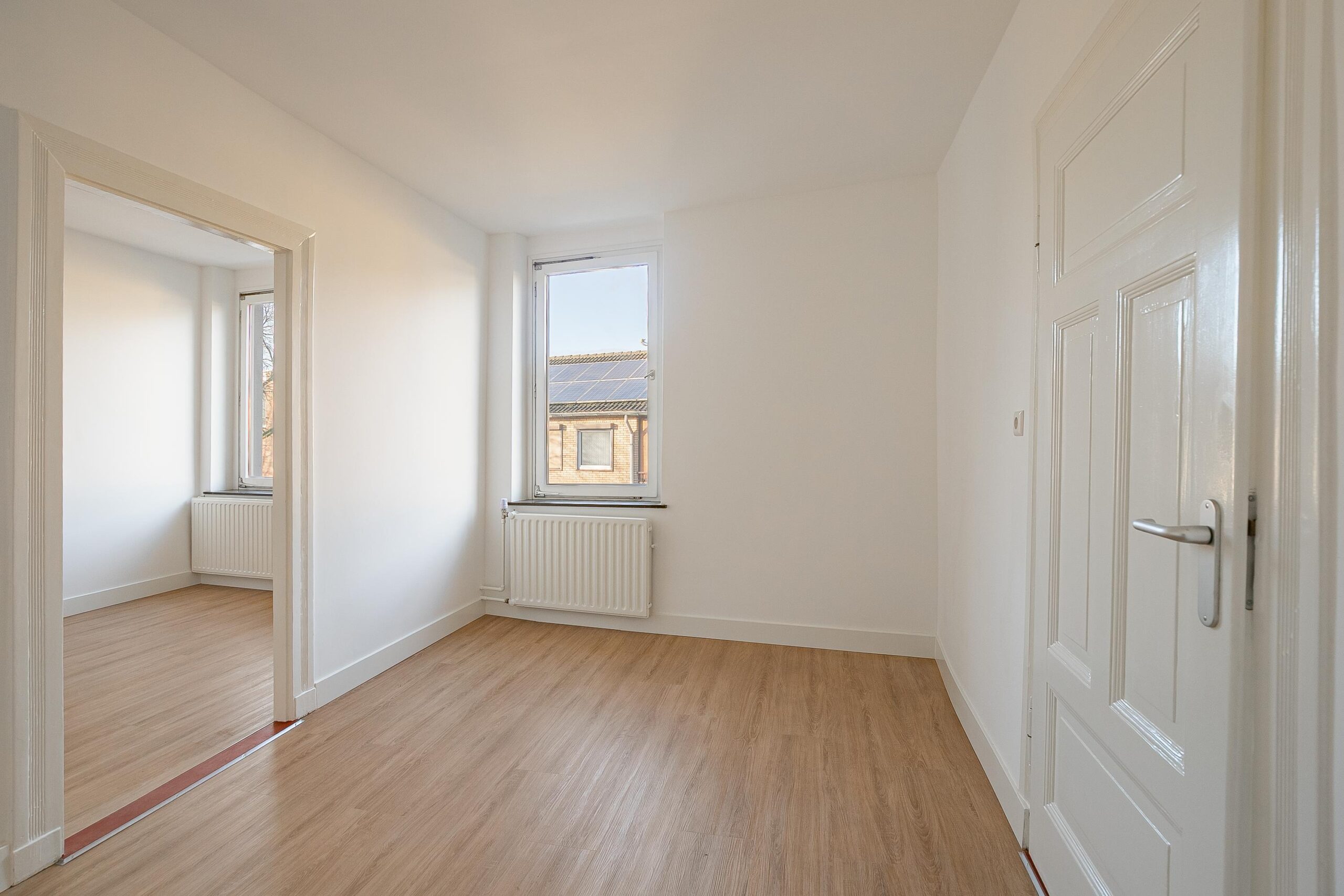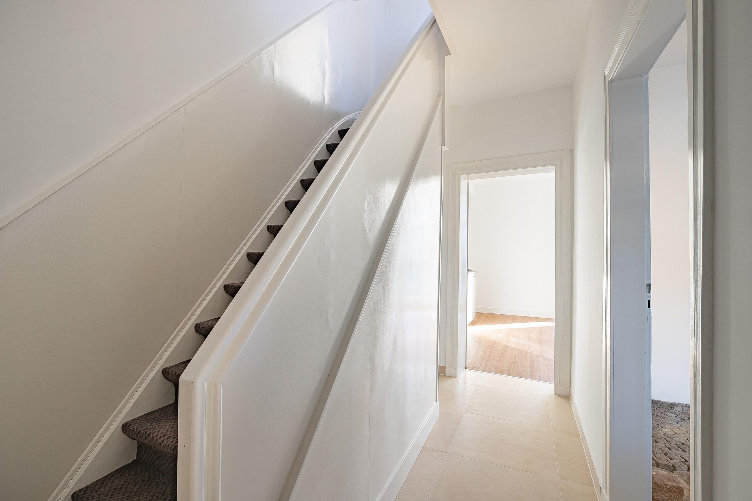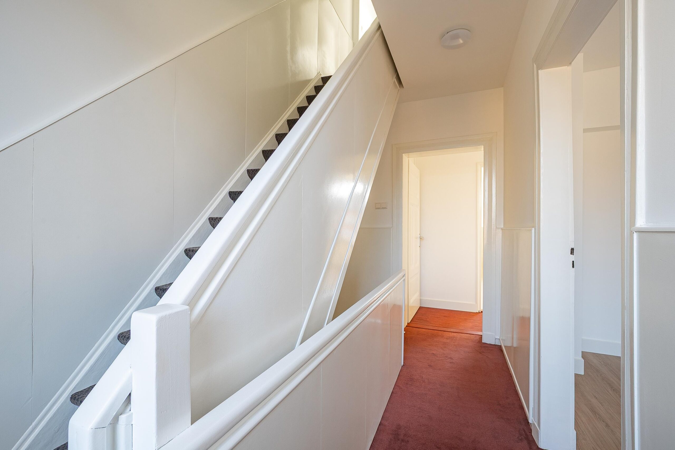 Overloop met vloerbedekking en toegang tot drie slaapkamers en de badkamer. Tevens is er op de overloop een praktische muurkast aanwezig. Aan de voorzijde bevinden zich de eerste twee slaapkamers. Aan de achterzijde is de derde slaapkamer gelegen. Alle slaapkamers zijn voorzien van laminaatvloeren en strak gestucte wanden. De ruime, betegelde badkamer beschikt over een douche, tweede toilet, wastafel en aansluitpunten voor wasmachine en droger.