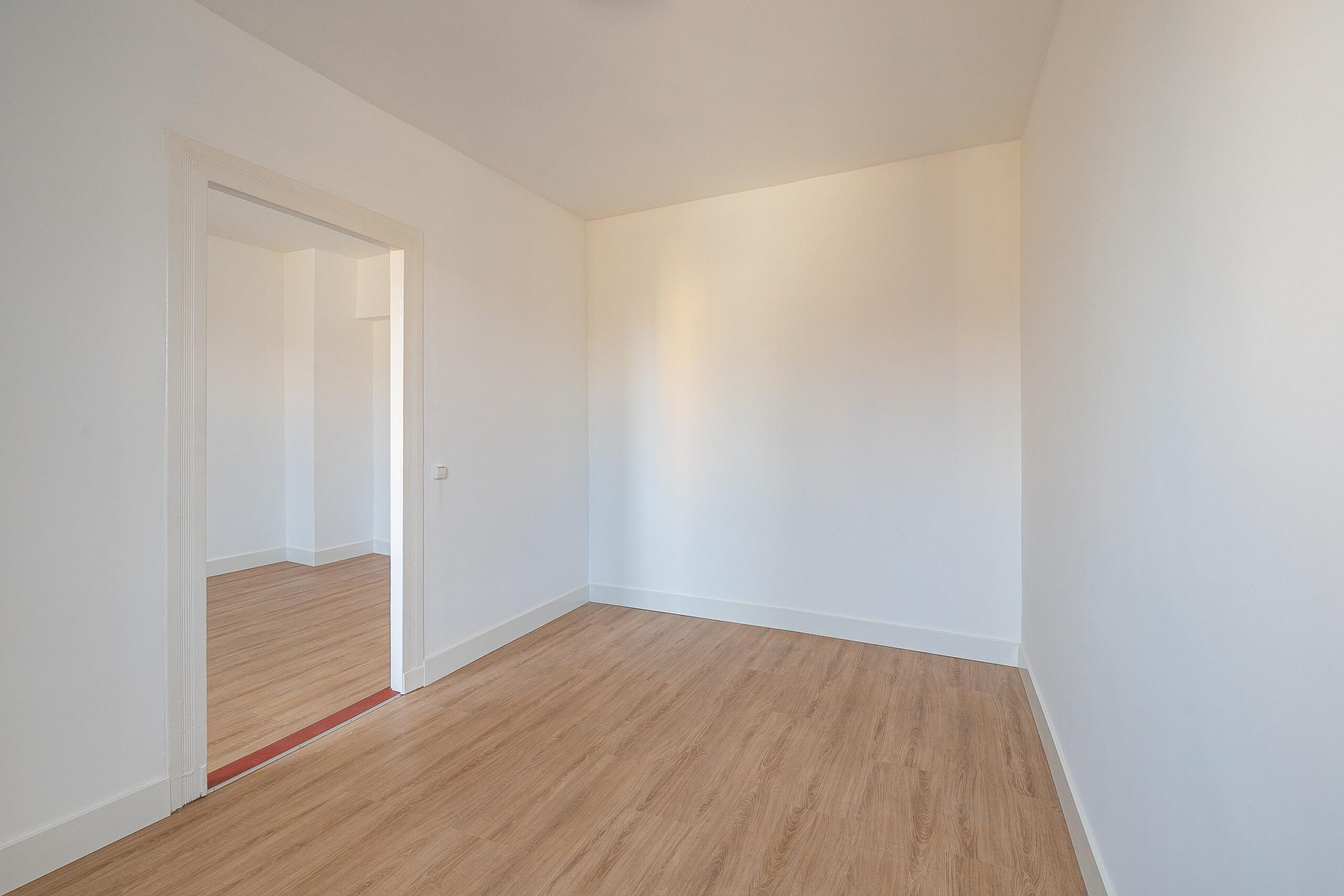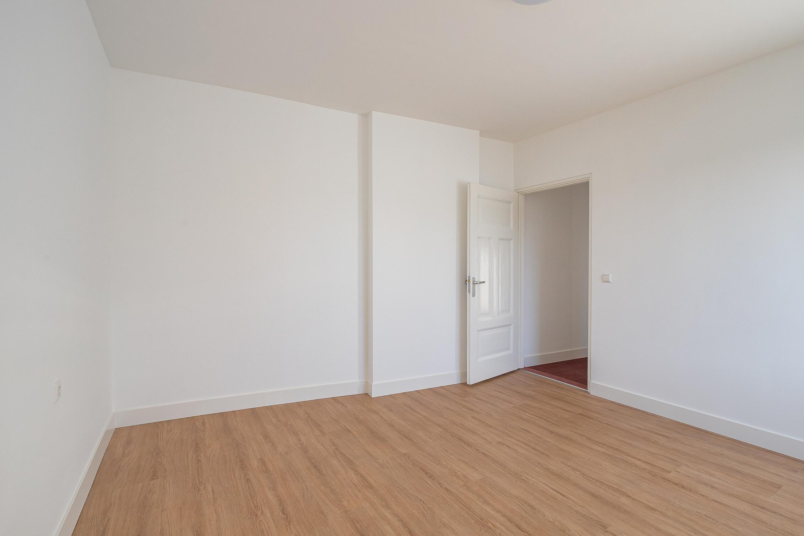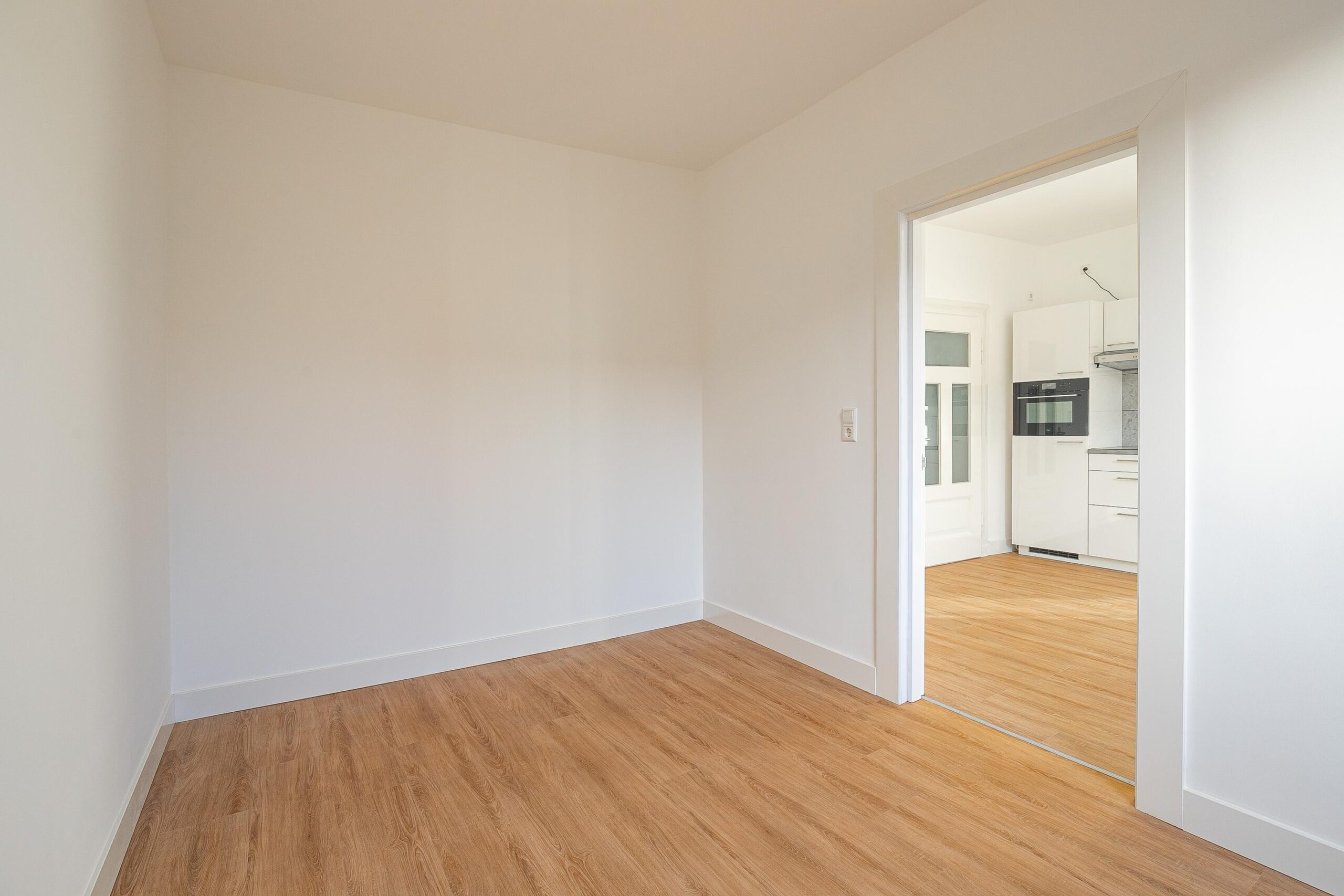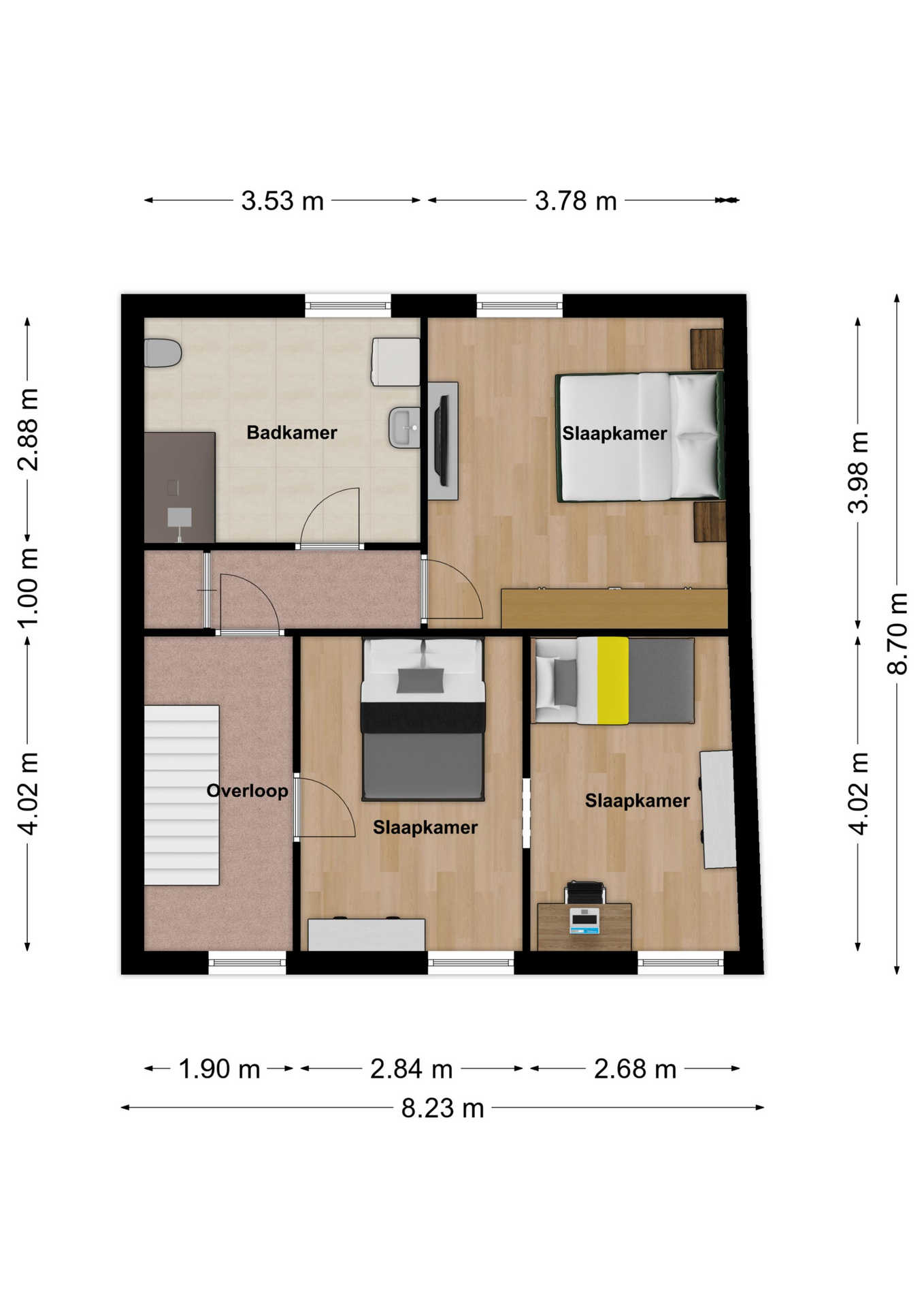 Overloop met vloerbedekking en toegang tot drie slaapkamers en de badkamer. Tevens is er op de overloop een praktische muurkast aanwezig. Aan de voorzijde bevinden zich de eerste twee slaapkamers. Aan de achterzijde is de derde slaapkamer gelegen. Alle slaapkamers zijn voorzien van laminaatvloeren en strak gestucte wanden. De ruime, betegelde badkamer beschikt over een douche, tweede toilet, wastafel en aansluitpunten voor wasmachine en droger.
