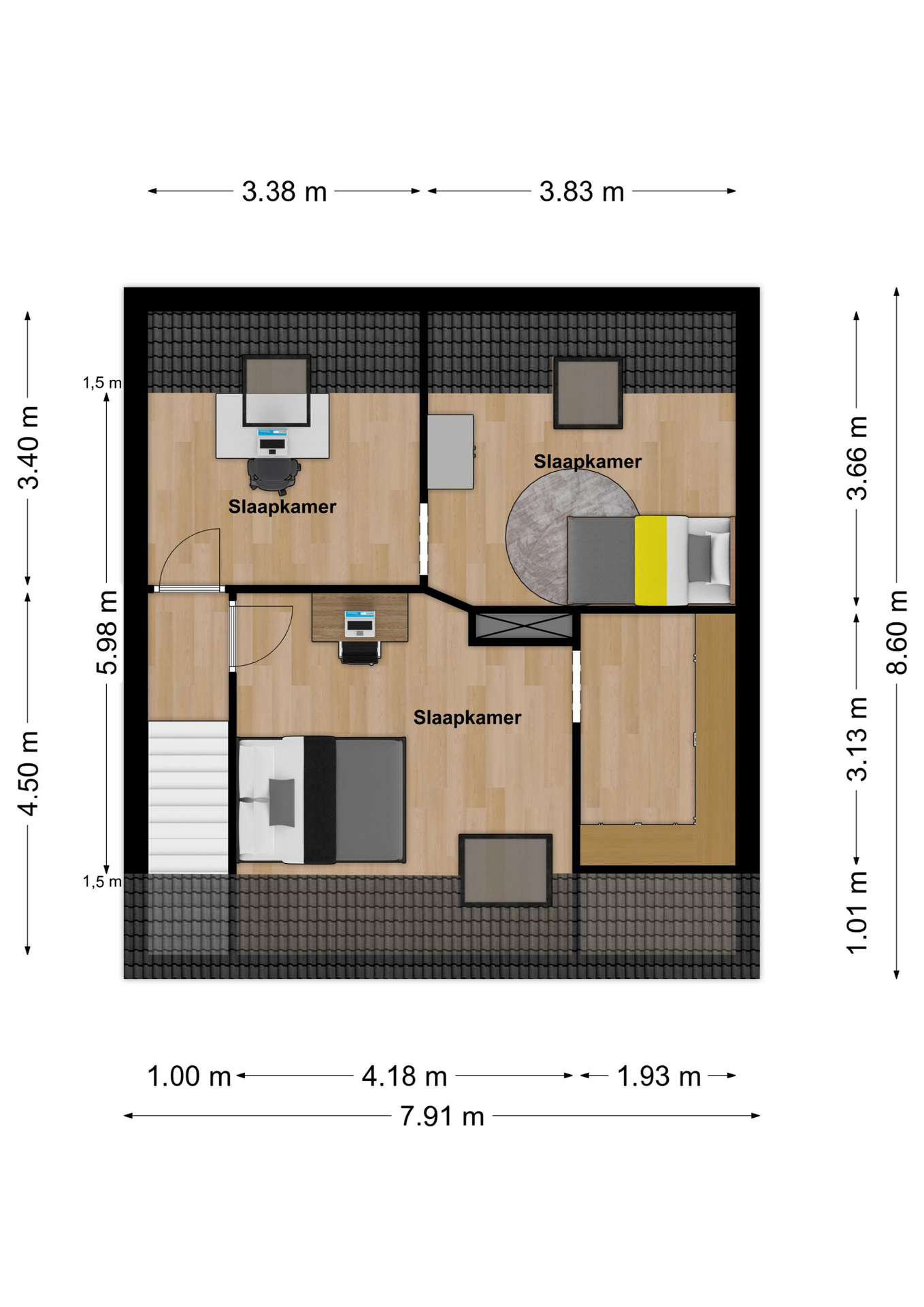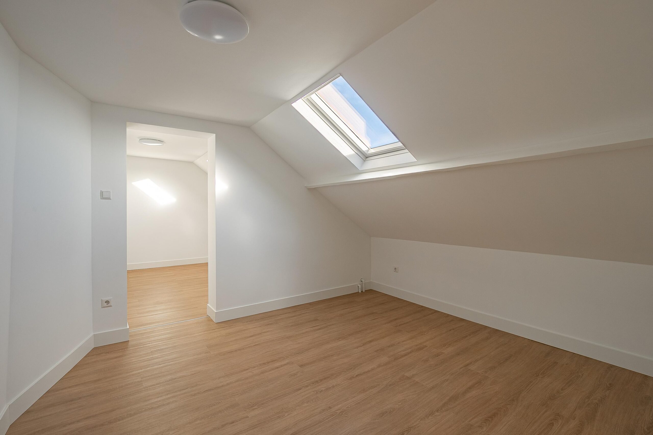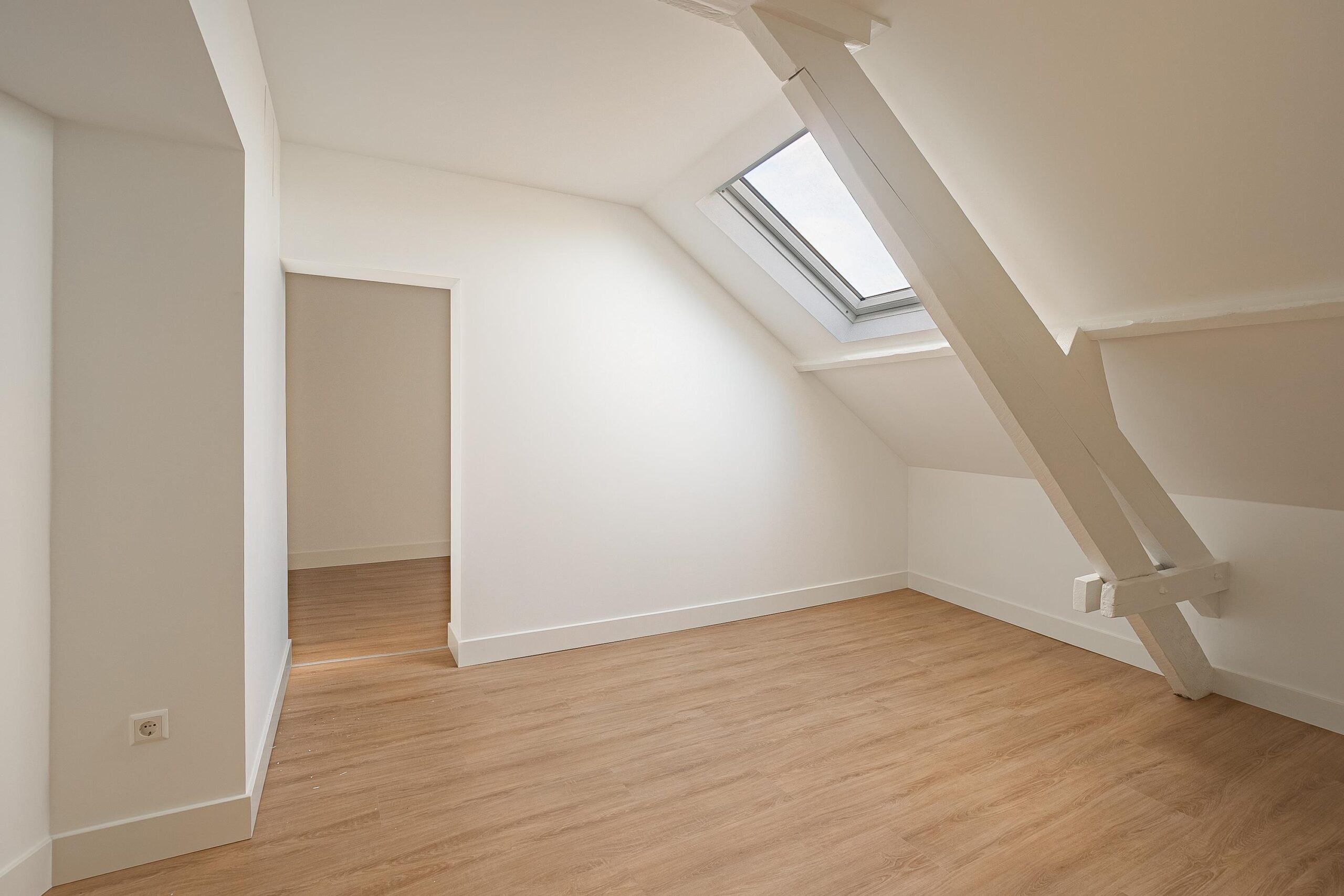 De tweede verdieping beschikt over drie slaapkamers. Alle slaapkamers zijn voorzien van laminaatvloeren, strak gestucte wanden en een Velux dakraam. De slaapkamer aan de voorzijde gelegen biedt directe toegang tot een walk in closet.