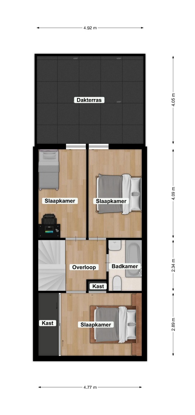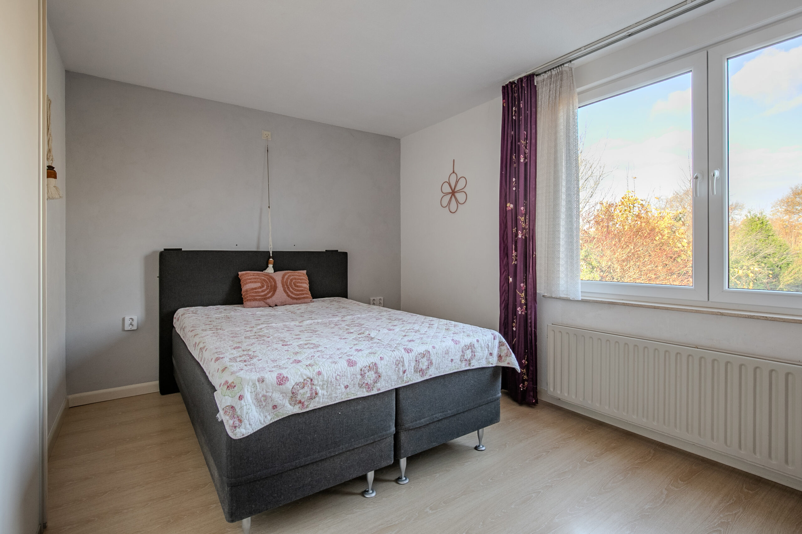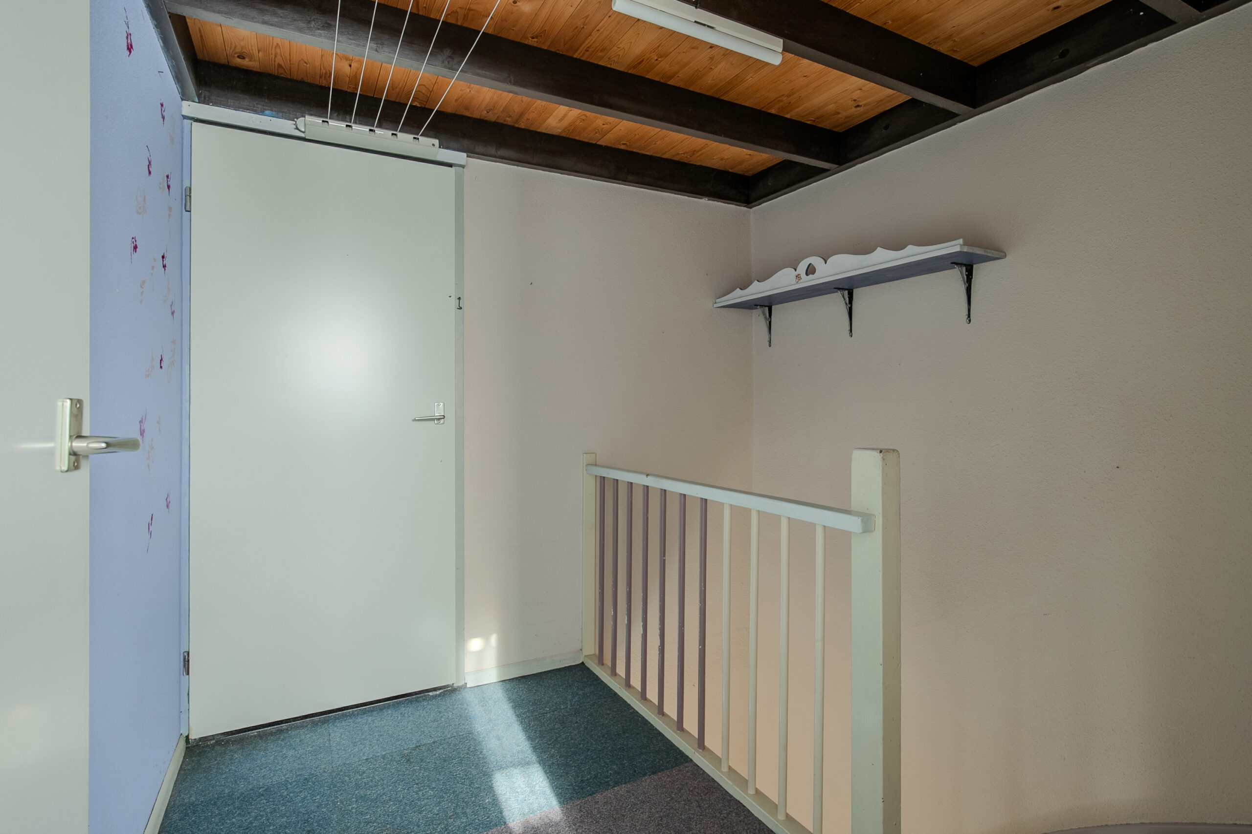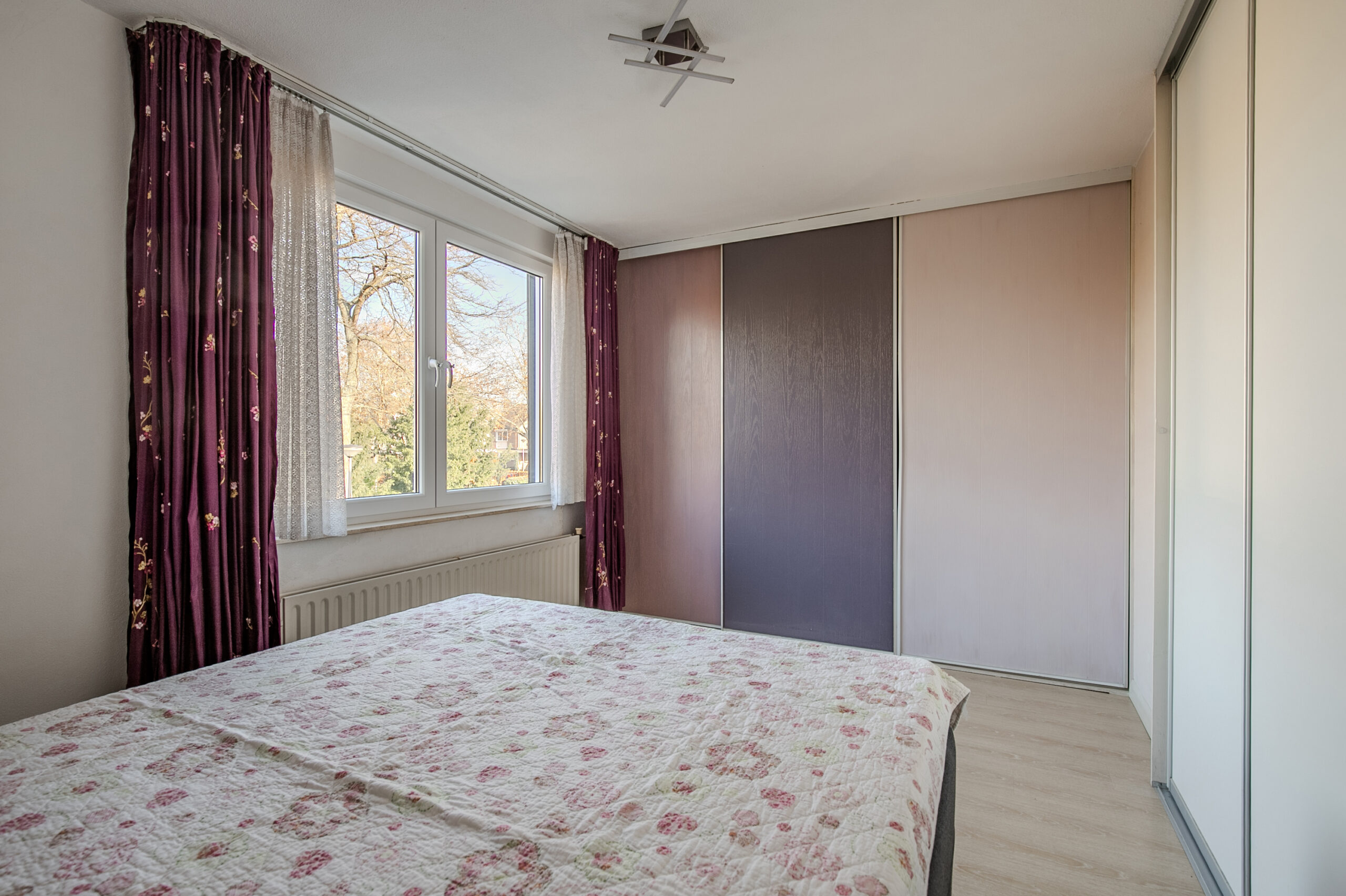 Overloop vanuit waar drie slaapkamers en de badkamer te bereiken zijn. De slaapkamers zijn respectievelijk ca. 13m2, 10m2 en 9m2 groot. De grootste slaapkamer is voorzien van een inbouw kledingkast. De slaapkamers aan de tuinzijde hebben beide toegang tot het dakterras (ca. 19m2). De deels betegelde badkamer is voorzien van een ligbad, toilet en wastafel.