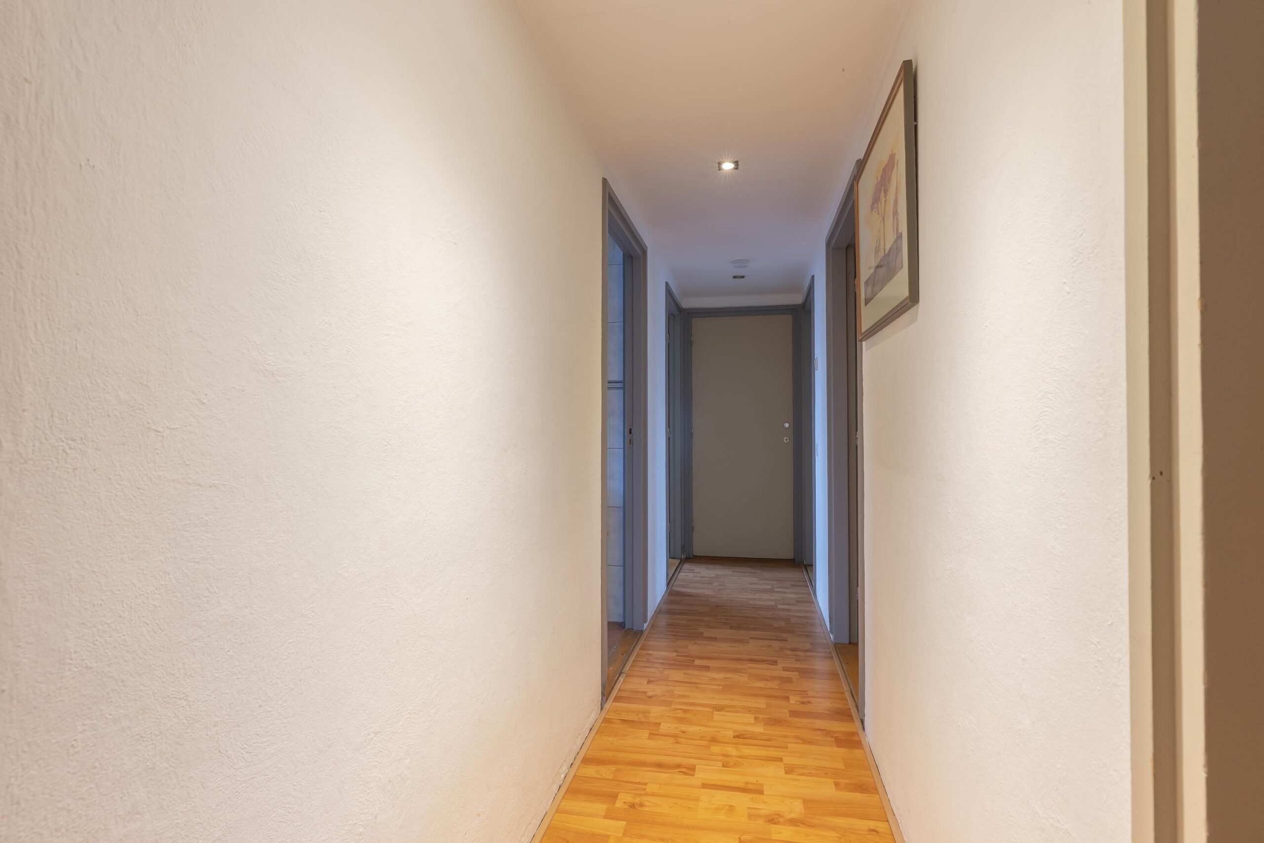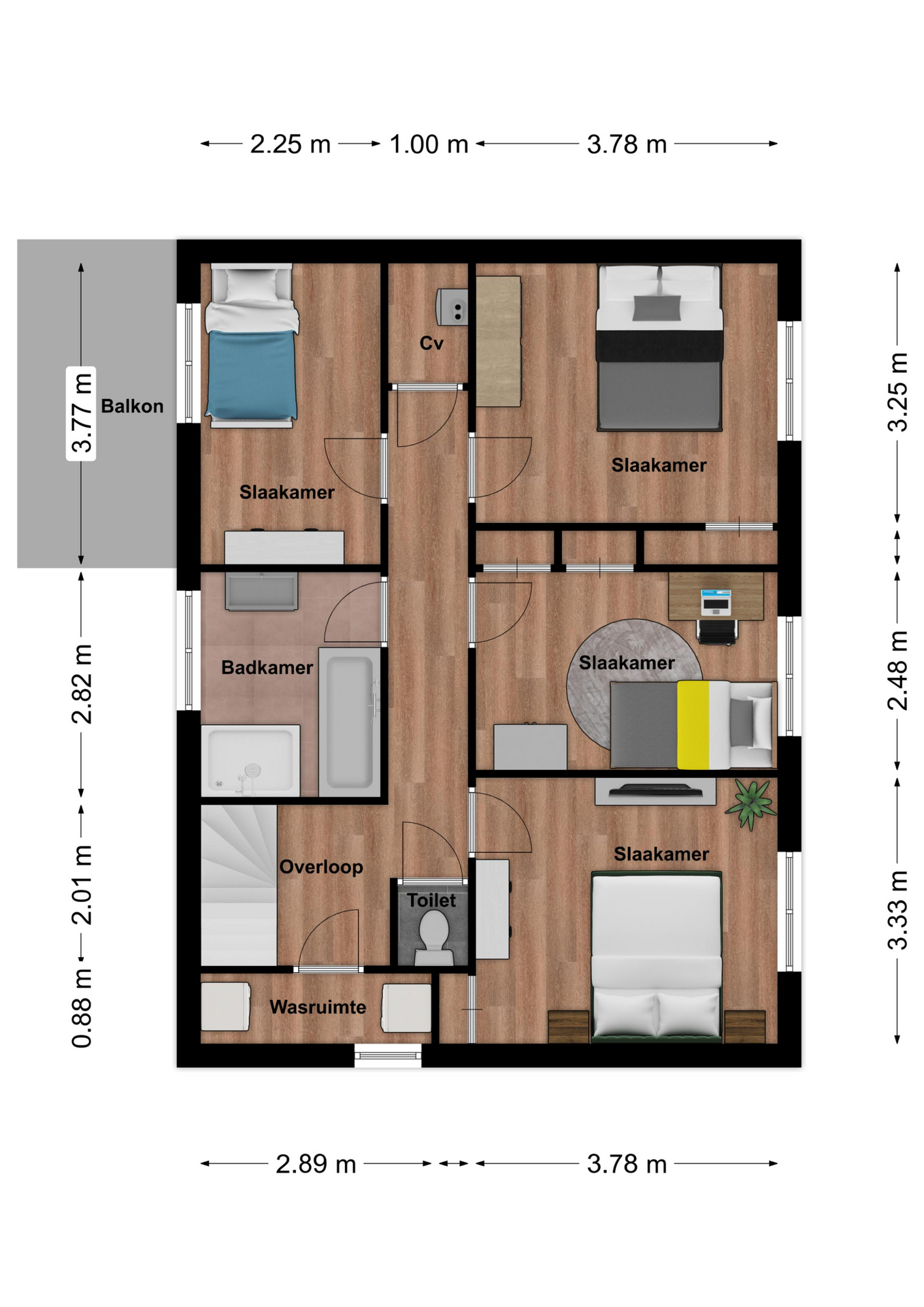 Overloop met toegang tot vier slaapkamers, badkamer en de wasruimte. Op de overloop bevindt zich tevens een separate toiletruimte met toilet. Aan de voorzijde van de woning is een praktische wasruimte gelegen, voorzien van aansluitingen voor wasmachine en droger. Aan het einde van de slaapvleugel bevindt zich een handige bergkast met daarin de Nefit cv-installatie (huur, 2014). De grote slaapkamer aan de voorzijde is voorzien van airconditioning en de slaapkamer aan de achterzijde biedt toegang tot een gedeeld balkon. De ruime, volledig betegelde badkamer is uitgerust met een ligbad, wastafel en douche. Alle slaapkamers en de badkamer zijn voorzien van rolluiken.