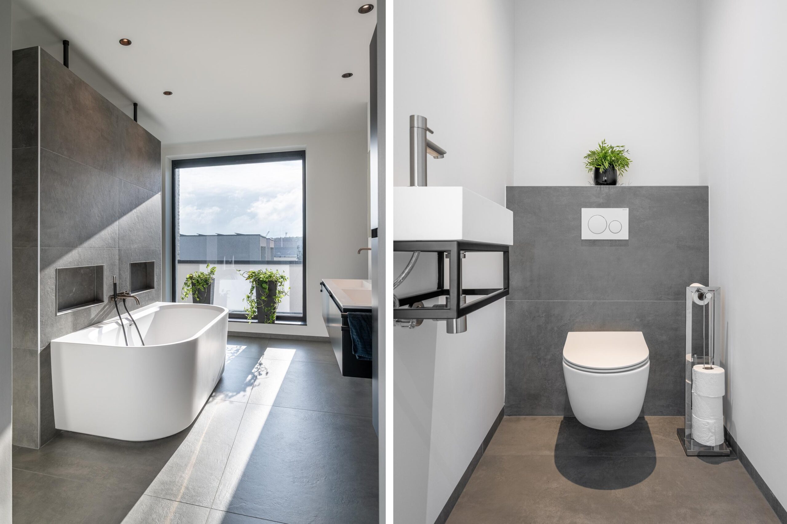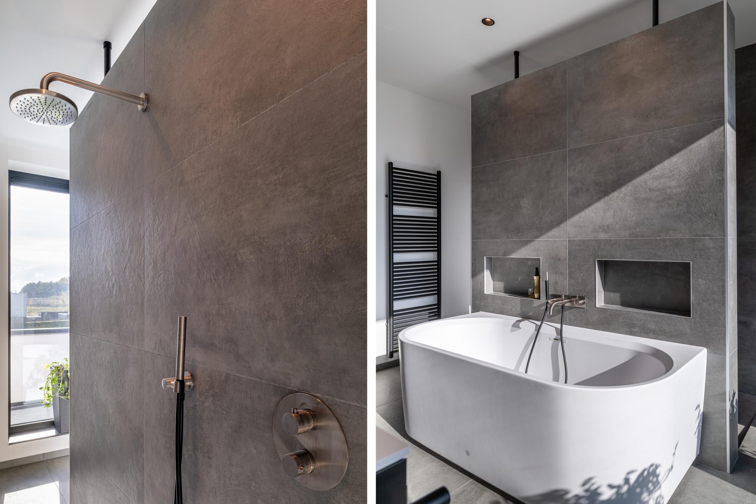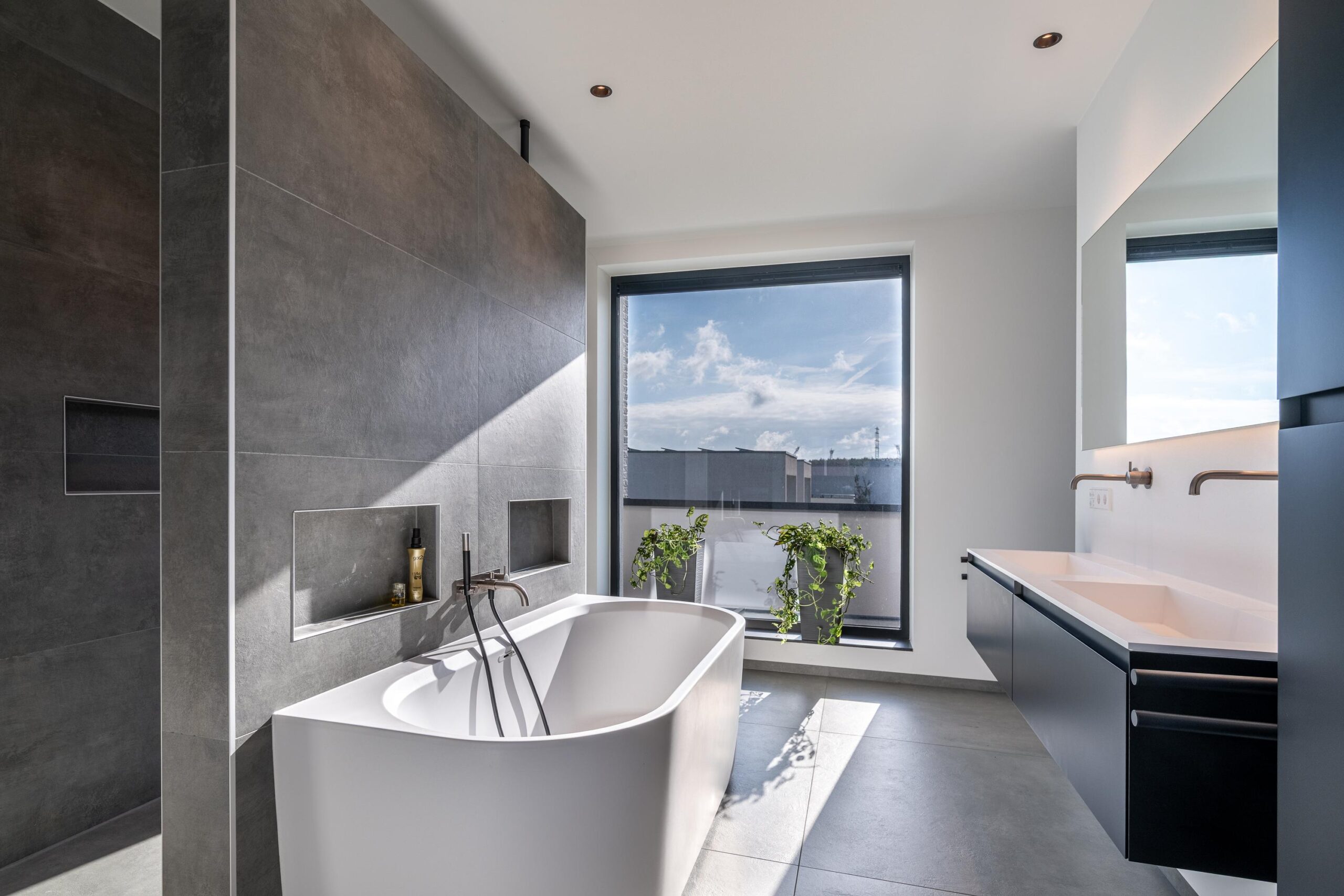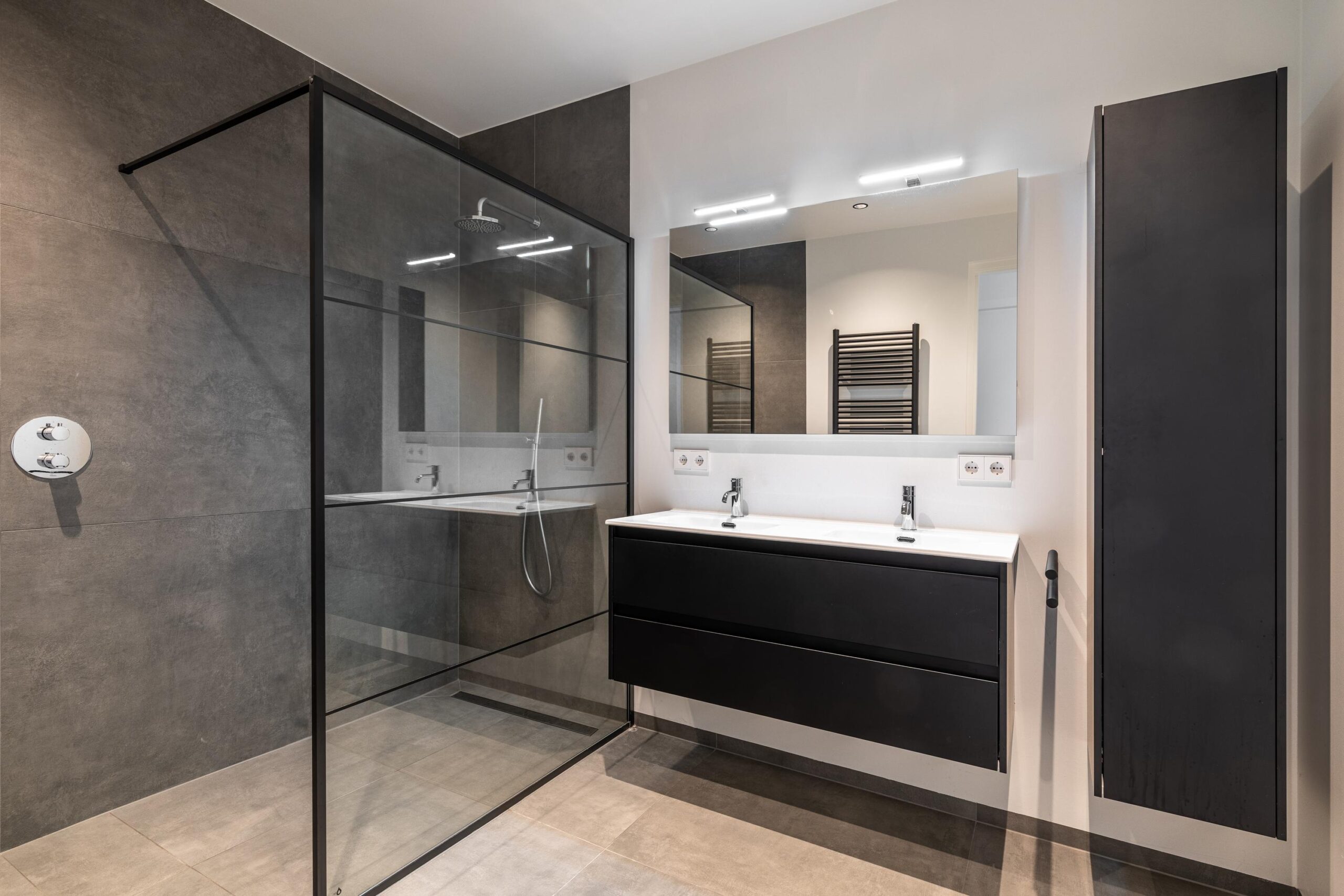 - Badkamervoorzieningen Douche, dubbele wastafel, inloopdouche, vloerverwarming, ligbad, toilet, dubbele wastafel, wastafelmeubel, inloopdouche, vloerverwarming