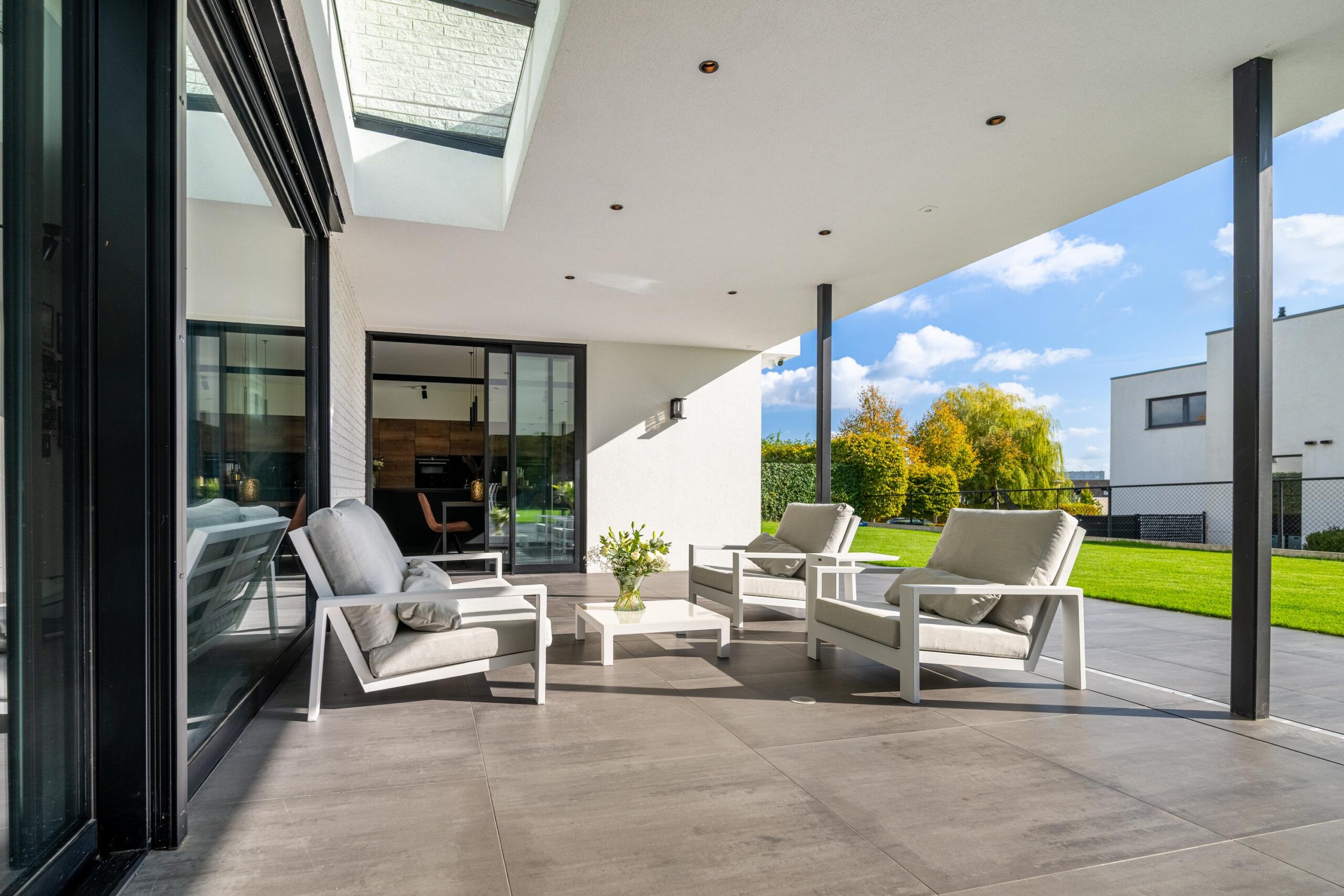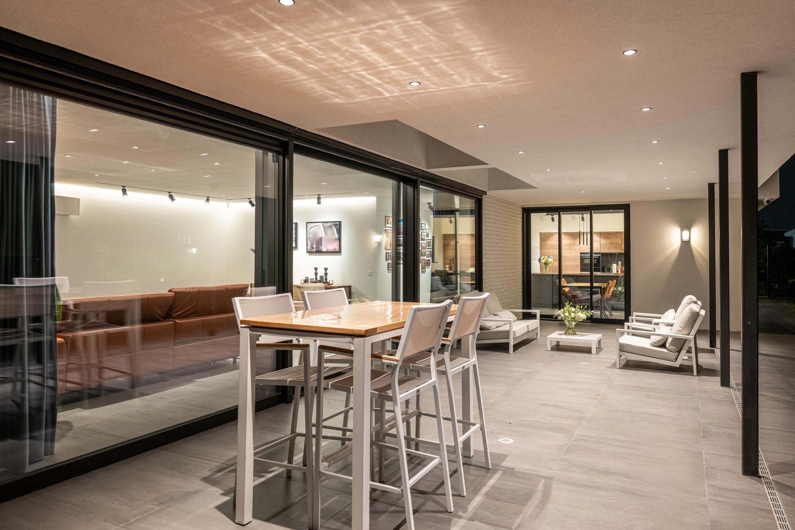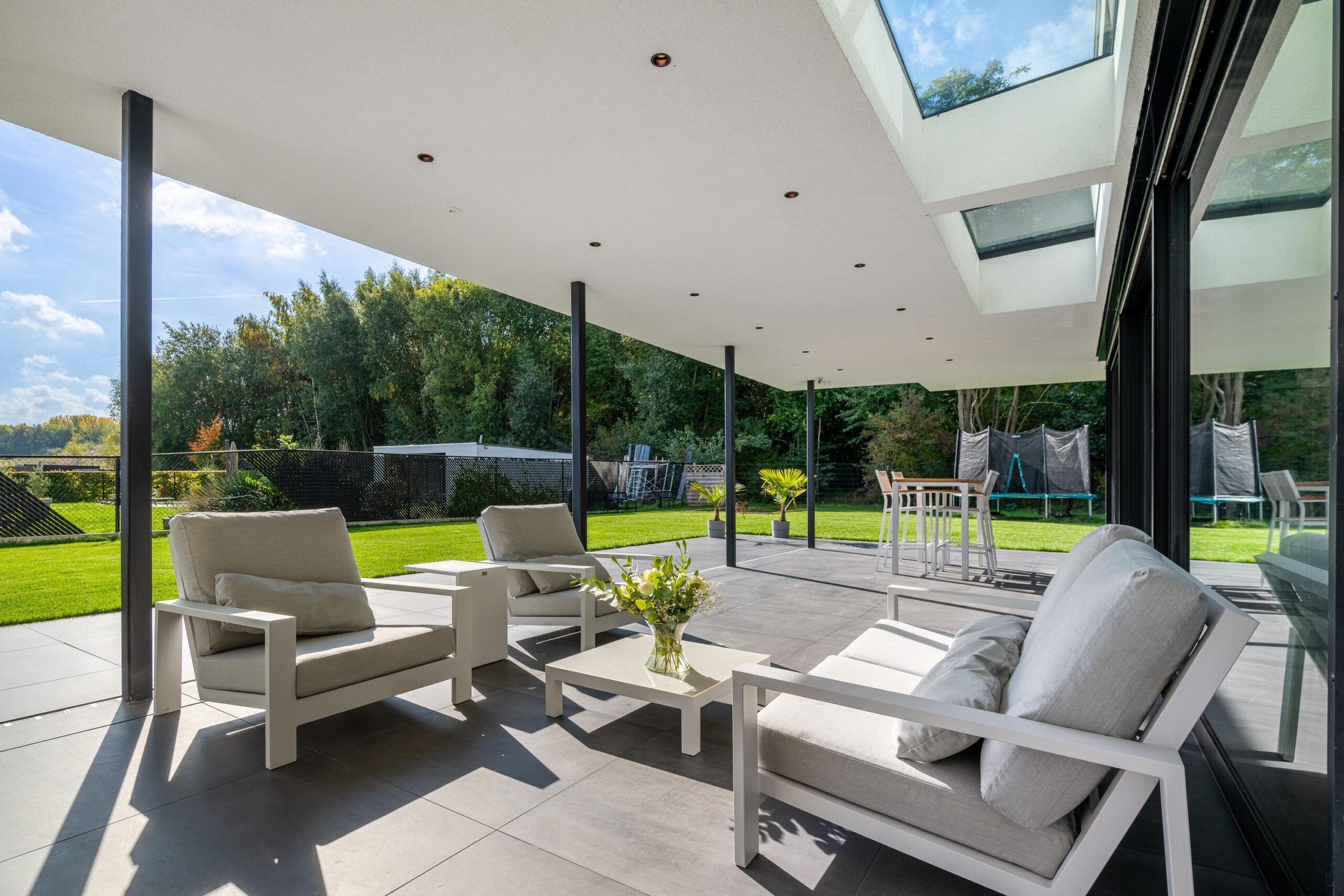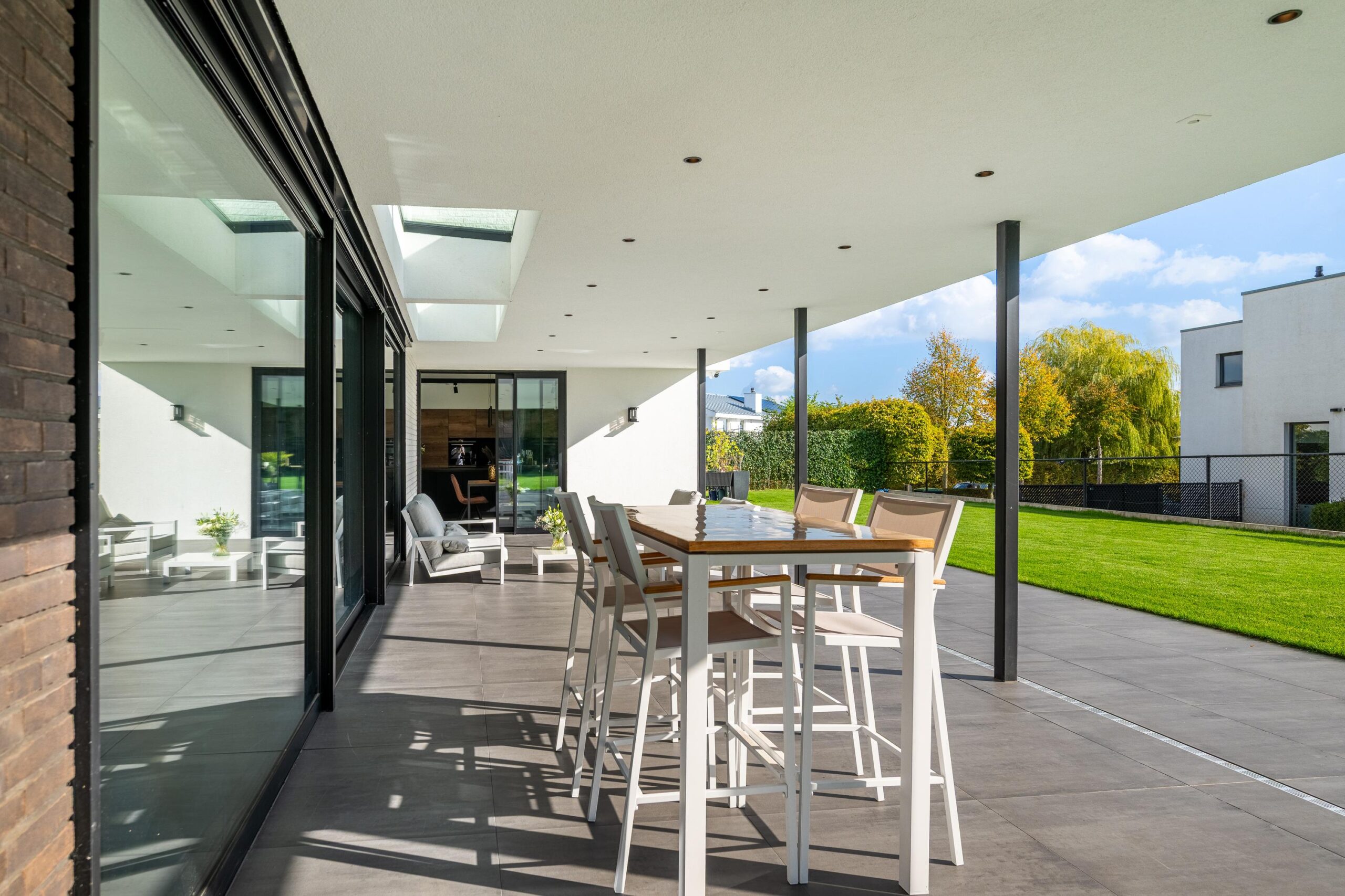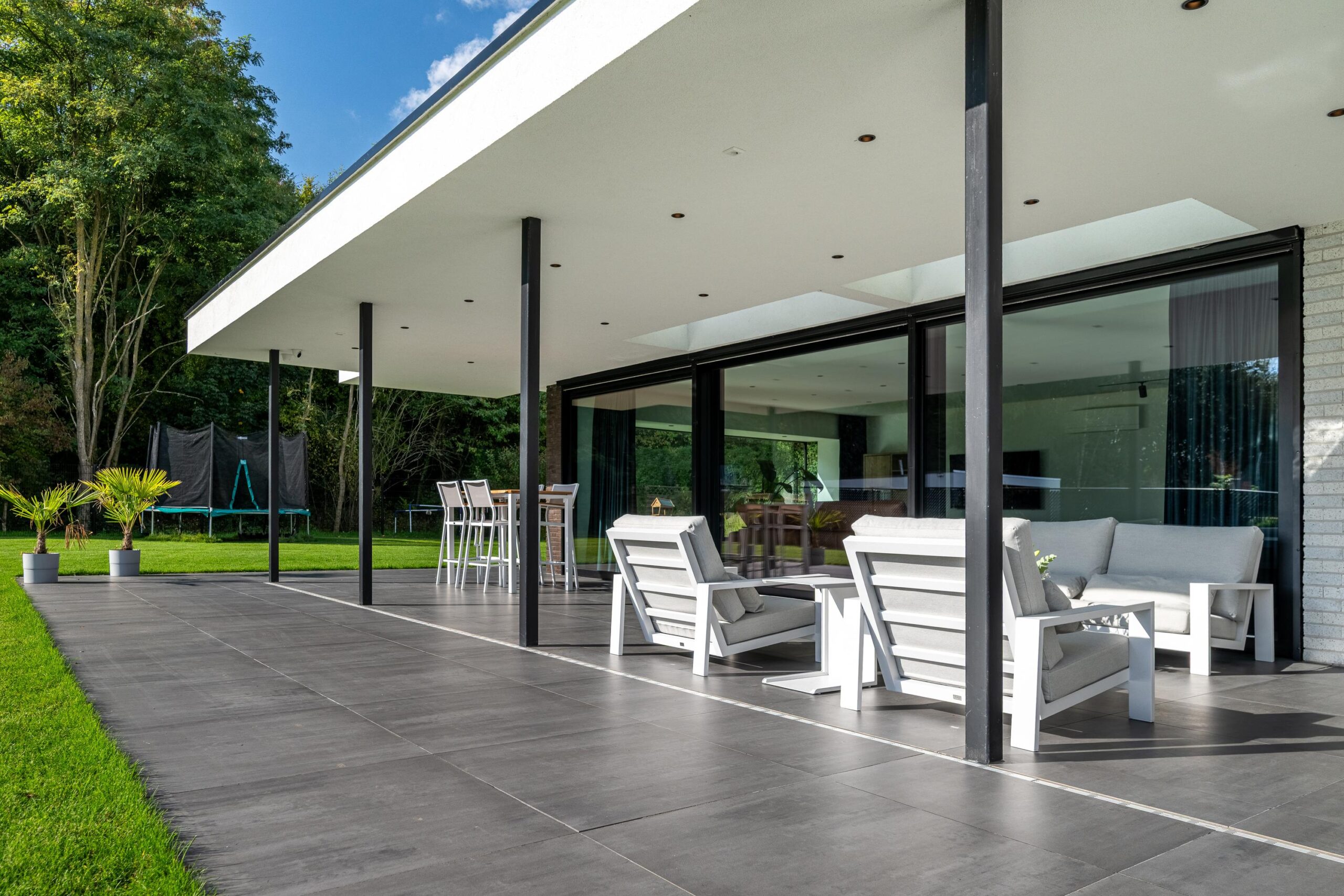 Dankzij de ruime overkapping geniet men hier van schaduw op zonnige dagen en comfortabele beschutting bij minder weer. De inbouwspots in het plafond zorgen ’s avonds voor een warme, uitnodigende sfeer.