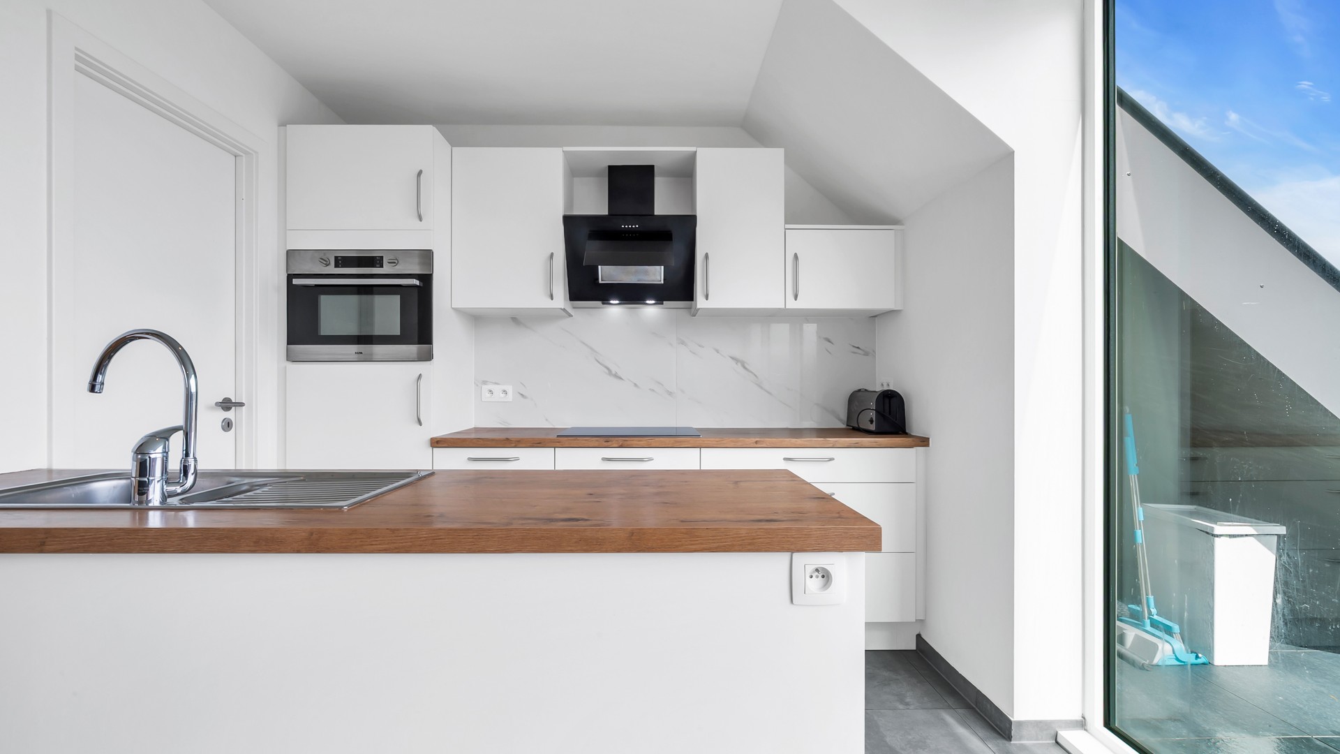 Bij het betreden van het appartement word je meteen verwelkomd in een lichtrijke en ruime leefruimte die naadloos overgaat in de moderne keuken. Deze keuken is zonder twijfel een echte blikvanger: strak vormgegeven, afgewerkt met kwalitatieve materialen en voorzien van alle hedendaagse toestellen. Het centraal geplaatste kookeiland vormt het hart van de ruimte en nodigt uit tot gezellig samenzijn, of het nu gaat om een uitgebreid diner met vrienden of een snelle maaltijd tijdens een drukke dag. De combinatie van functionaliteit en esthetiek maakt deze keuken tot een droom voor elke kookliefhebber.