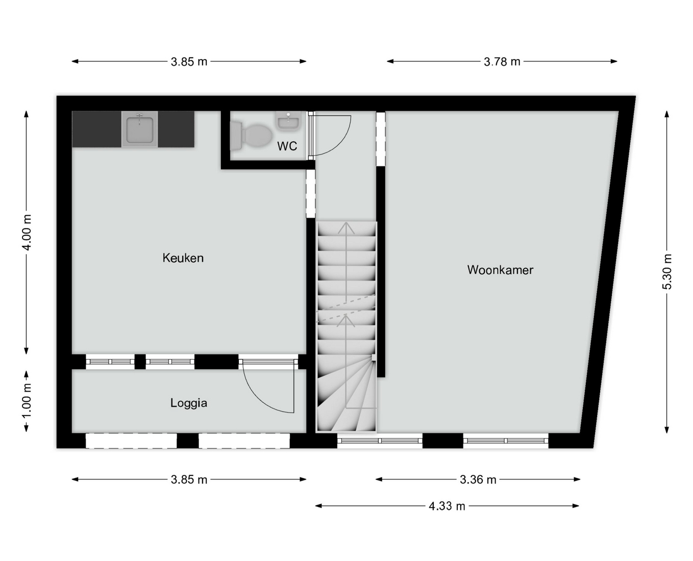Vanuit de (toekomstige) keuken heb je toegang tot een loggia, waar je bij een kop koffie of een glas wijn kunt genieten van het uitzicht op de gezellige straat beneden. Hier kun je de dag rustig beginnen of ontspannen na een drukke werkdag.