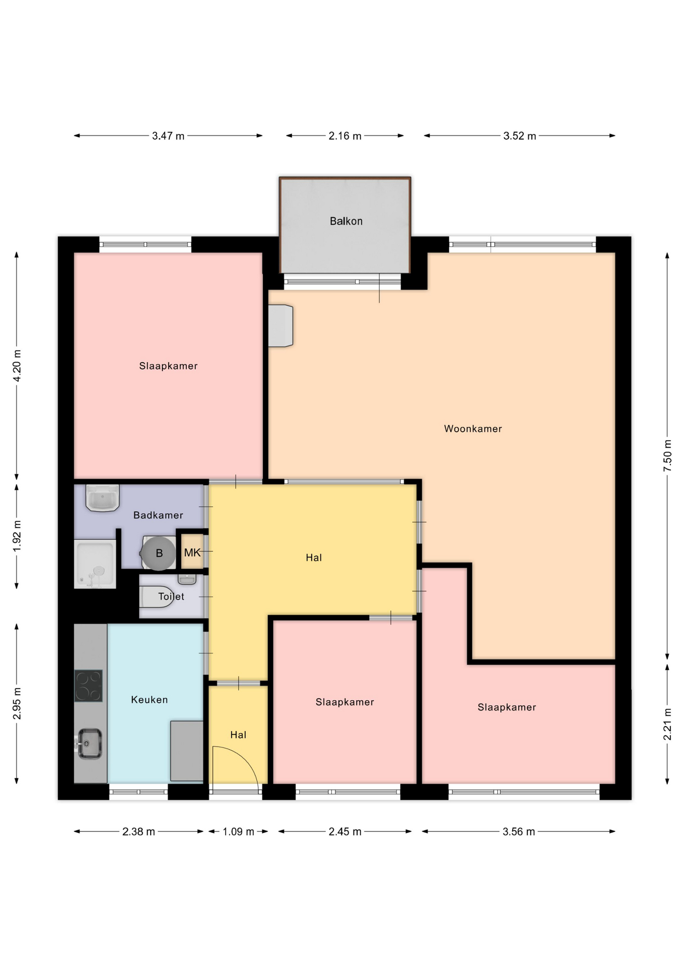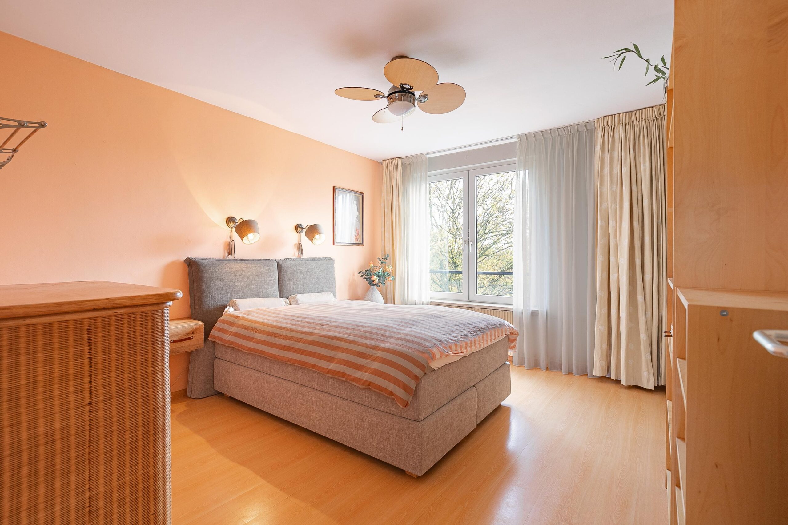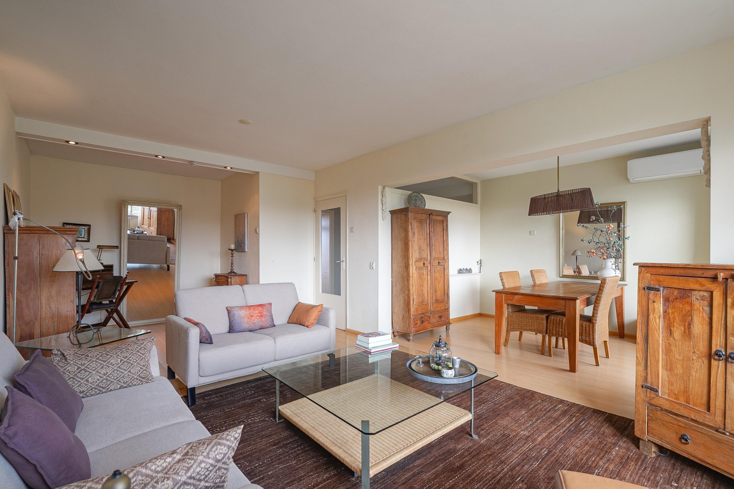Entrance/hallway with access to all rooms. The kitchen at the front (approx. 7m²) has cupboards on both sides and the following built-in appliances: four-zone induction hob, dishwasher, refrigerator, oven, sink, and extractor fan. The sink, hob, countertop, dishwasher, and refrigerator were replaced approximately three years ago. Separate toilet with a standing toilet and washbasin. The bathroom (approx. 3.6m²) was largely renovated in 2022 and is equipped with a shower, sink, boiler (rental) and washing machine connections. At the rear is a spacious bedroom (approx. 14.5m²) with an electrically operated roller shutter. Spacious living room (approx. 35m²) with air conditioning located at the rear of the apartment with lots of natural light, a warm atmosphere, and access to the balcony. The balcony (approx. 4m²) is located on the southeast and equipped with an awning. At the front of the apartment are two more bedrooms (approx. 9.5 and 8m²).