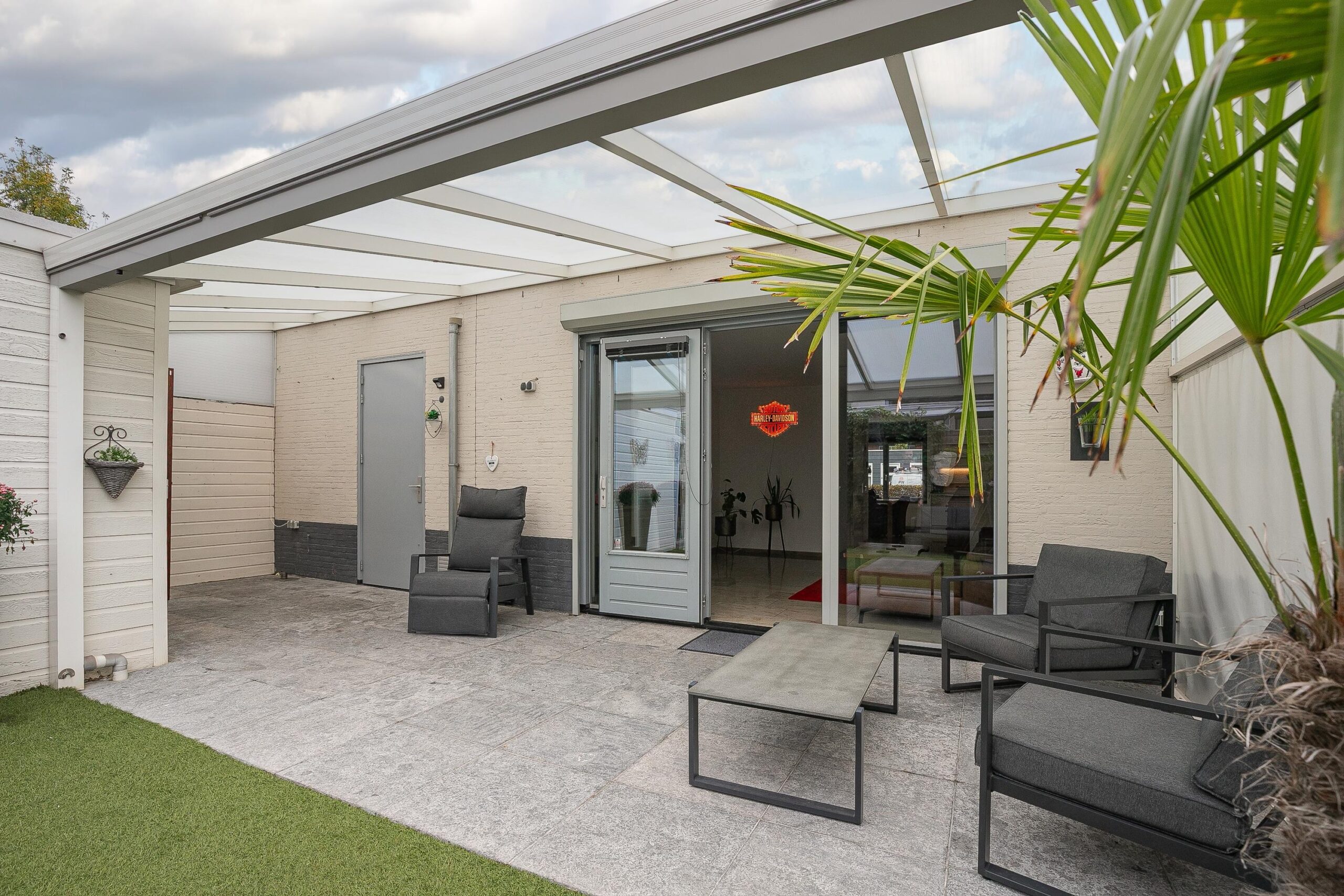 Deze nette achtertuin, gelegen op het zuidwesten, is direct bereikbaar vanuit de woonkamer en de garage. De garage is voorzien van een elektrische poort, elektra en water, waardoor het een praktische plek is voor parkeren, klussen of opslag; momenteel bevinden zich hier ook de wasmachine en droger. In de tuin kunt u heerlijk van de zon genieten onder de sfeervolle overkapping of op het gezellige terras, terwijl het groene gazon voor een frisse uitstraling zorgt. Daarnaast is er een vrijstaand houten tuinhuis met elektra, ideaal als werk- of hobbyruimte. Via het tuinhuis is bovendien toegang tot een kelder, die extra bergruimte biedt.
