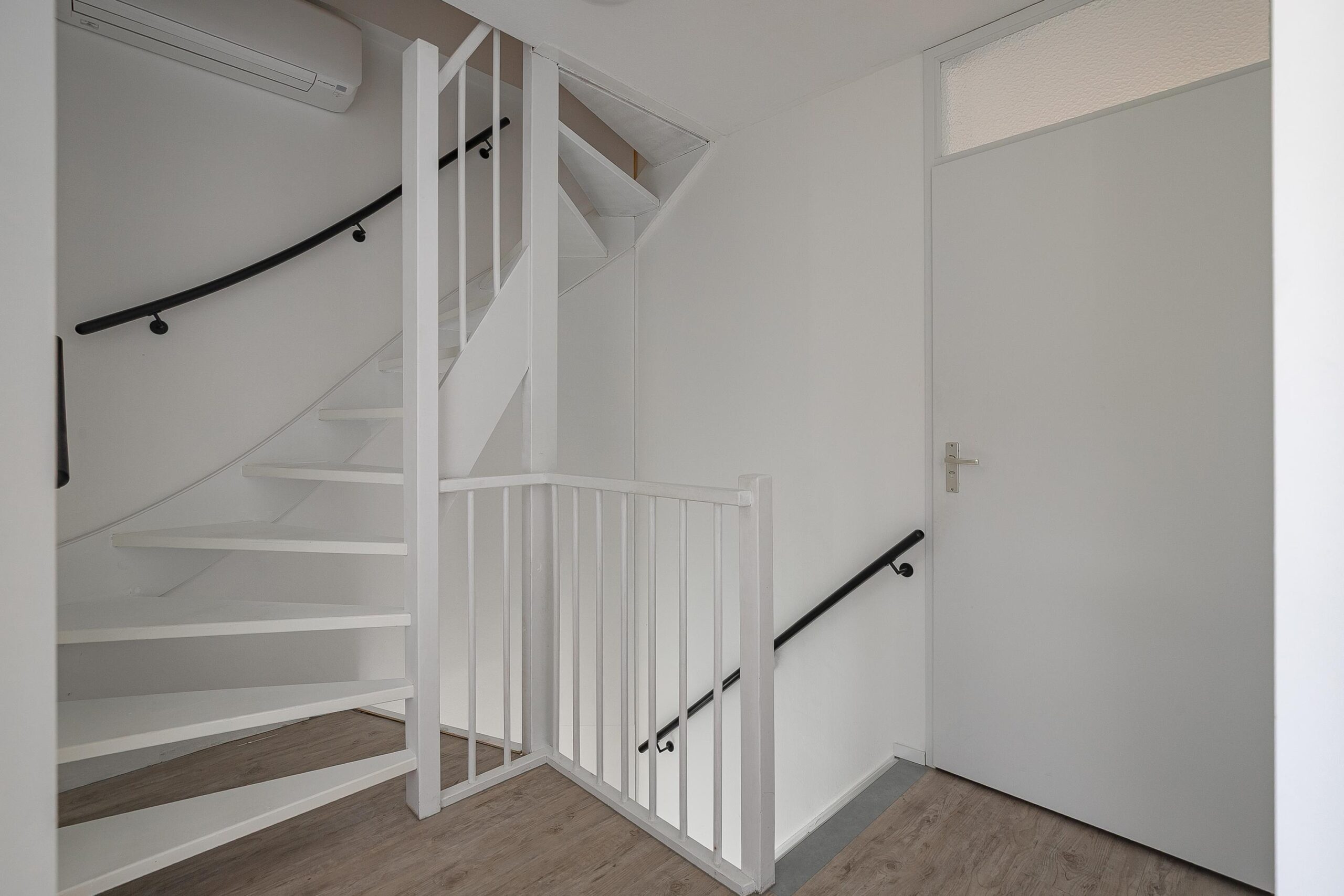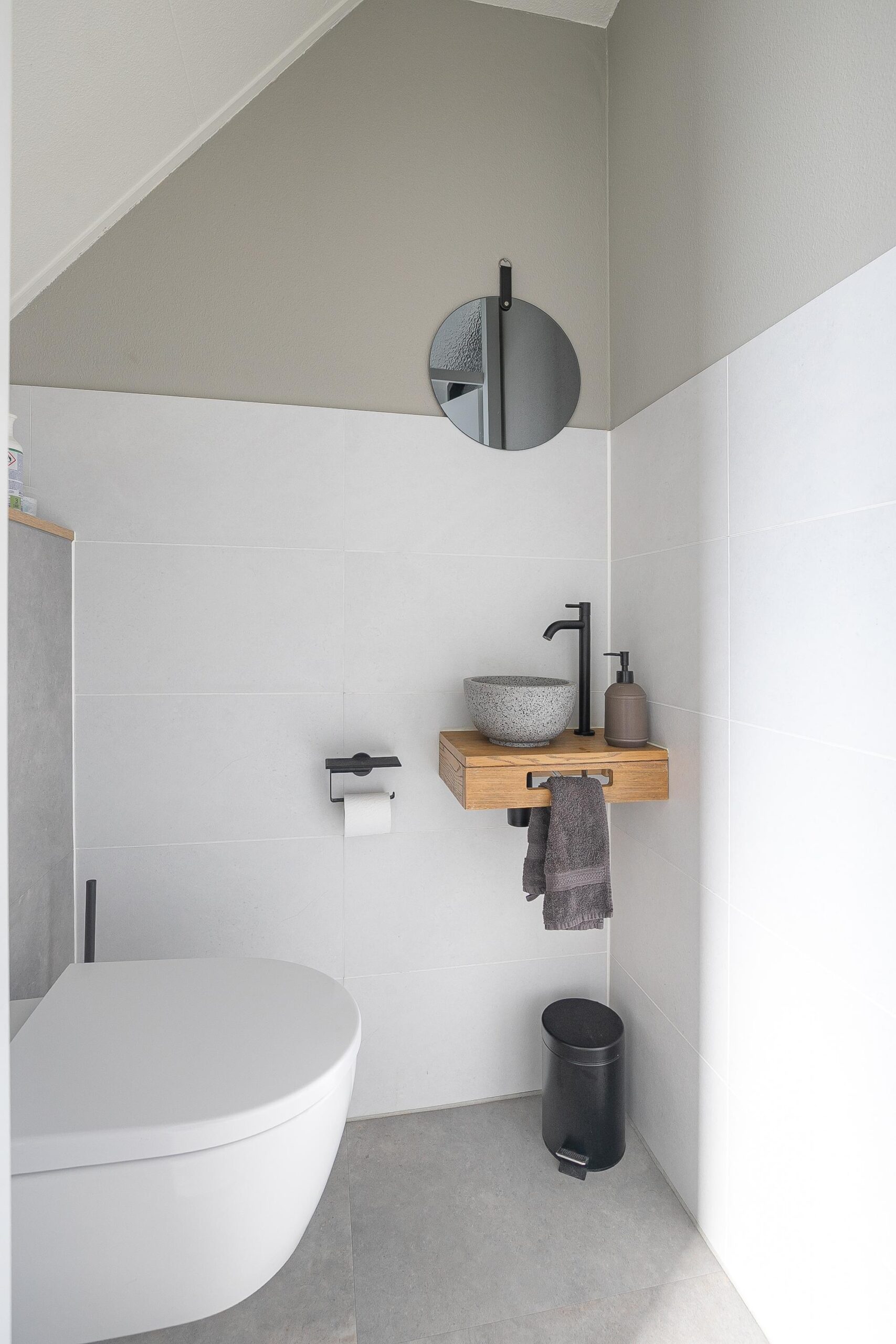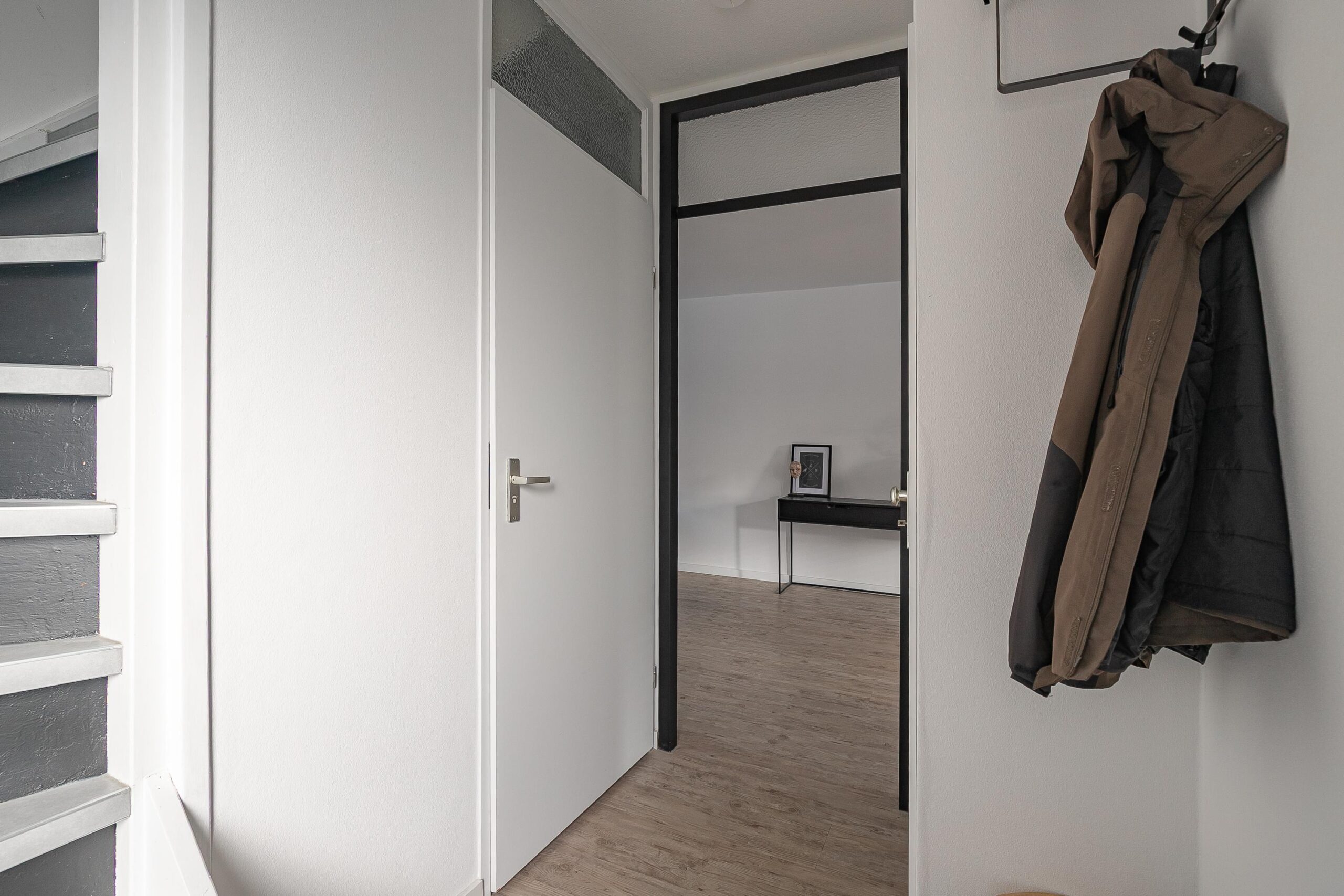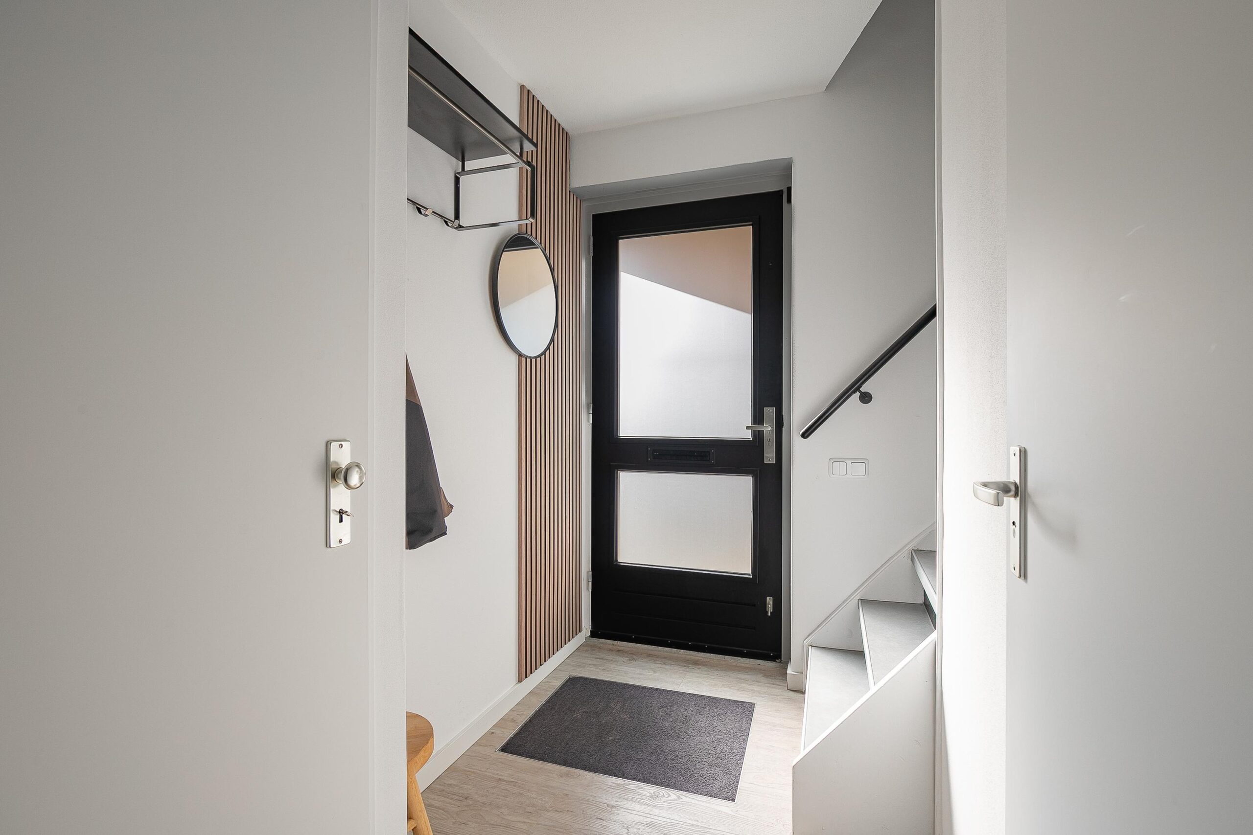 Overdekte entree. Hal met vernieuwde meterkast, garderobe en vernieuwde toiletruimte met zwevend toilet, elektrische afzuiging en fontein.