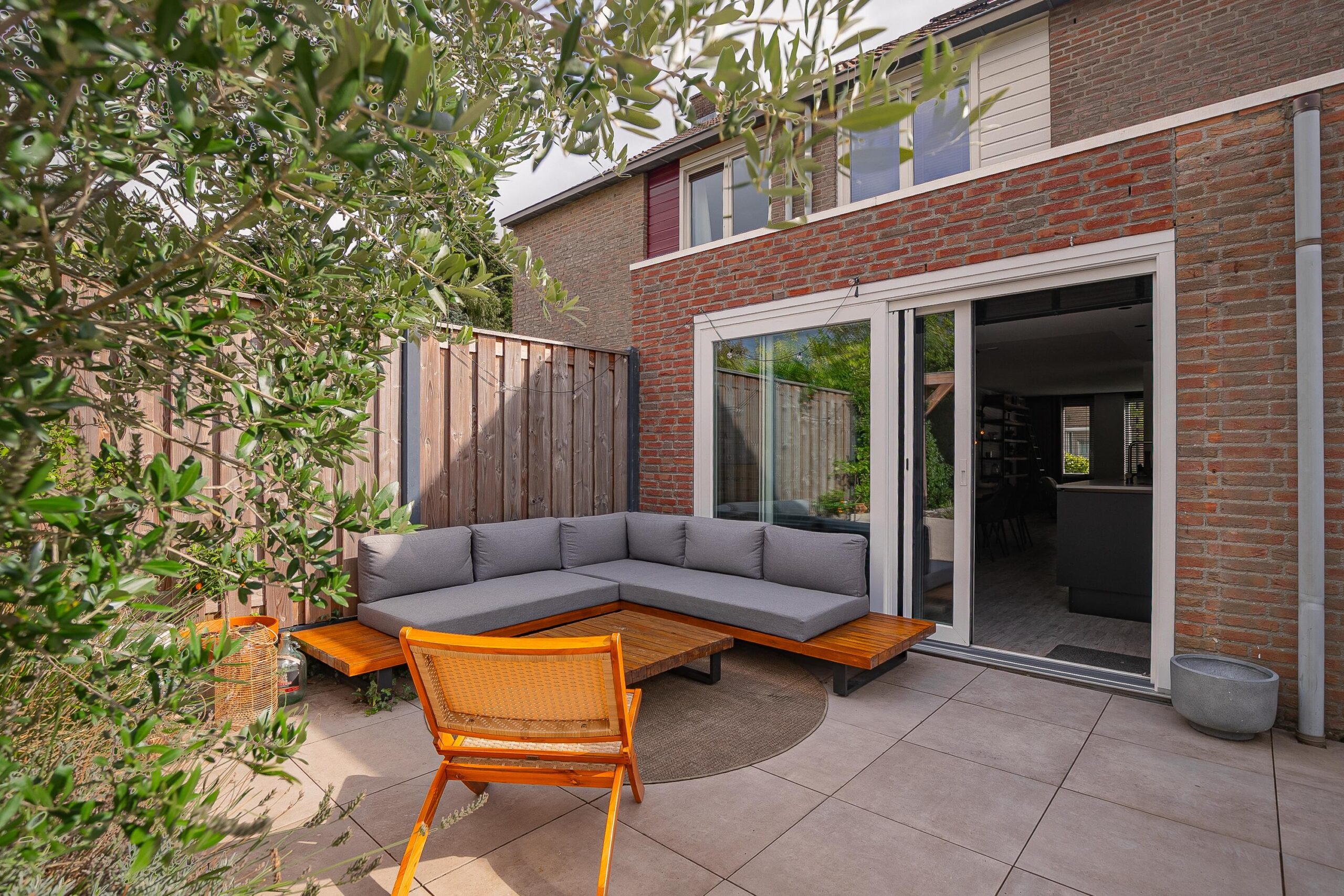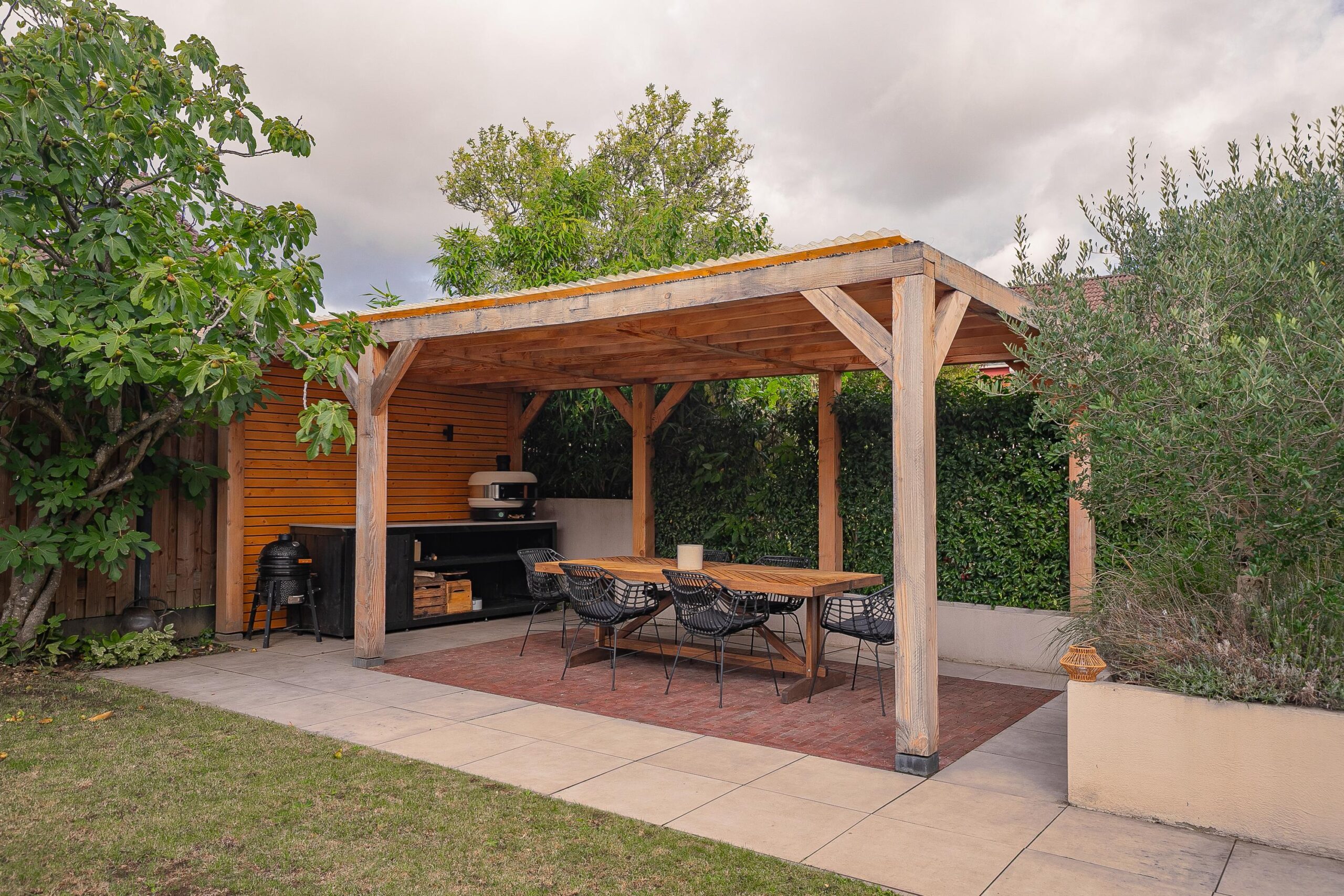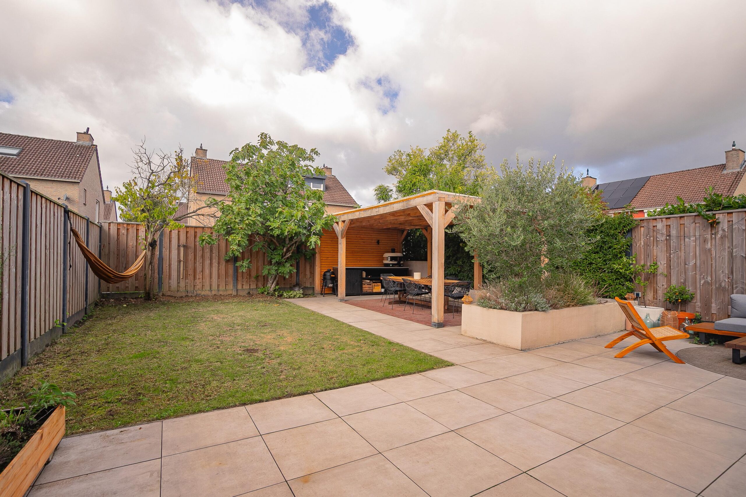 Terras met pergola, keramische tegels, goed omheind en voldoende privacy.