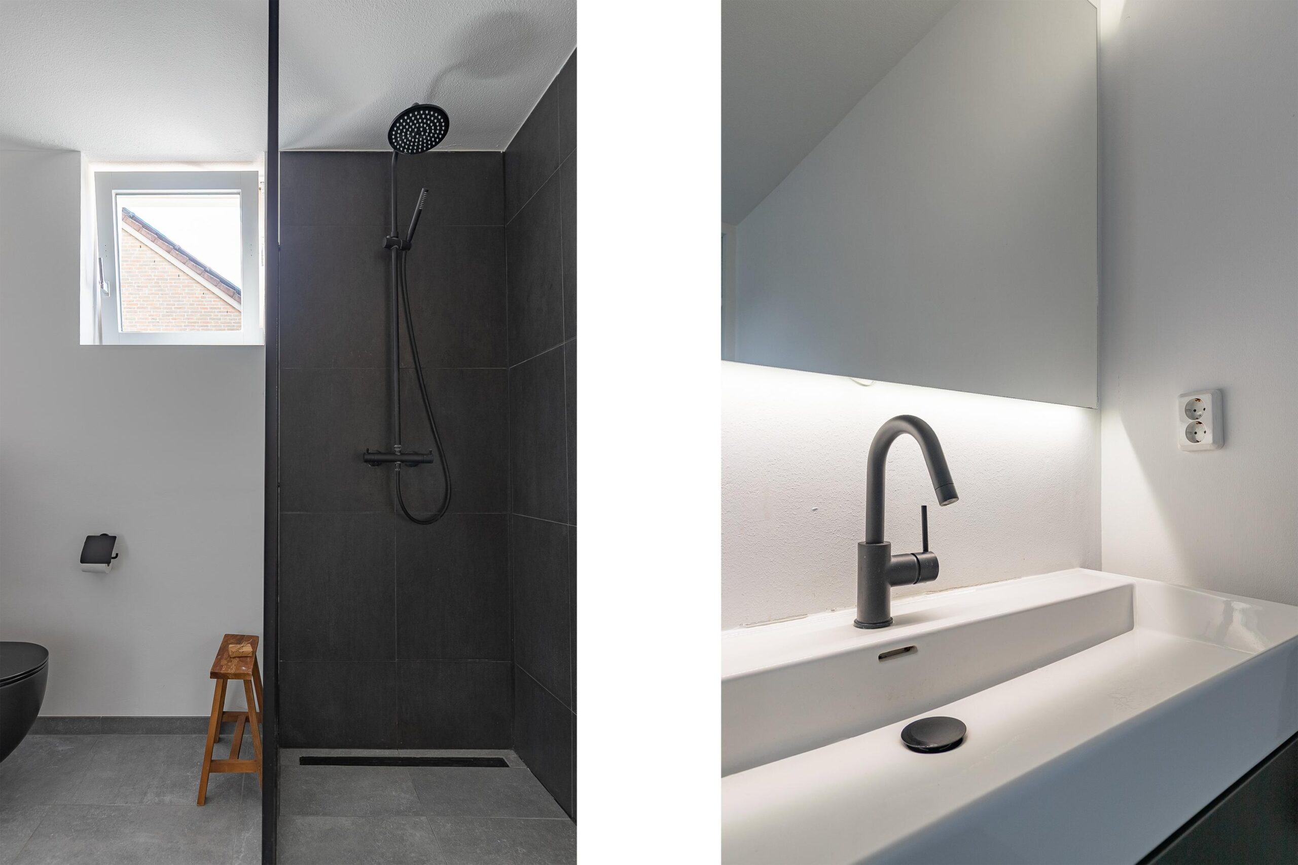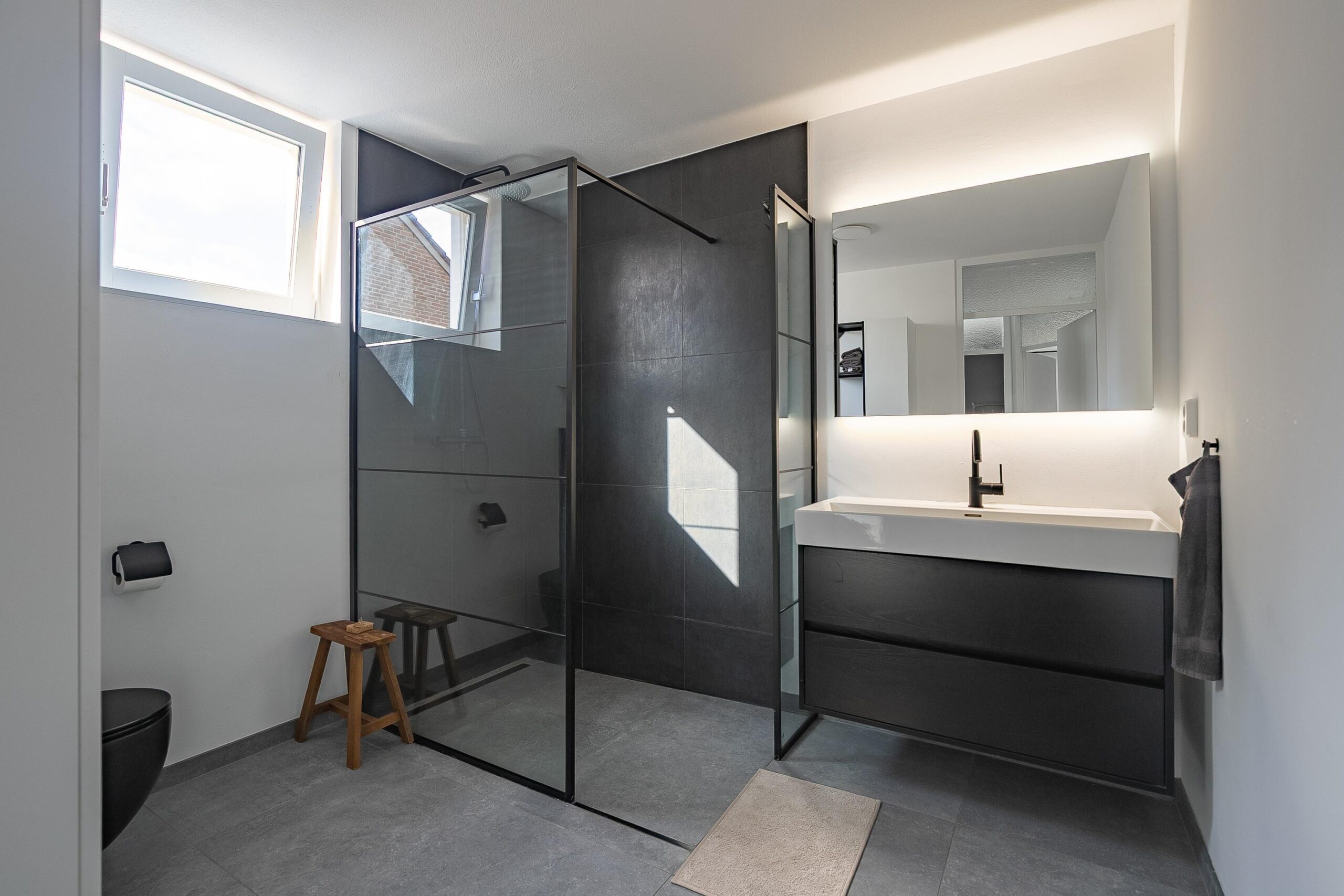 Ultra moderne badkamer voorzien van badmeubel met dubbele wastafel, 2e zwevend toilet, inloopdouche met thermosstaatkraan en elektrische vloerverwarming.
