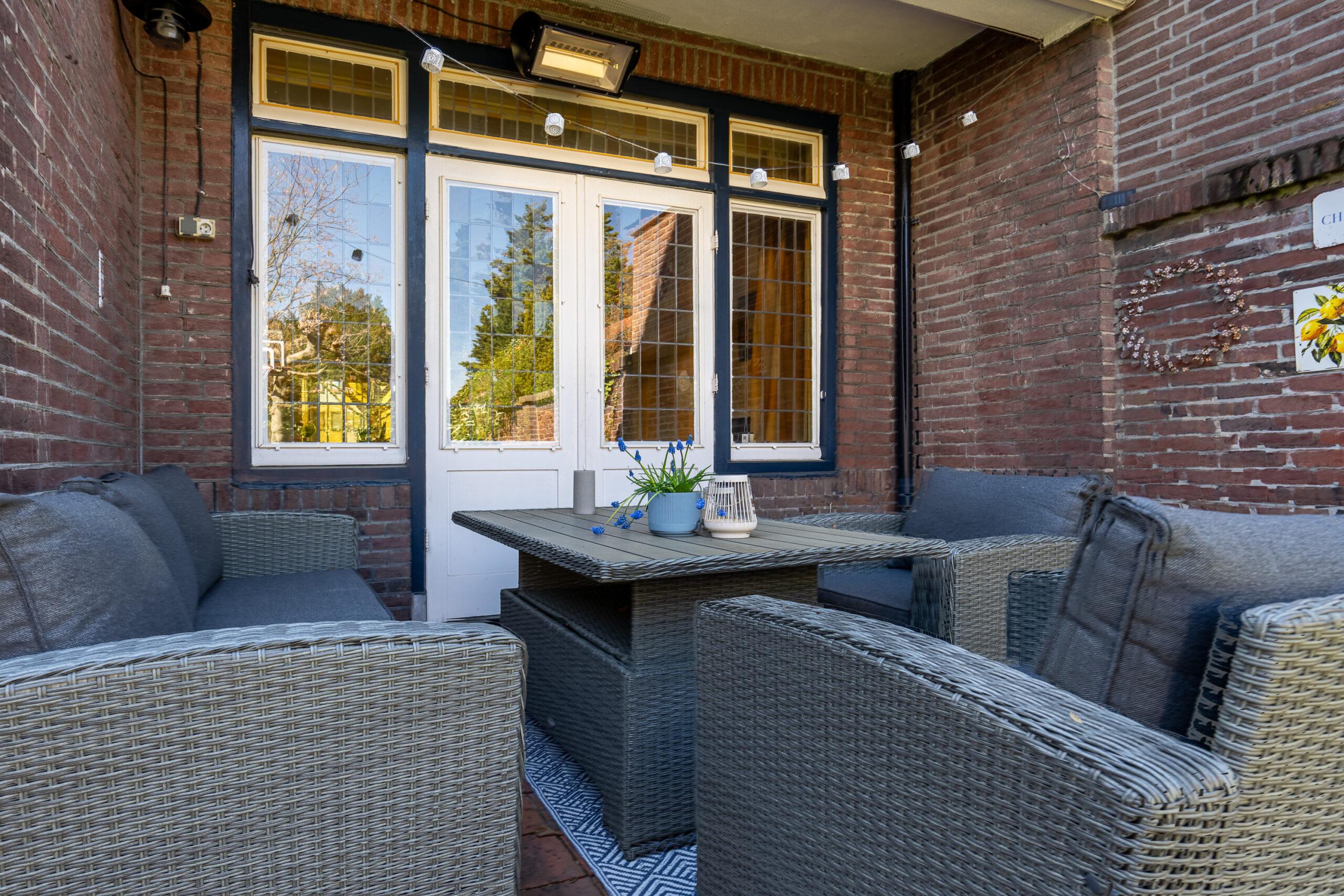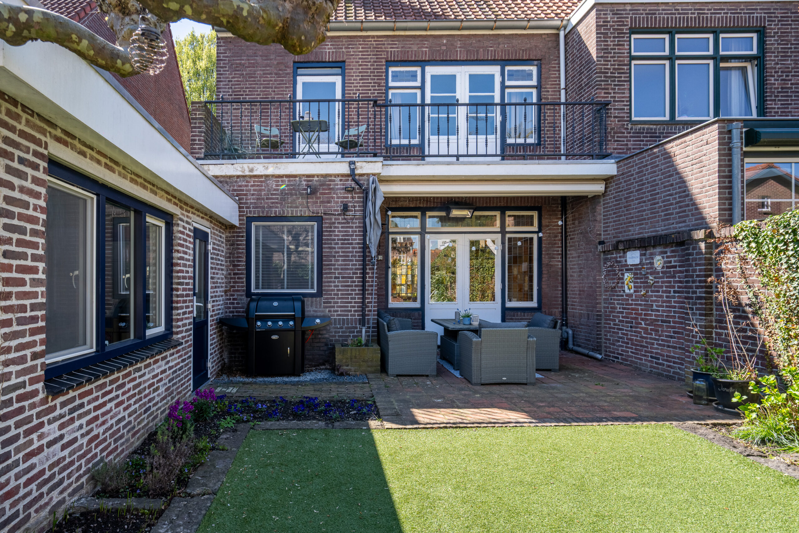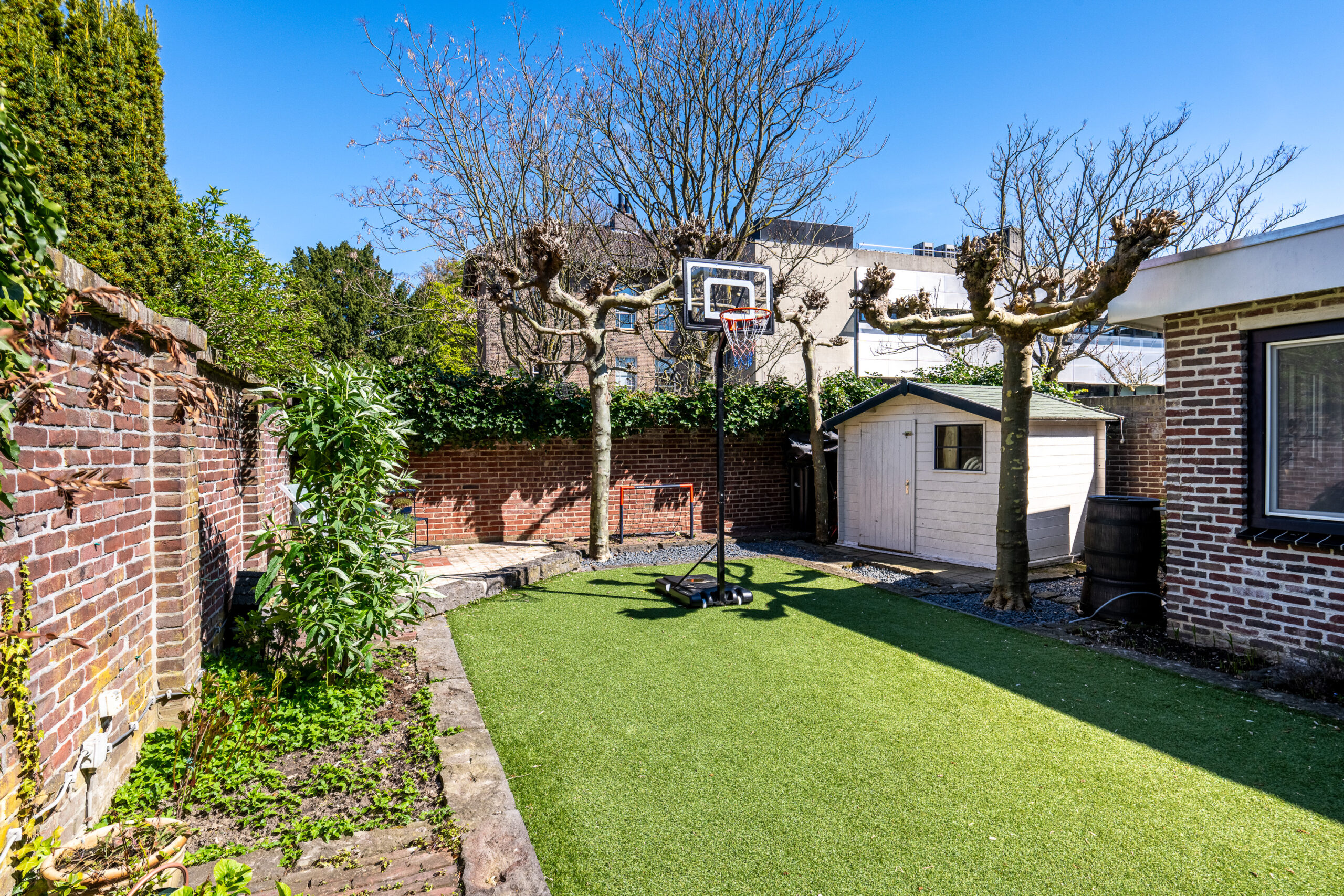 Middels de authentieke openslaande deuren met glas-in-lood elementen betreedt men de fraaie achtertuin vanuit de woonkamer. Tevens is er een toegangsmogelijkheid via de hobby/kantoorruimte. Direct grenzend aan de woning ligt een deels (door het balkon) overdekt terras met elektrisch bedienbaar zonnescherm gevolgd door een kunstgrasstrook. Verder zijn er diverse platanen, een extra zonneterras, een houten tuinhuis van ca. 6 m2 en diverse struiken/aanplant voor een groen karakter. De tuin is volledig ommuurd en biedt daarmee veel privacy en veiligheid.